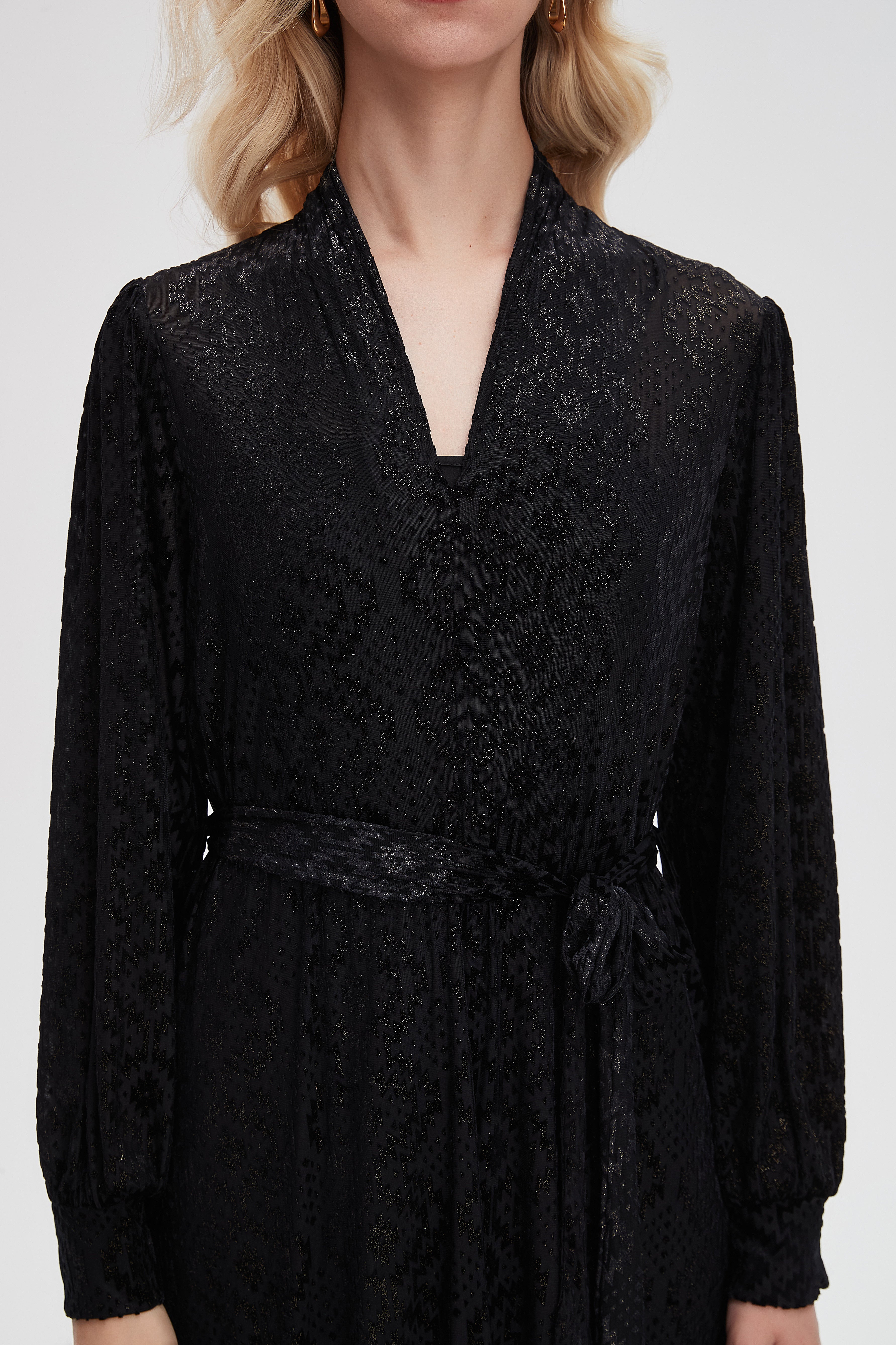 - V-neck and long sleeves create a polished, elegant profile