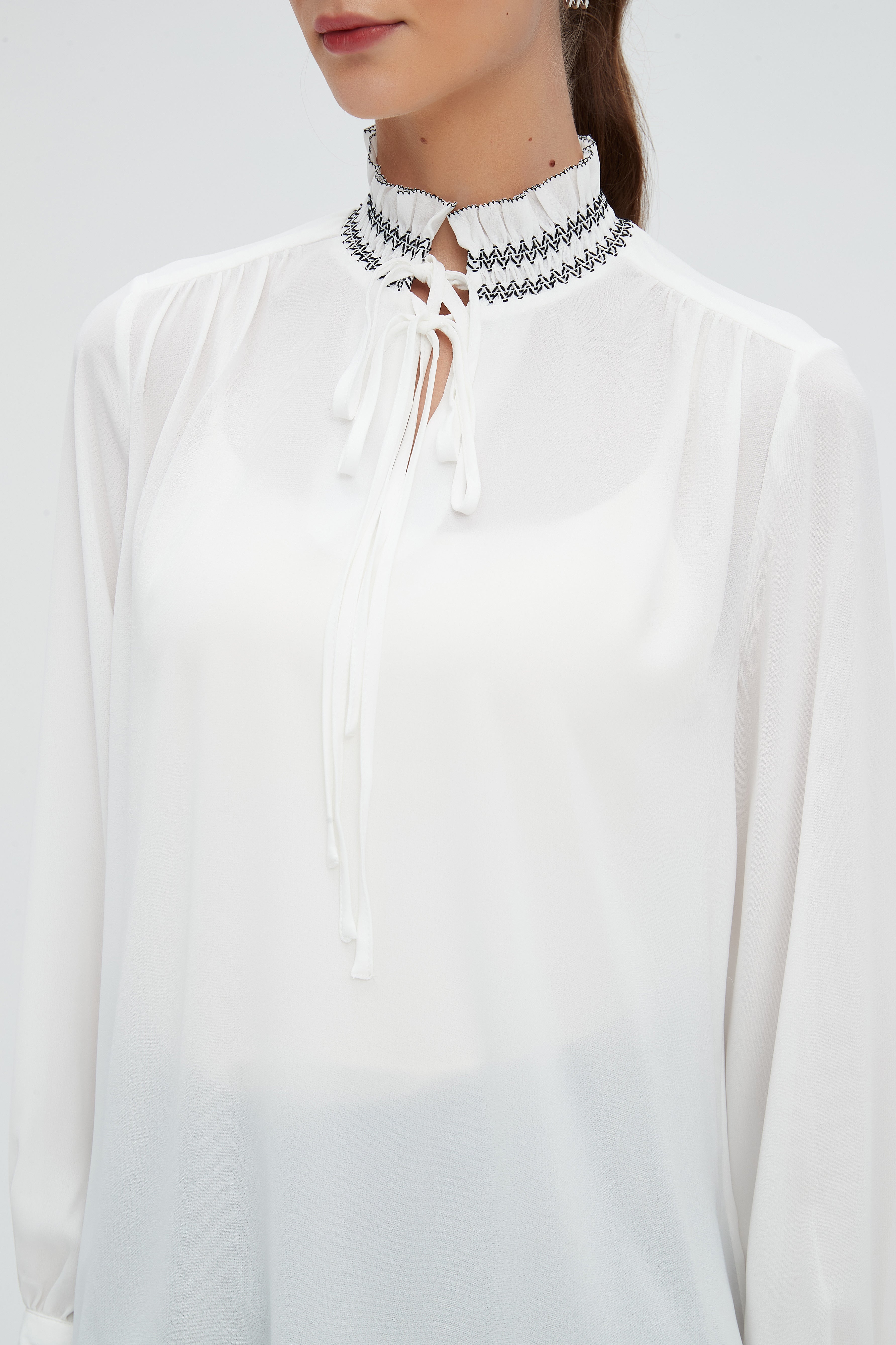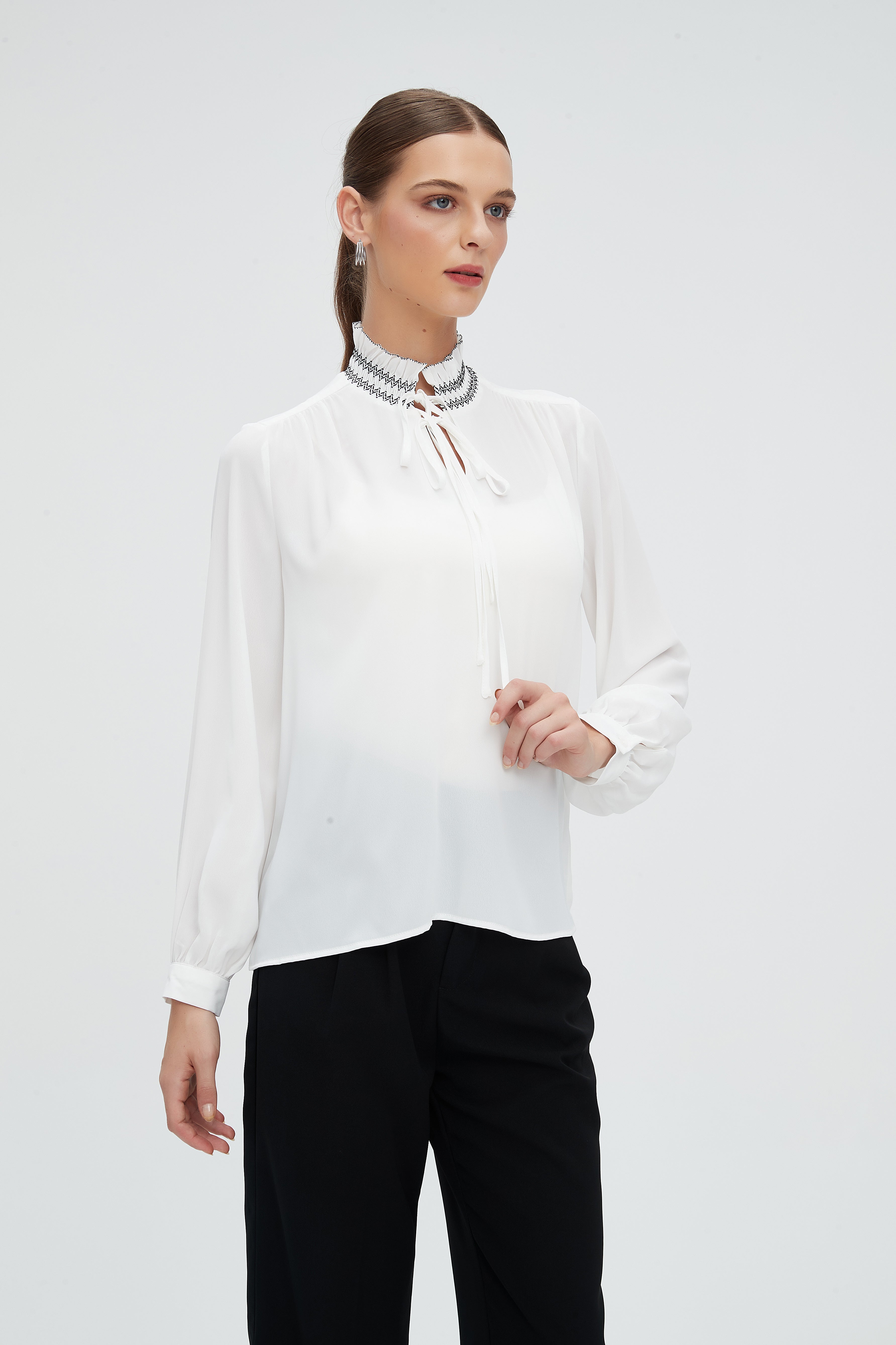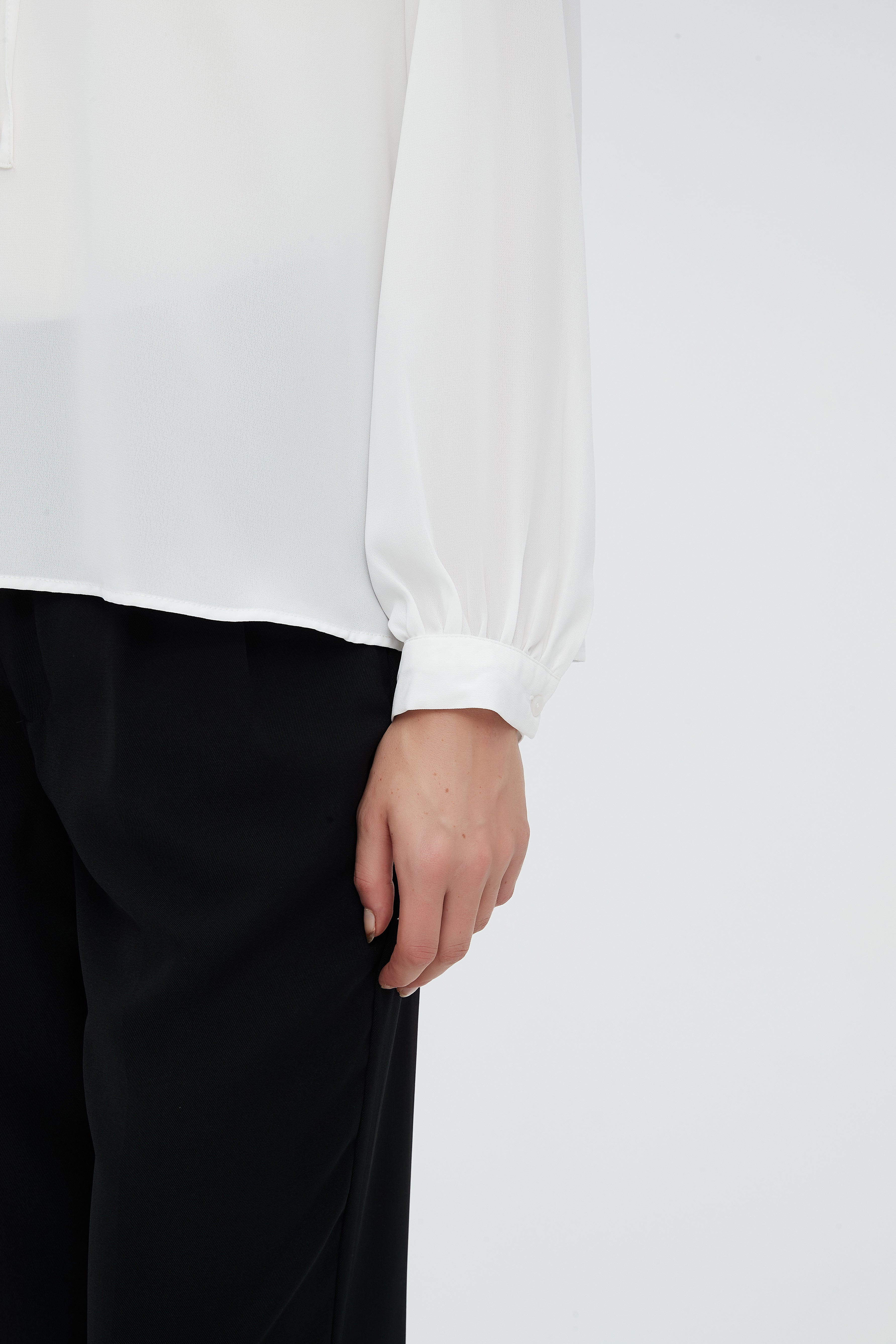Ghusl Nichii Classic is a touch of elegance on your daily look. This long -white blouse comes in a soft off -white color, making it easy to coordinate with various pieces of clothing. Its design is a high collar that guarantees you comfort and elegance at the same time, which makes it ideal for formal or informal occasions. Whether you are at work or in a meeting with friends, you will feel confident and attractive. Do not miss the opportunity to get this distinctive blouse. Visit Saudi Arabia now and ask her to be part of your wardrobe! Product number: LC287025Q306