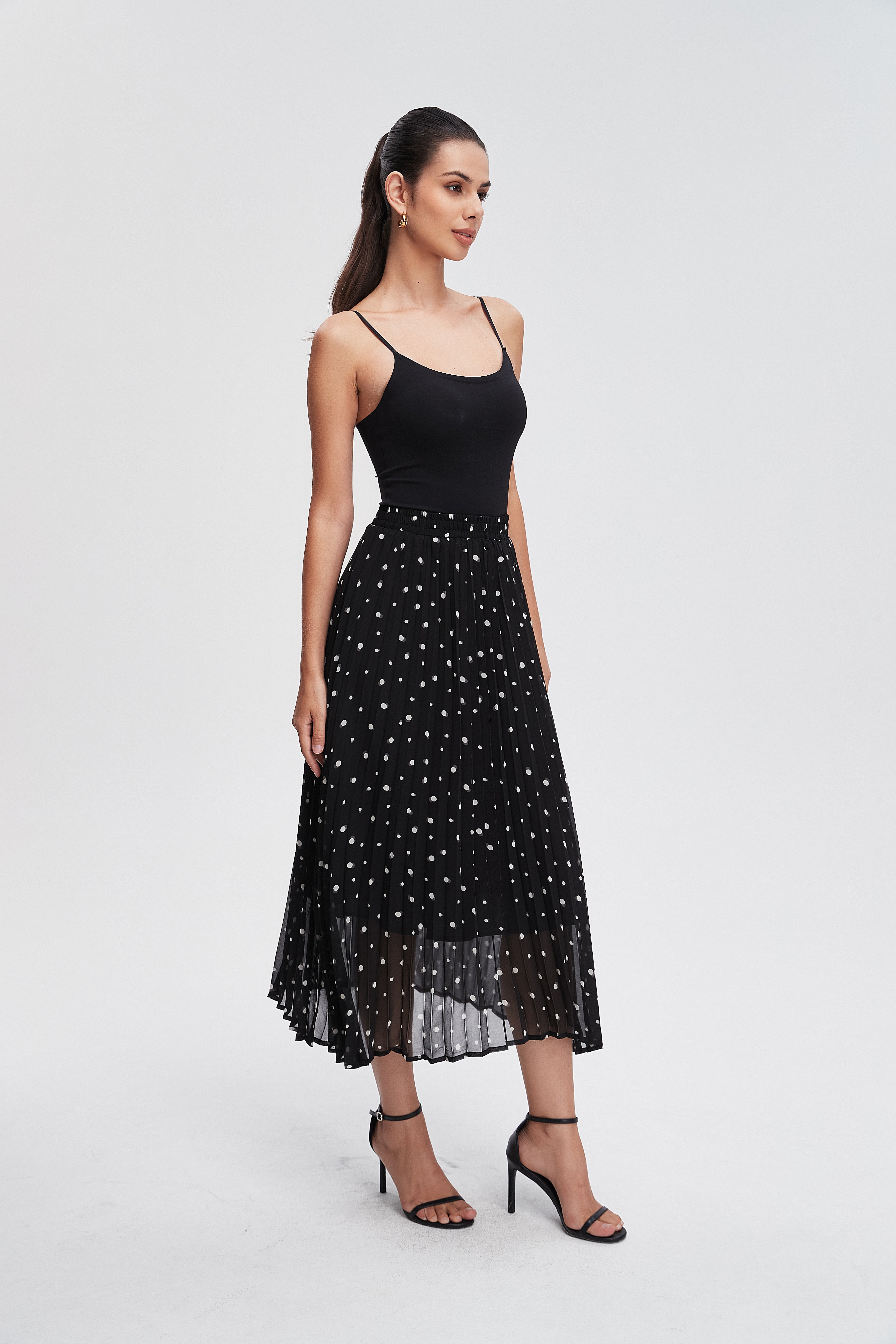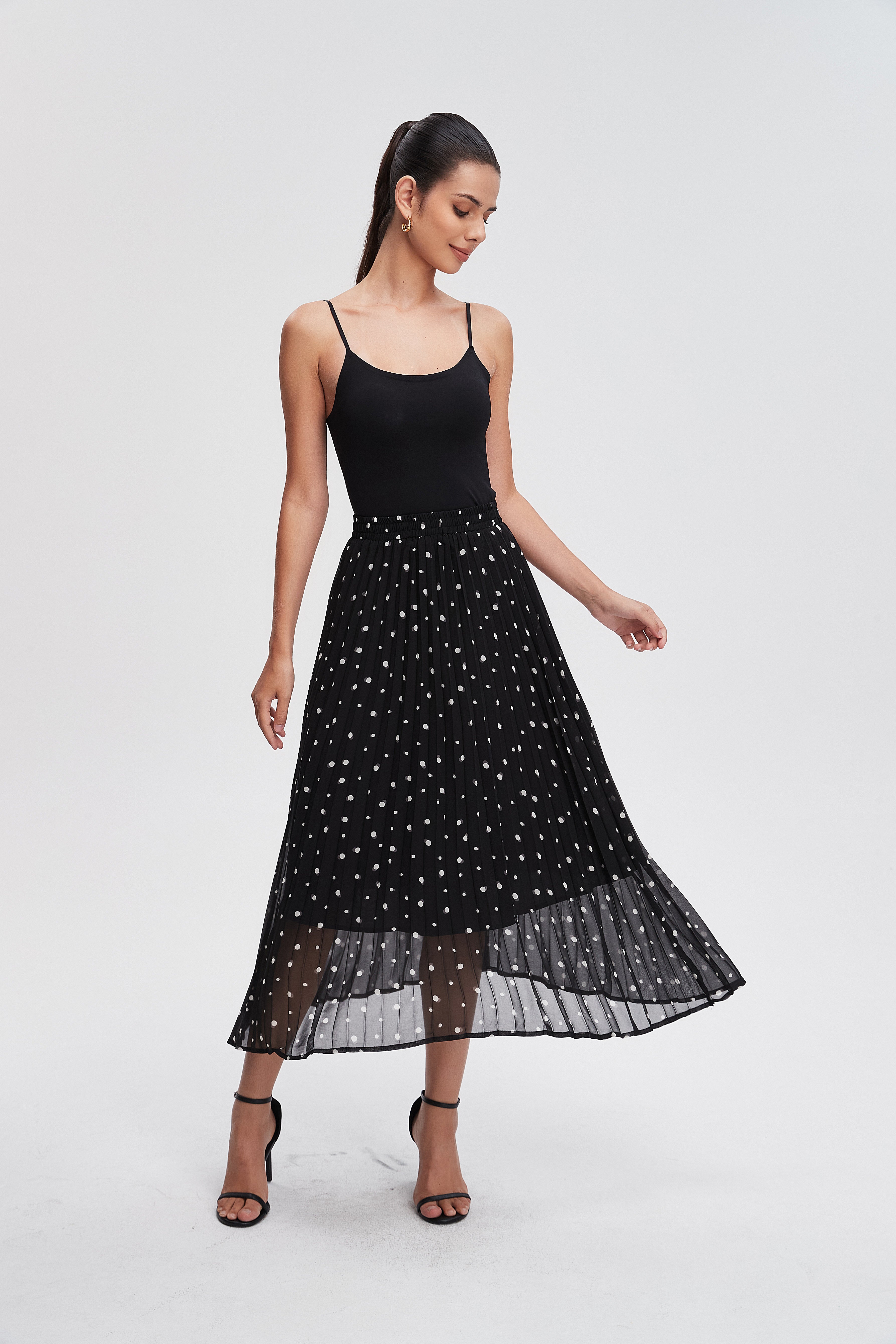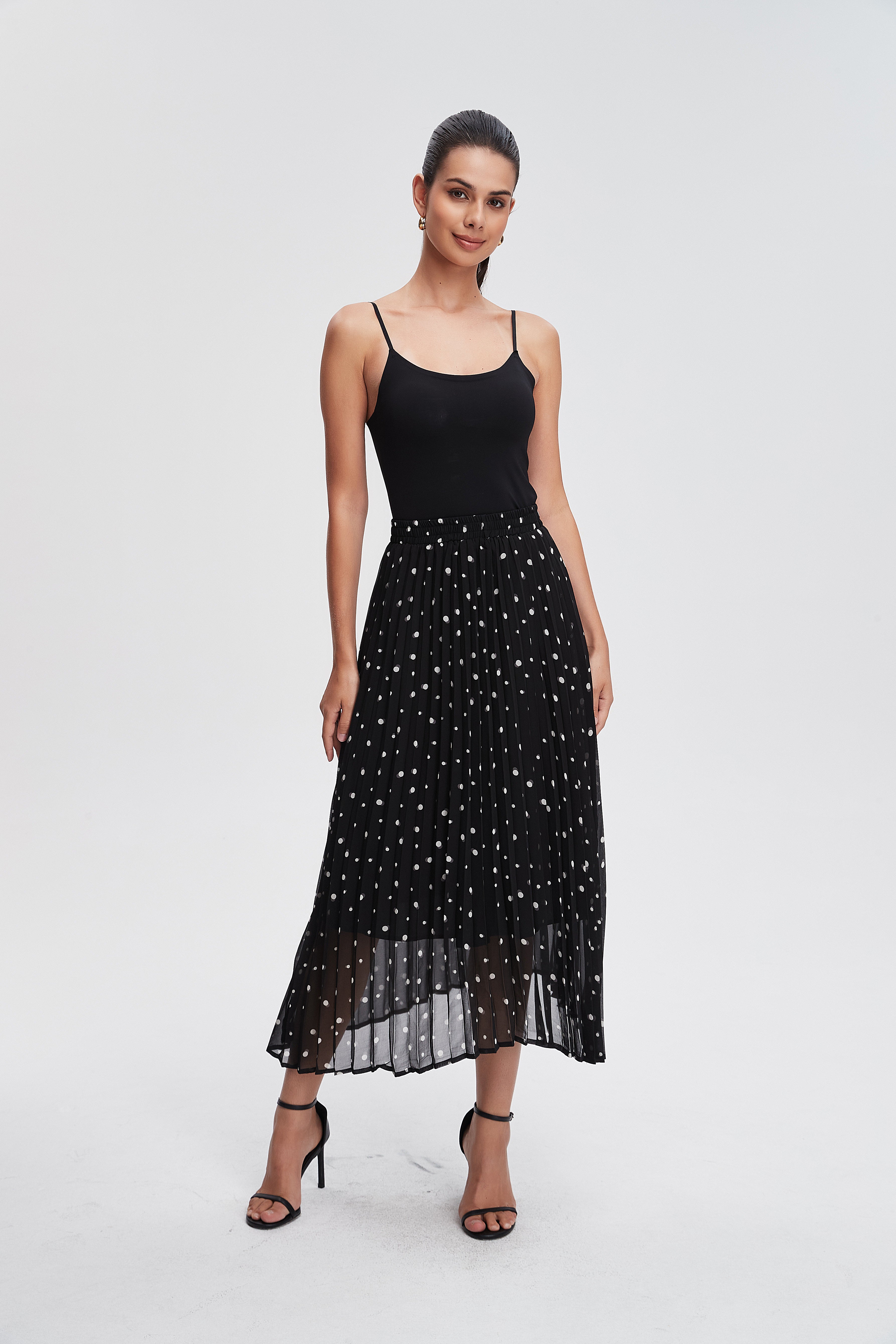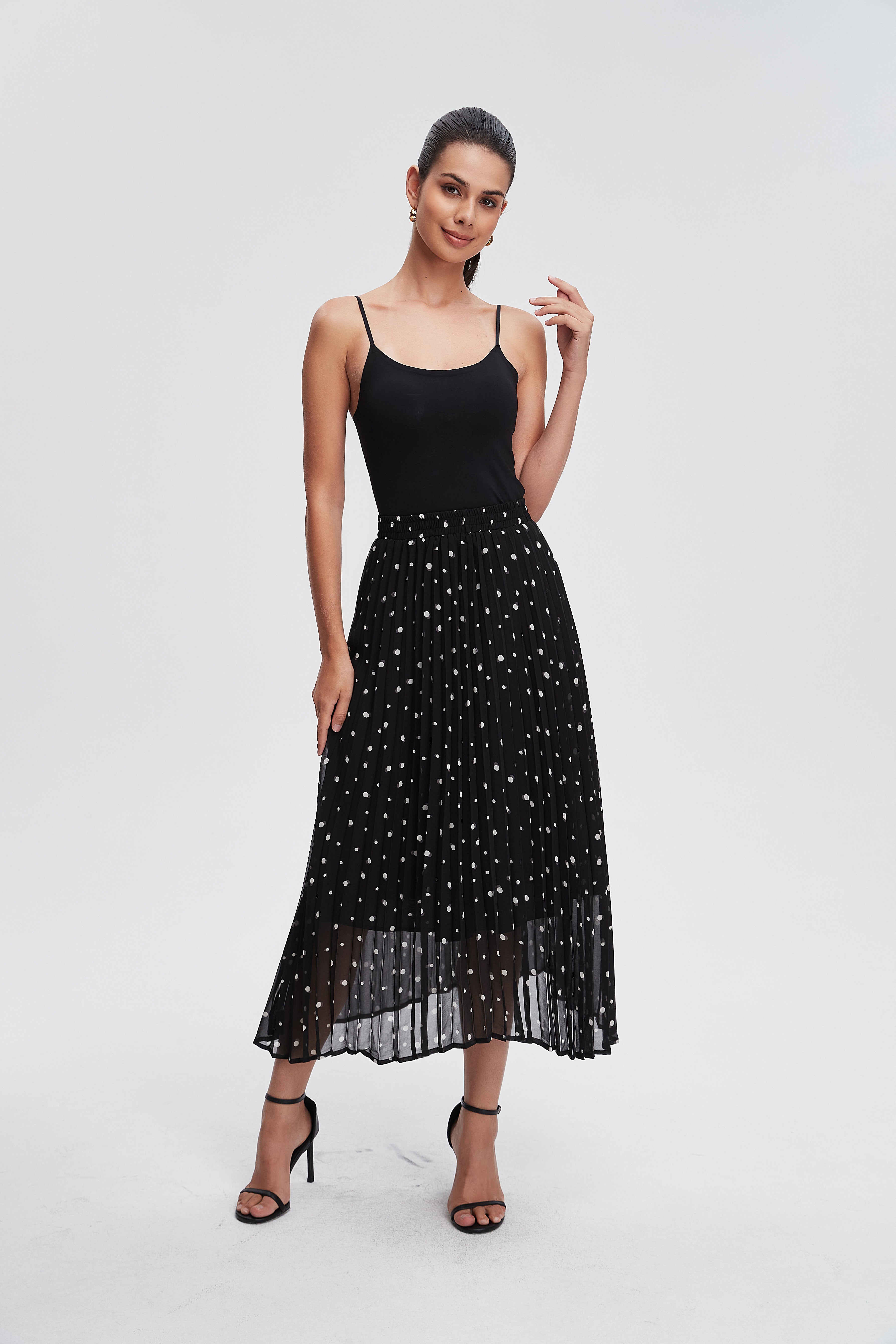 The Pleated Polka Dot Midi Skirt is your new go-to piece for effortless style. With its playful polka dot pattern, this skirt brings a fun twist to any outfit. The flattering pleats create a beautiful silhouette, perfect for twirling on sunny days or dressing up for a night out. Made from soft, breathable fabric, it offers comfort while keeping you chic. Pair it with a simple top and your favorite heels for a stunning look. Product Number: lv0496w254vt