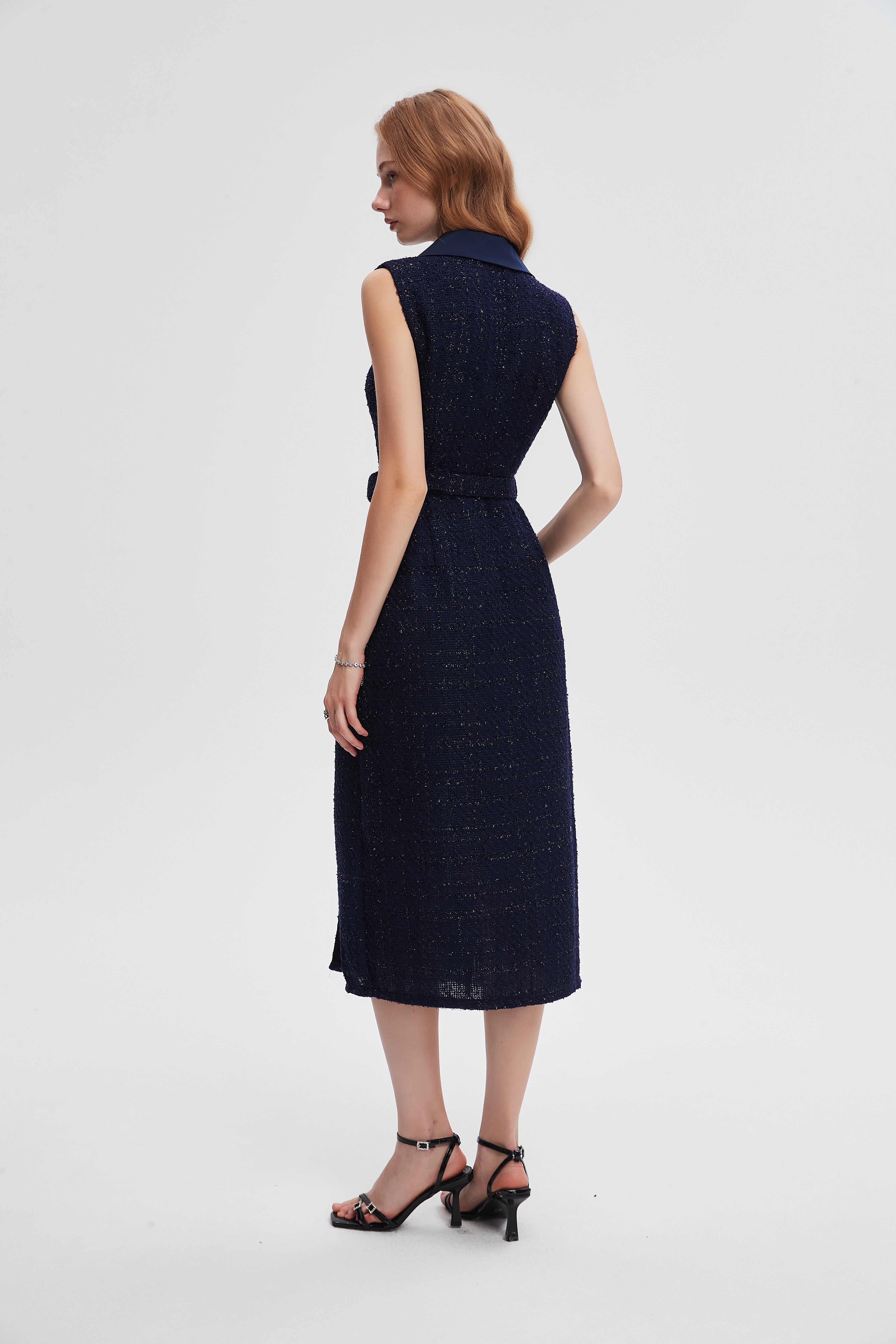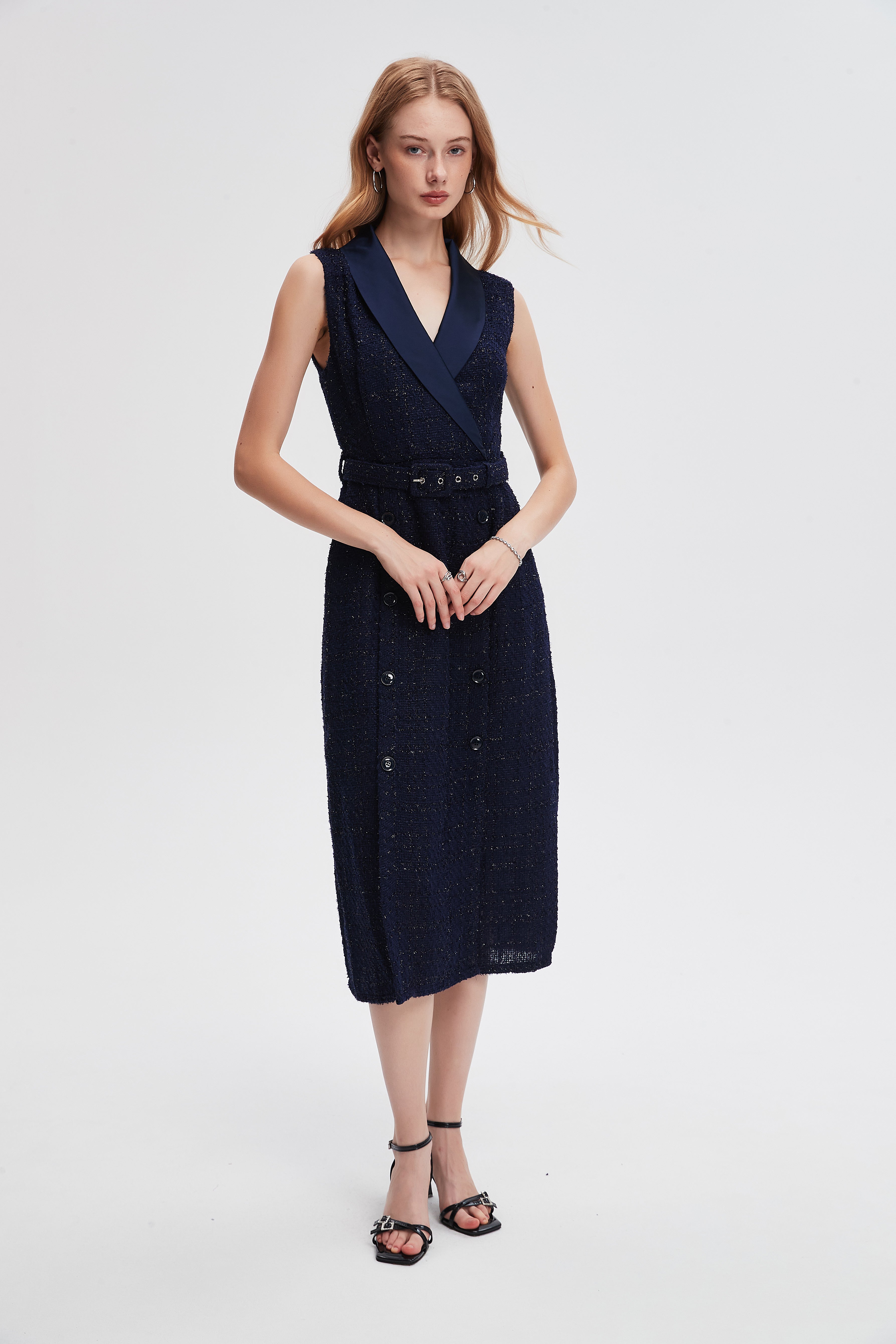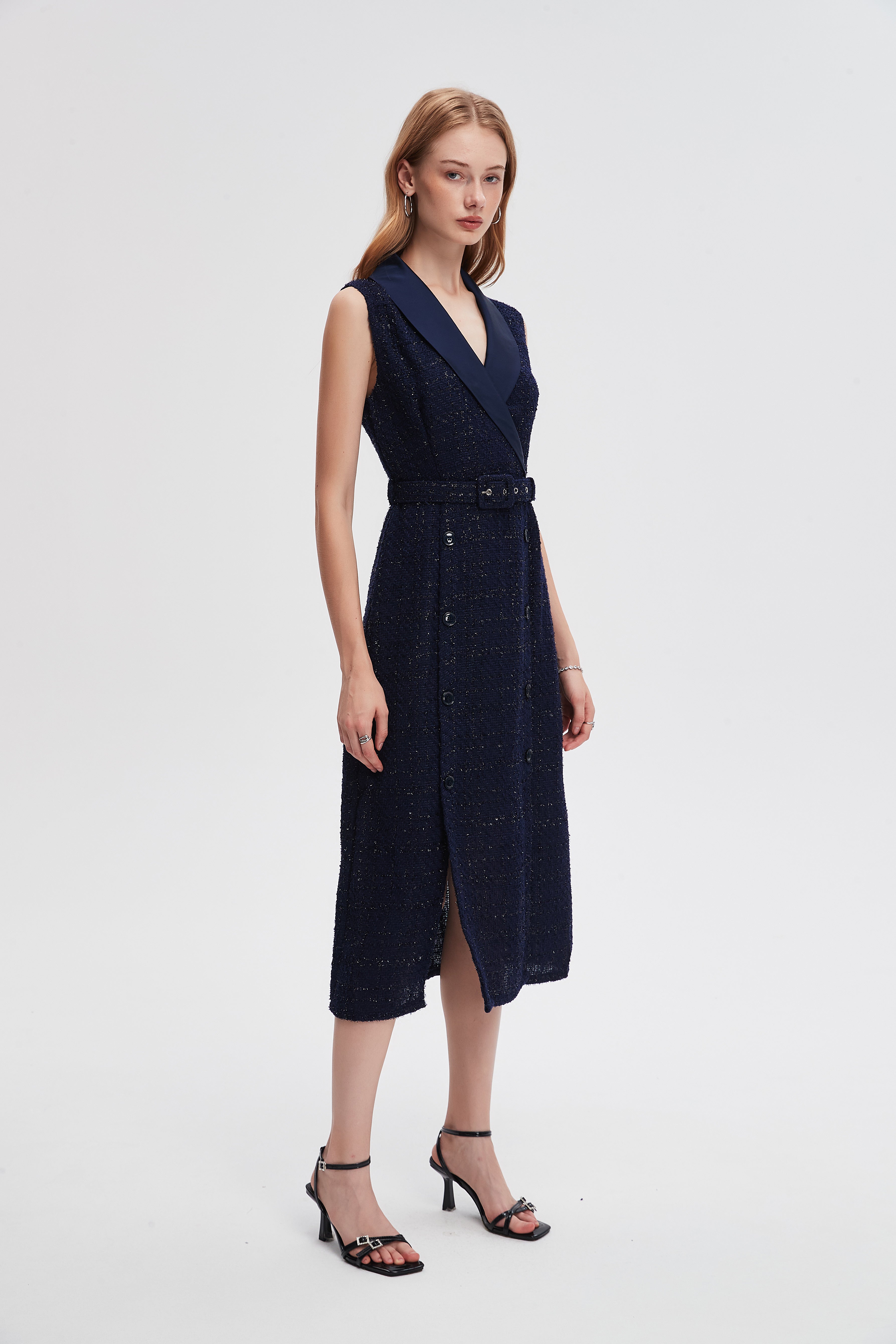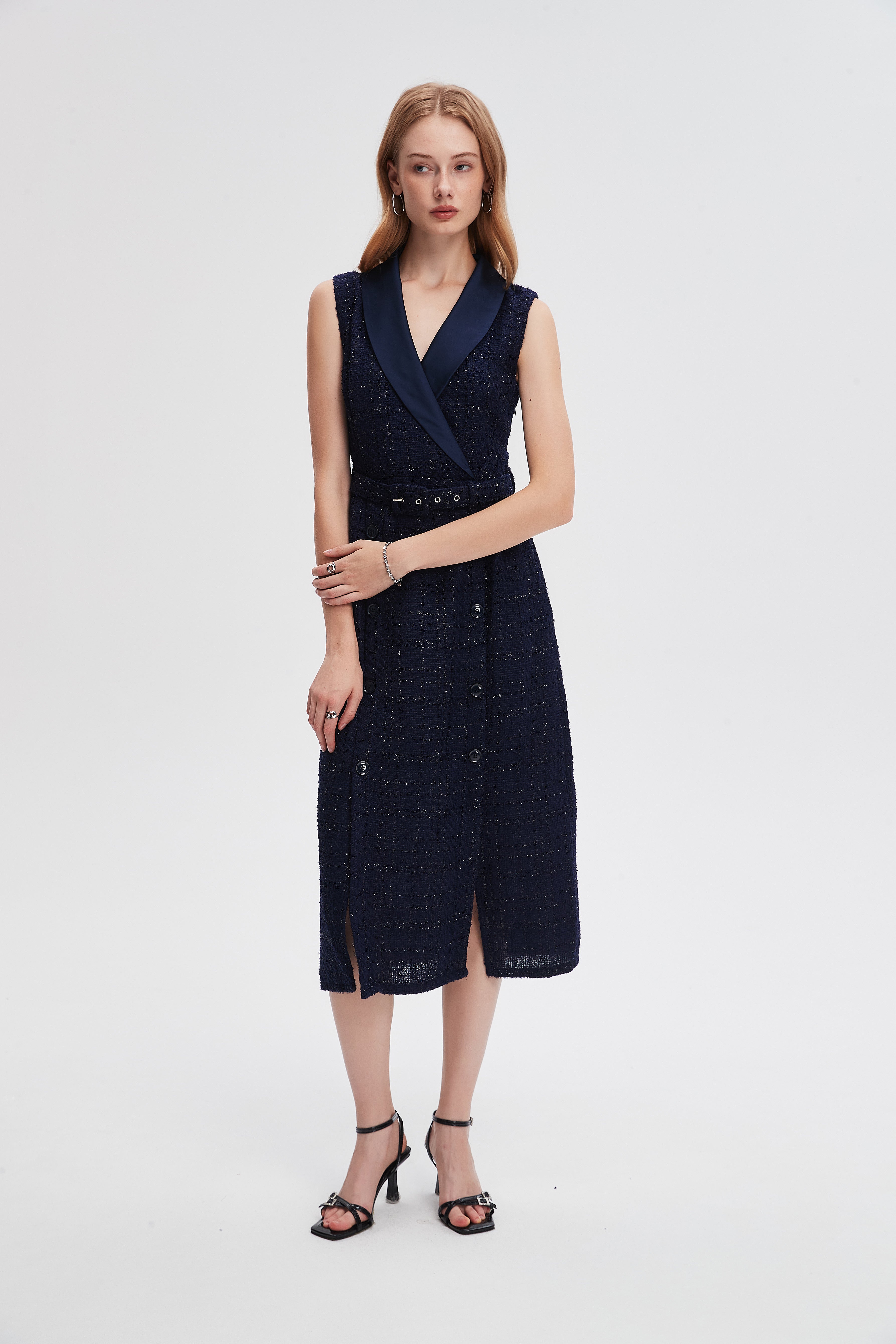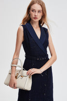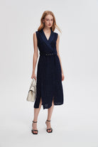 - Flattering A-line silhouette with V-neck and sleeveless cut — regular fit with belted waist for defined shape