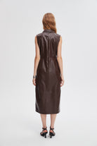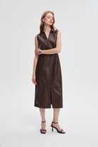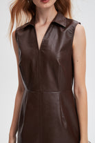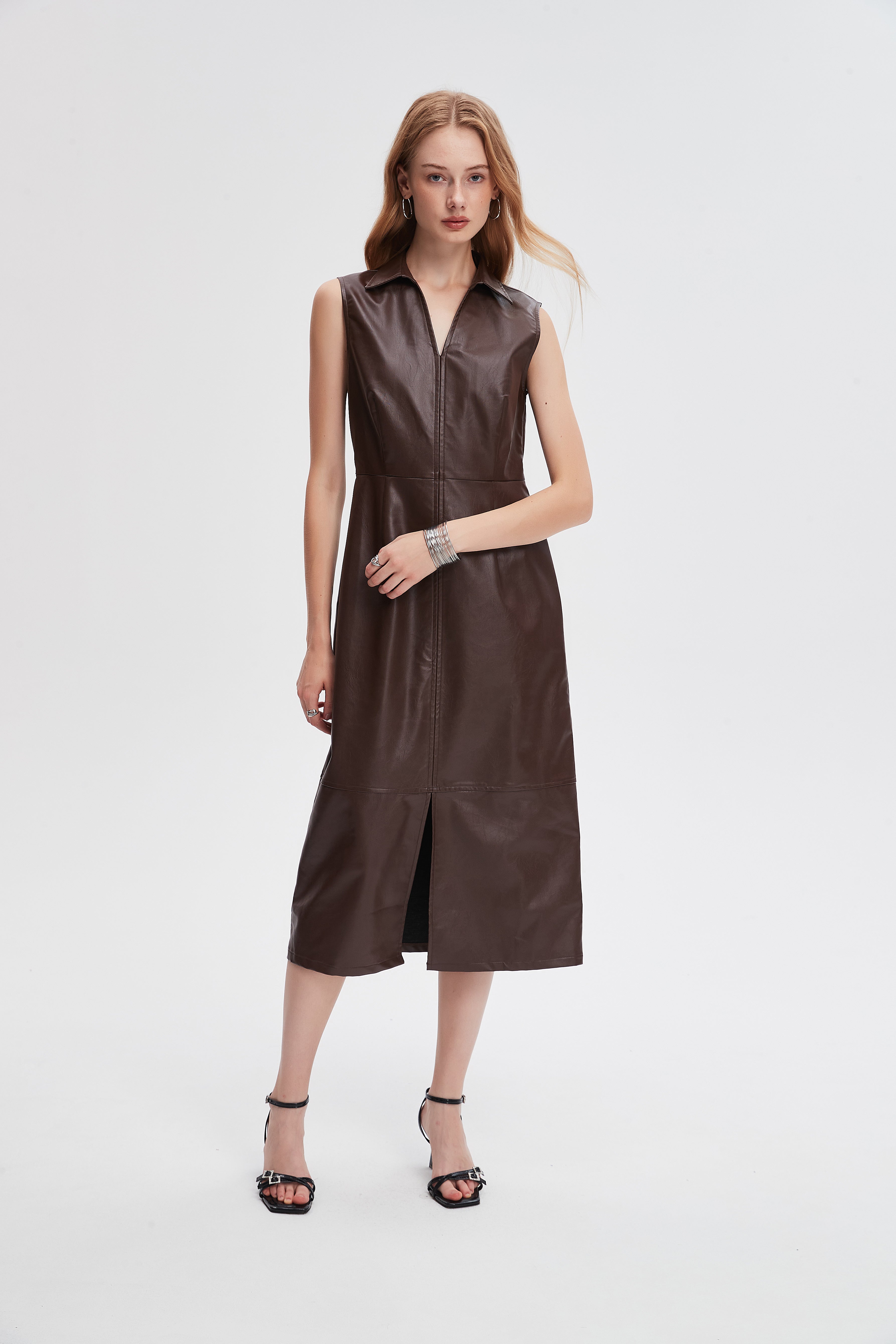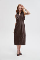 This brown plain midi sleeveless dress delivers effortless, modern polish — a versatile go-to for casual days and elevated weekends. Cut in a straight silhouette with a shirt collar and regular fit, the design creates clean, streamlined lines that flatter the torso and skim the hips. Crafted from 55% polyester and 45% PU, the medium-weight fabric offers a subtle sheen, structured drape and wrinkle-resistant ease. The unlined construction keeps breathability while the zippered closure ensures a smooth, secure fit; pocketless styling preserves the dress’s sleek profile. Midi length balances coverage and movement for comfortable daywear across seasons. Wear it solo in warm months or layer under a blazer or knit for cooler days — perfect for errands, lunch dates, or casual office settings. Discover Mica at Fashion SA and add this refined staple to your wardrobe today.