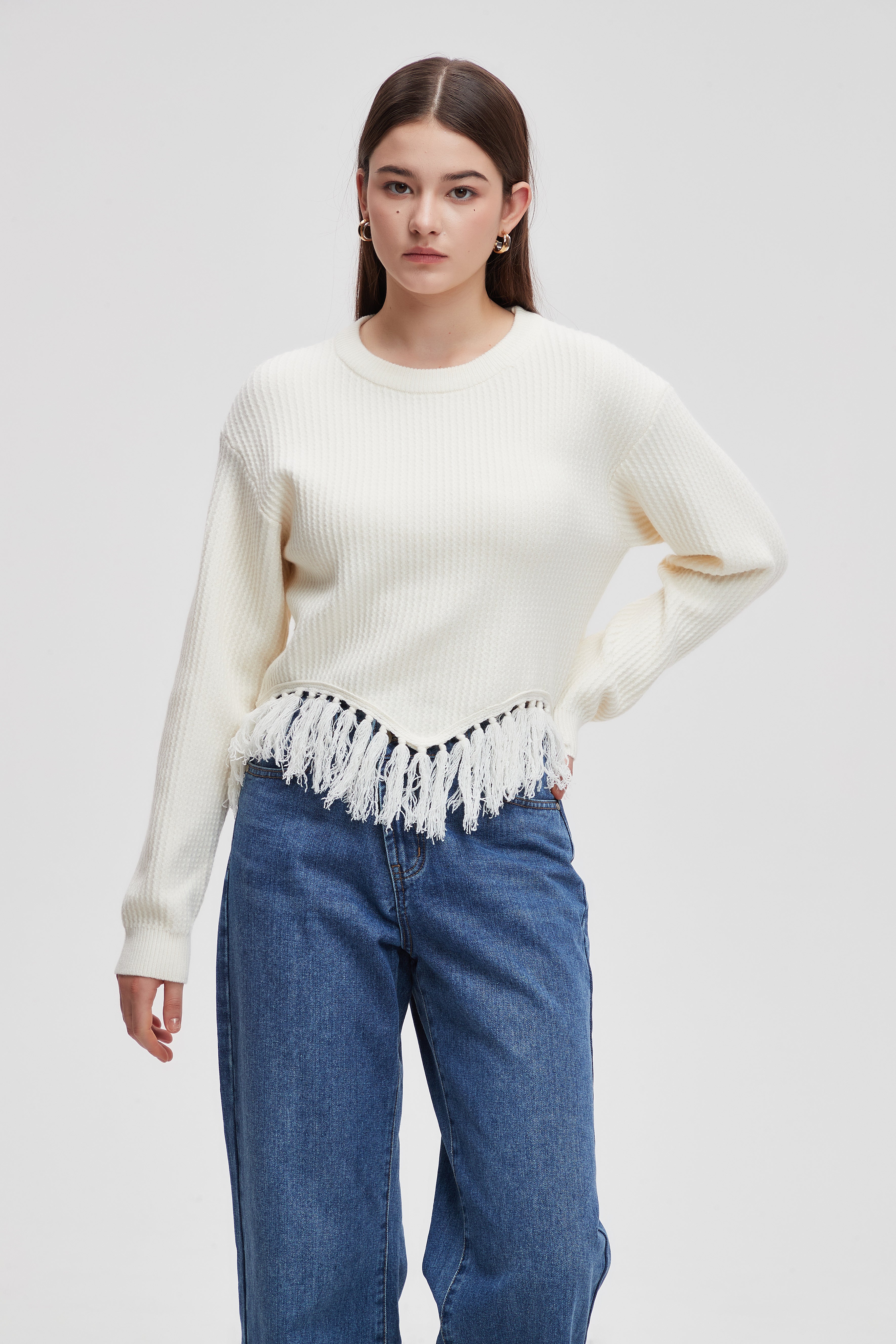 Solid Long Sleeve Blouse with Fringes