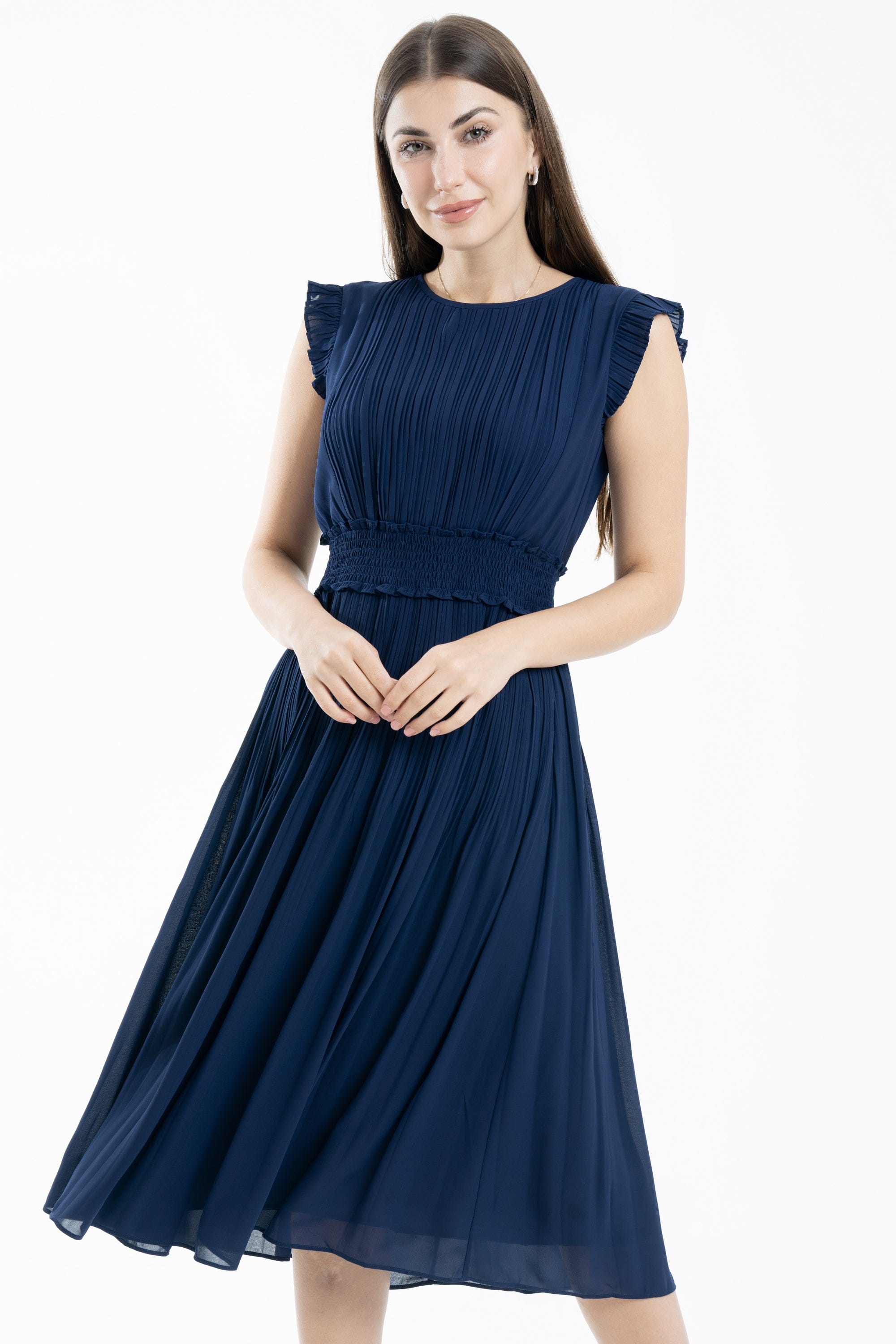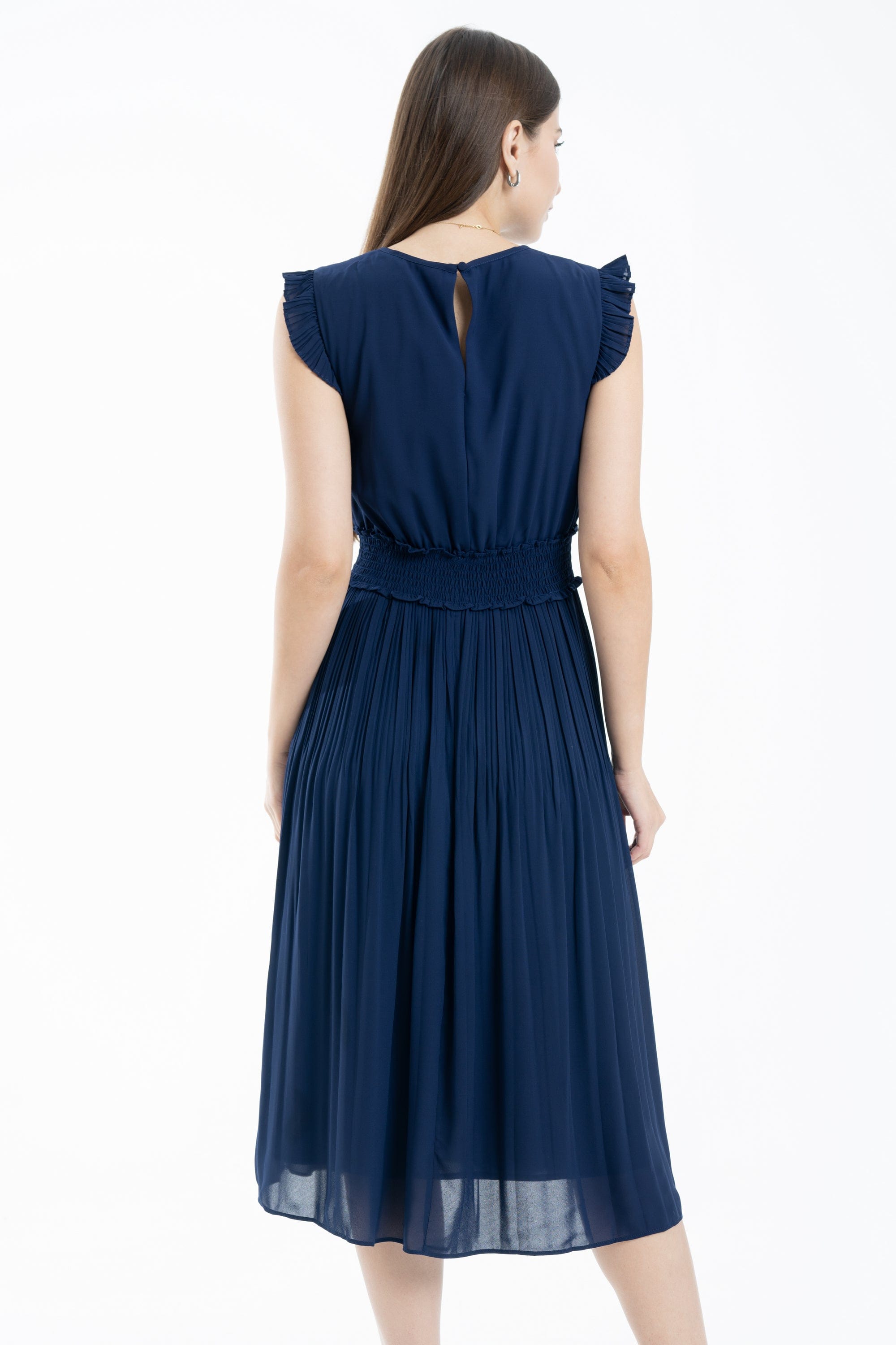 This dark blue midi A-line dress is a wardrobe staple that blends office polish with everyday ease, offering a flattering silhouette and fuss-free styling. Cut in a regular A-line shape from 100% polyester, the unlined design drapes smoothly for a wrinkle-resistant, low-maintenance finish. The short sleeves and round neck create a clean, feminine profile while the midi length provides elegant coverage ideal for work, weekend brunches, or travel. With a pocketless, beltless construction and medium-weight fabric it maintains shape without added bulk, delivering comfortable mobility and a confident fit. Versatile enough to dress up or down, this plain solid piece is perfect for layered looks and season-spanning wear. Shop the Dark Blue Midi A-Line Dress at Fashion SA and refresh your rotation with effortless, polished style.