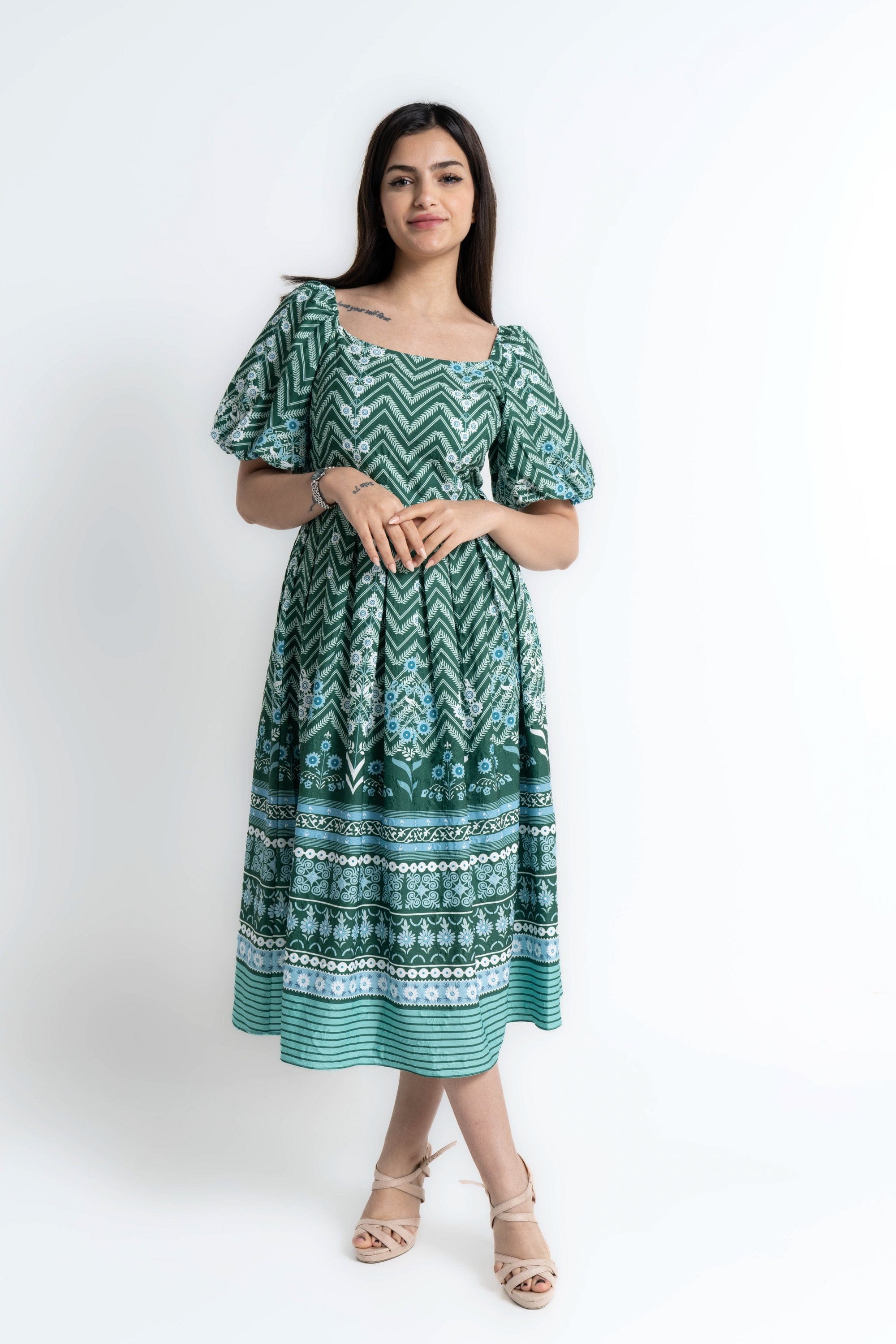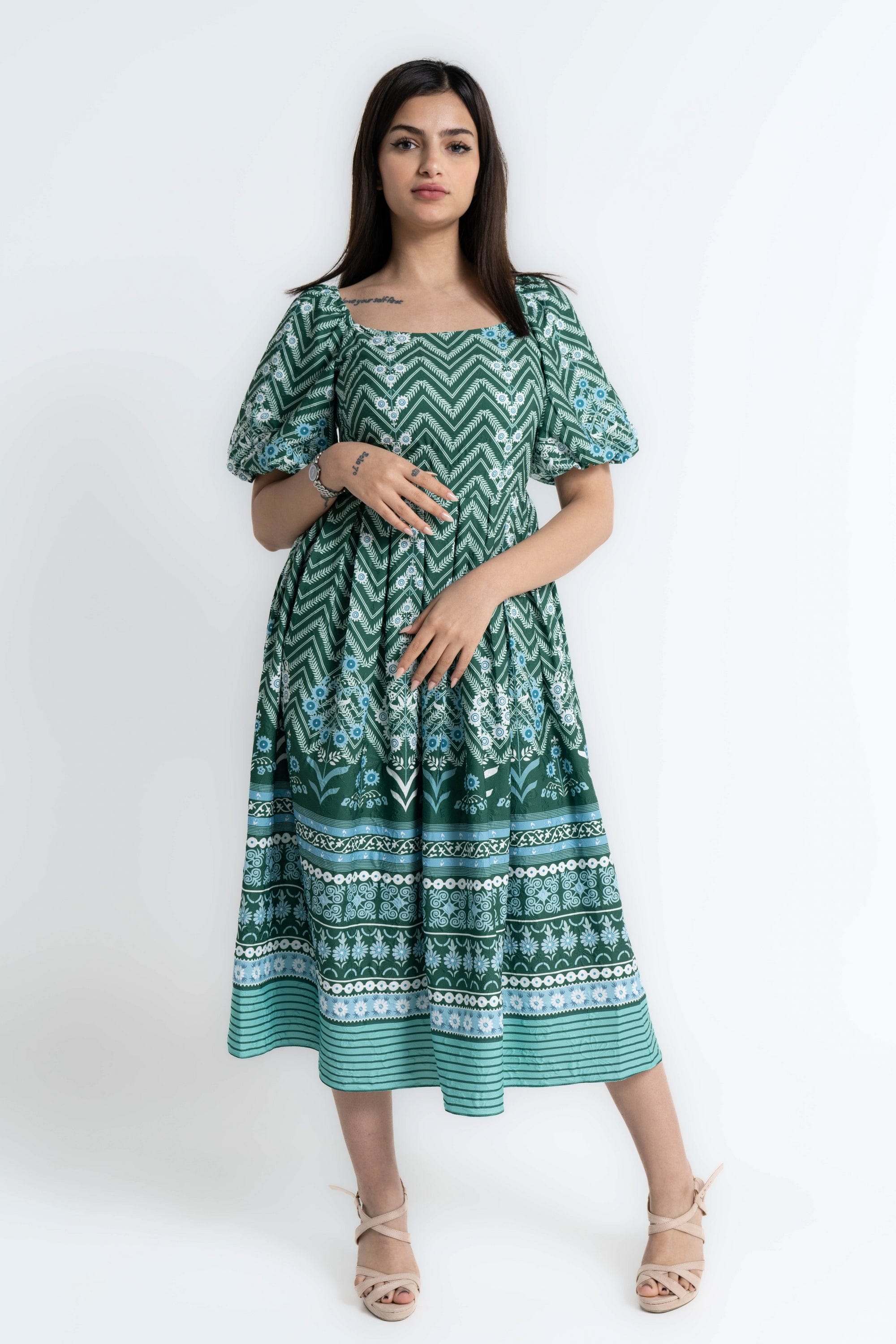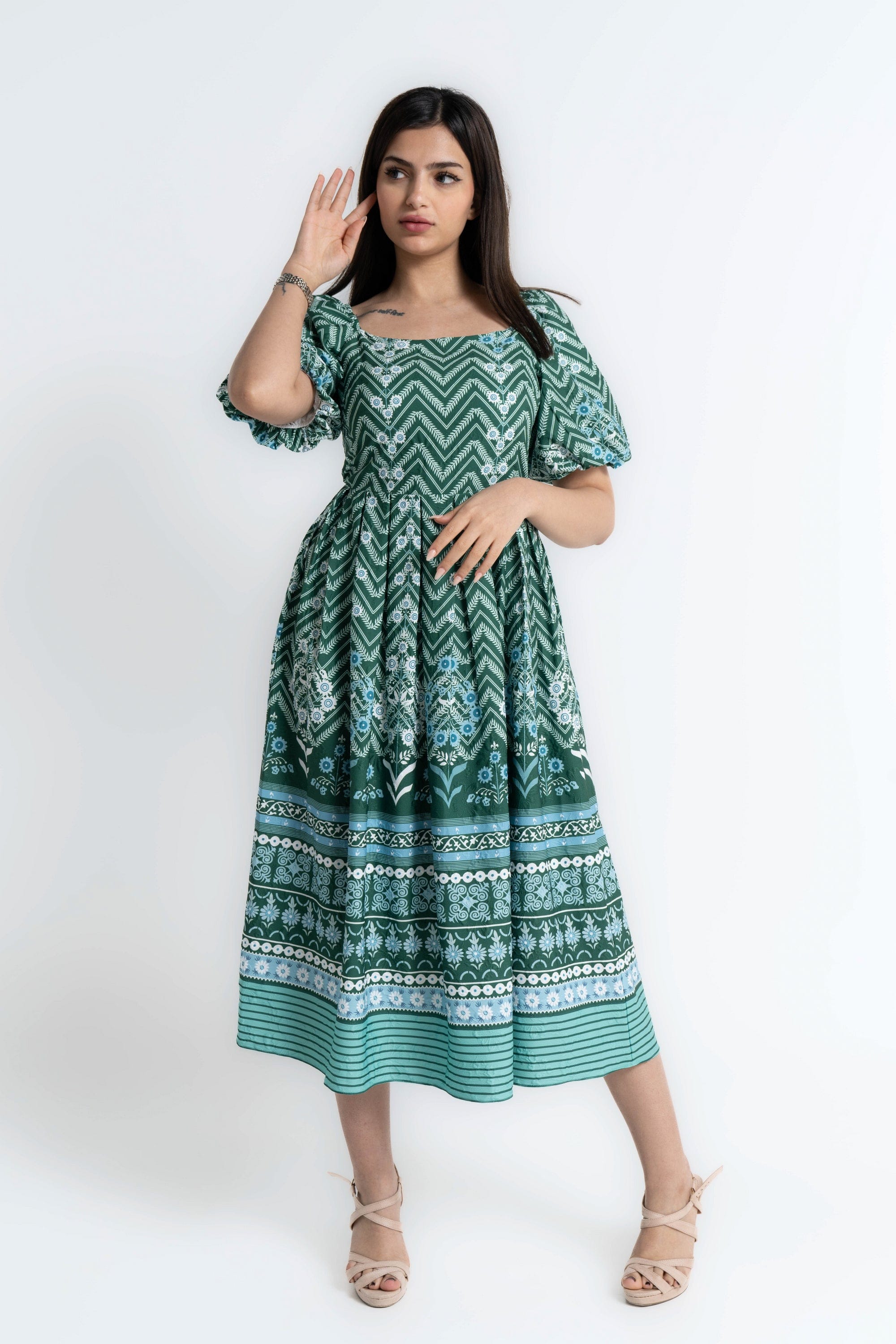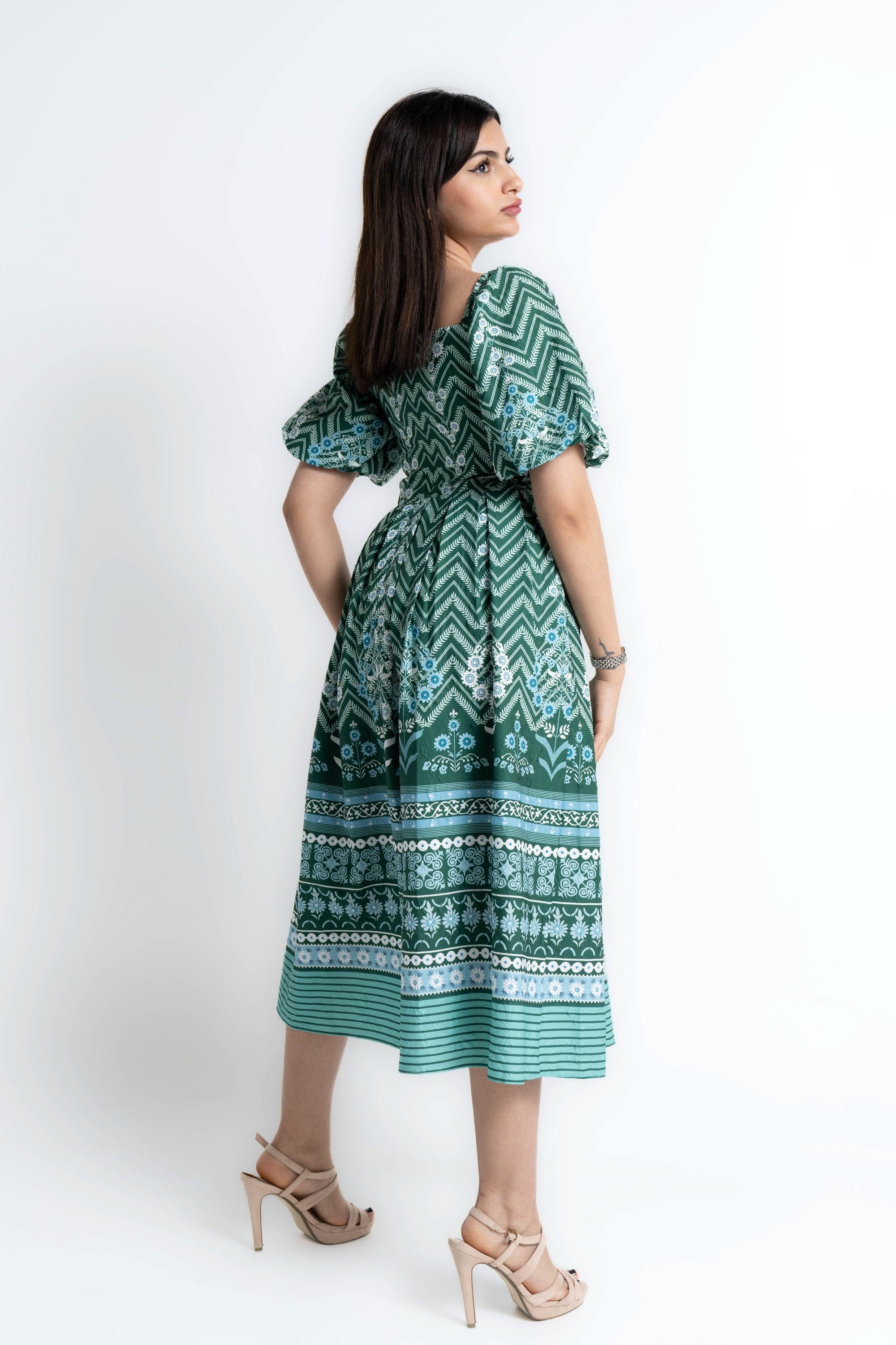 Turn everyday moments into a statement with the Green Patterned Midi Puffed-Sleeve Dress by Mica — a feminine, easygoing piece that elevates casual wardrobes. The flattering A-line silhouette and midi length skim the body for balanced proportions, while the square neckline and short puffed/ruffle sleeves add vintage-inspired structure. Crafted from wrinkle-resistant 100% polyester with an unlined construction, this regular-fit dress is lightweight, low-maintenance and ideal for all seasons. The green patterned print brings playful depth without overpowering accessories; it's pocketless and beltless for a clean, streamlined look. Whether you're headed to weekend brunch, a relaxed office day or travel, this versatile dress moves with you and dresses up or down effortlessly. Discover this must-have on Fashion SA — add the Green Patterned Midi Puffed-Sleeve Dress to your wardrobe today.