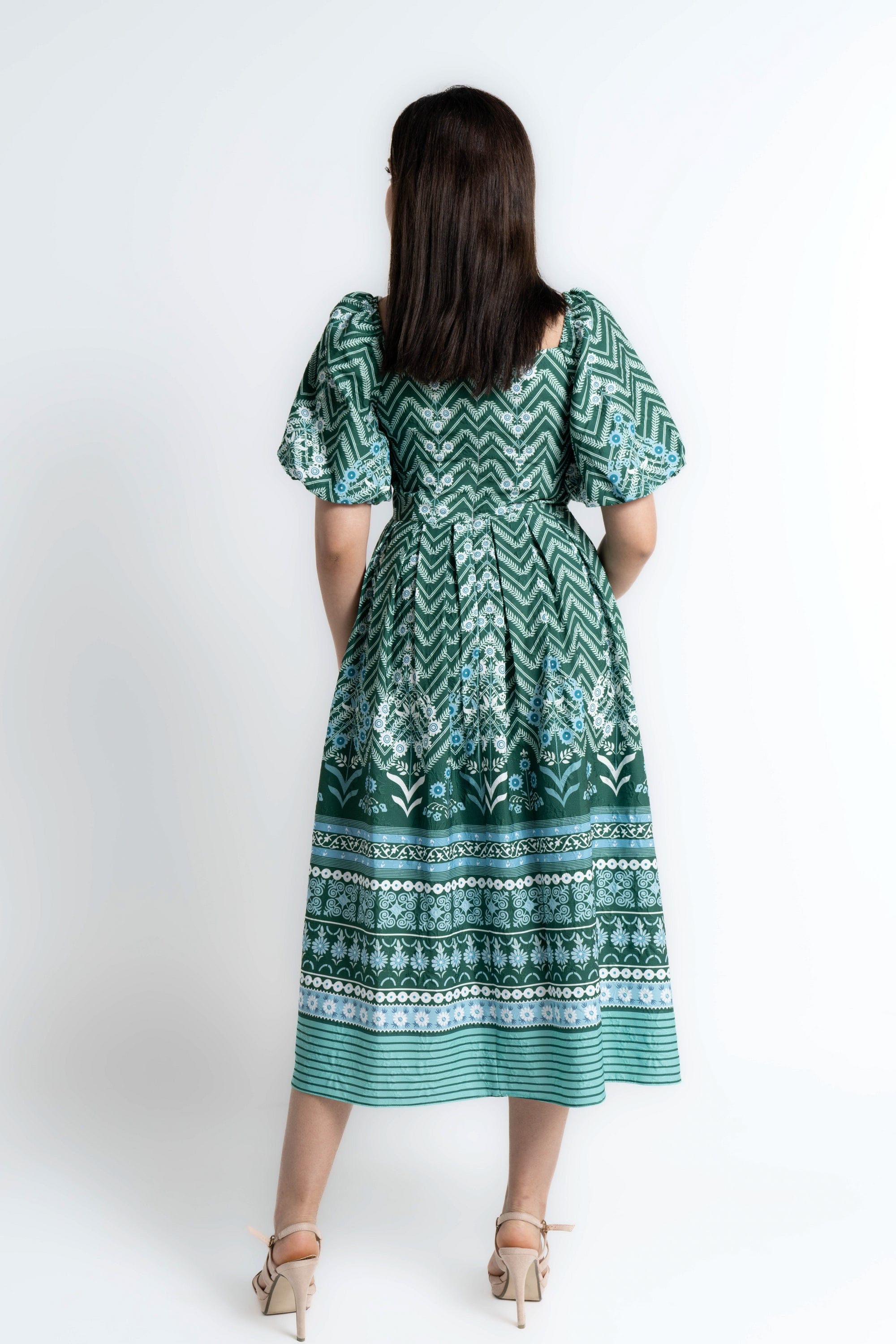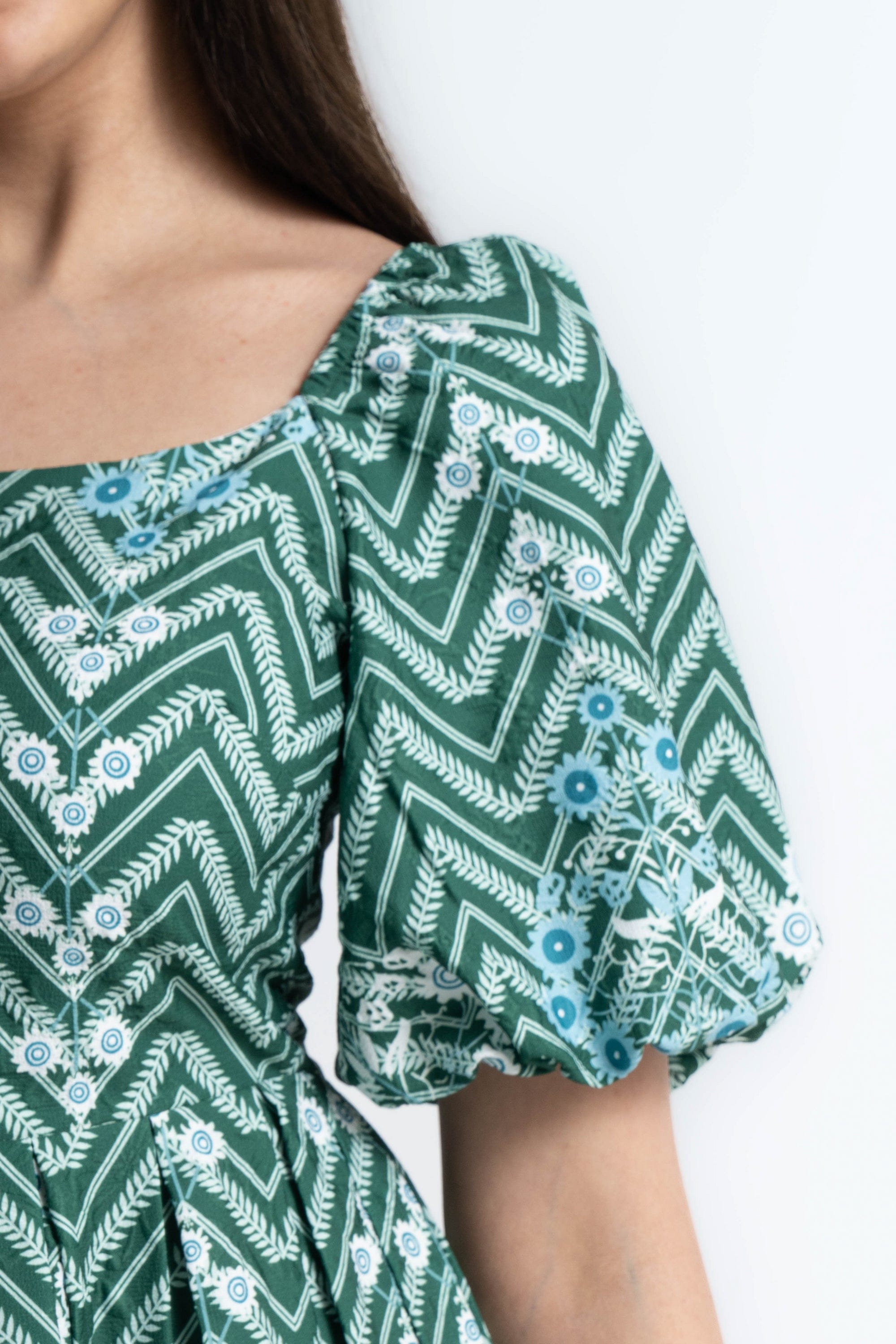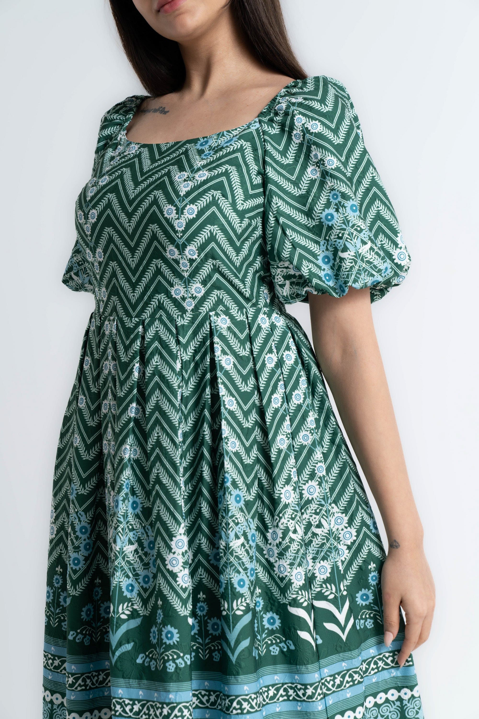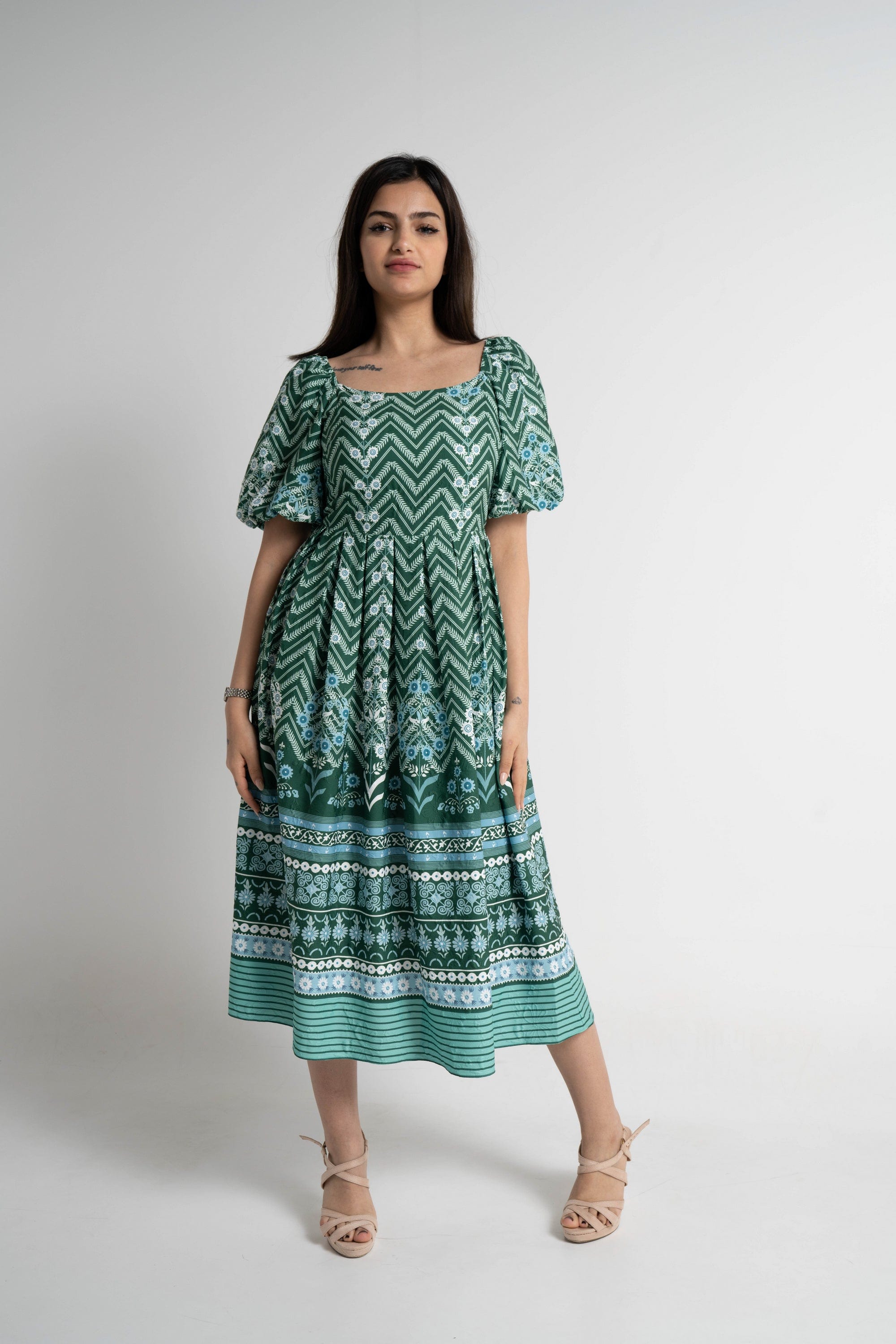 Turn everyday moments into a statement with the Green Patterned Midi Puffed-Sleeve Dress by Mica — a feminine, easygoing piece that elevates casual wardrobes. The flattering A-line silhouette and midi length skim the body for balanced proportions, while the square neckline and short puffed/ruffle sleeves add vintage-inspired structure. Crafted from wrinkle-resistant 100% polyester with an unlined construction, this regular-fit dress is lightweight, low-maintenance and ideal for all seasons. The green patterned print brings playful depth without overpowering accessories; it's pocketless and beltless for a clean, streamlined look. Whether you're headed to weekend brunch, a relaxed office day or travel, this versatile dress moves with you and dresses up or down effortlessly. Discover this must-have on Fashion SA — add the Green Patterned Midi Puffed-Sleeve Dress to your wardrobe today.