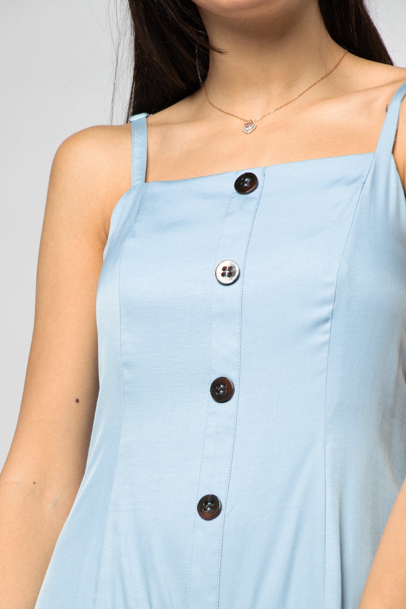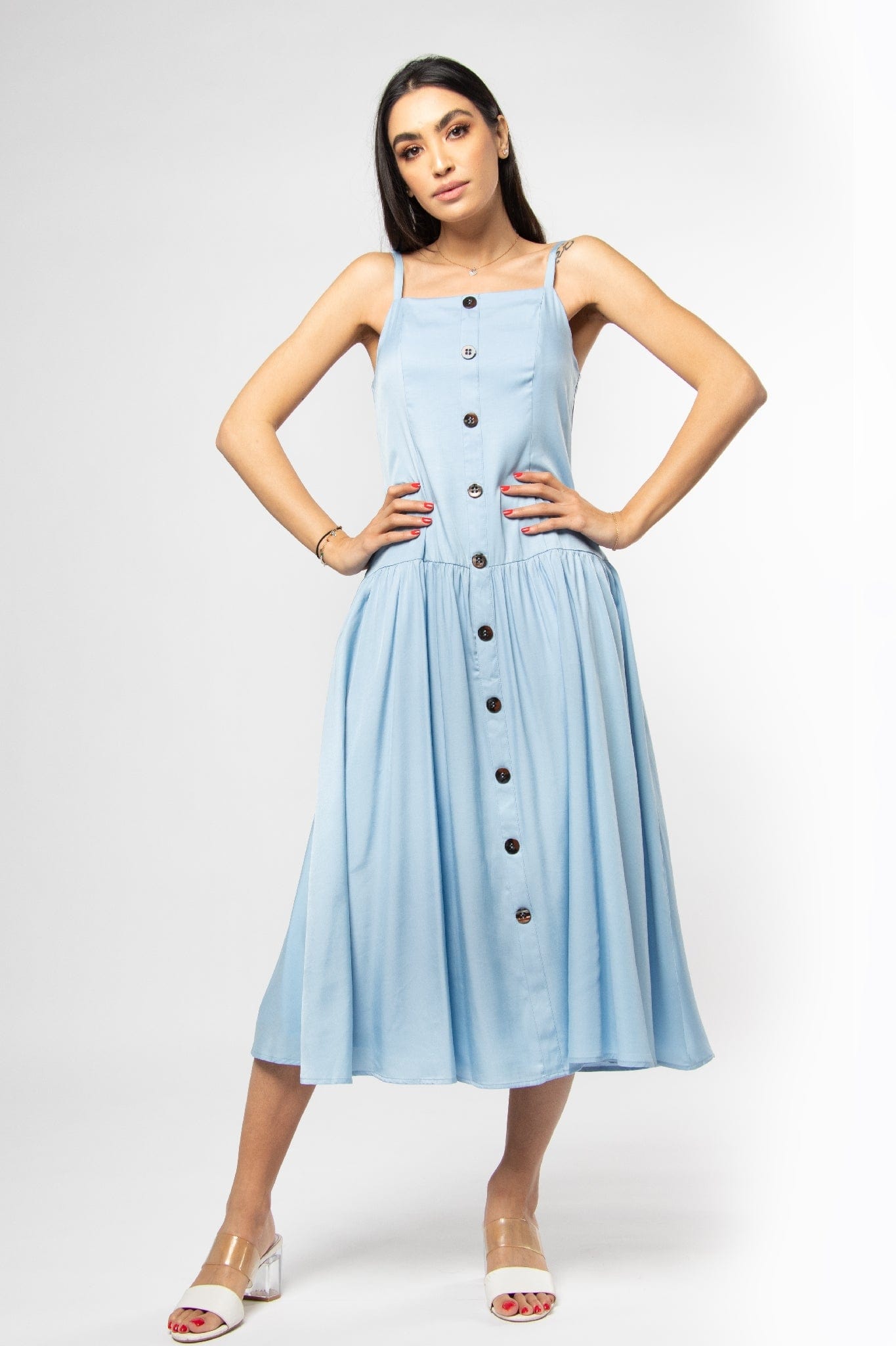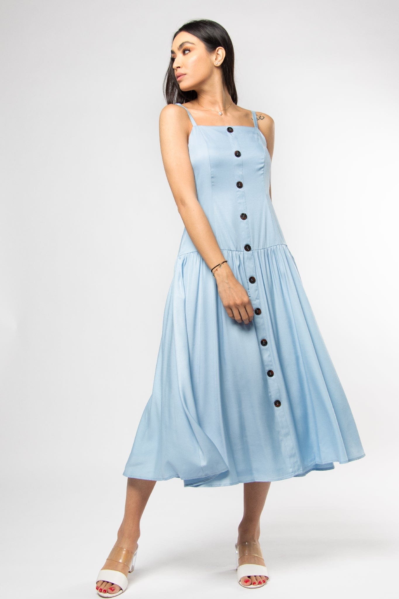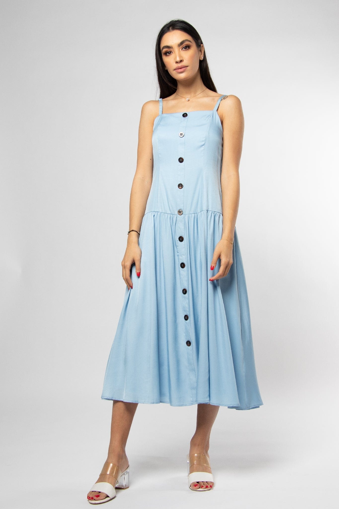 This light blue solid midi dress is a fresh summer staple that blends effortless style with everyday comfort. Cut in a flattering A-line silhouette, the strapless design and square neckline frame the shoulders while the regular, unlined construction keeps the look light and breathable for warm days. Crafted from 100% polyester, the fabric delivers low‑maintenance, wrinkle‑resistant wear with a medium weight that creates a graceful drape through the midi length. Functional button closure maintains a clean front, while the pocketless, beltless finish emphasizes the dress’s minimalist lines. Ideal for casual daytime outings, weekend brunches or relaxed holiday looks, it transitions easily from day to night with simple accessories. From Mica and available at Fashion SA — add this versatile piece to your wardrobe today.