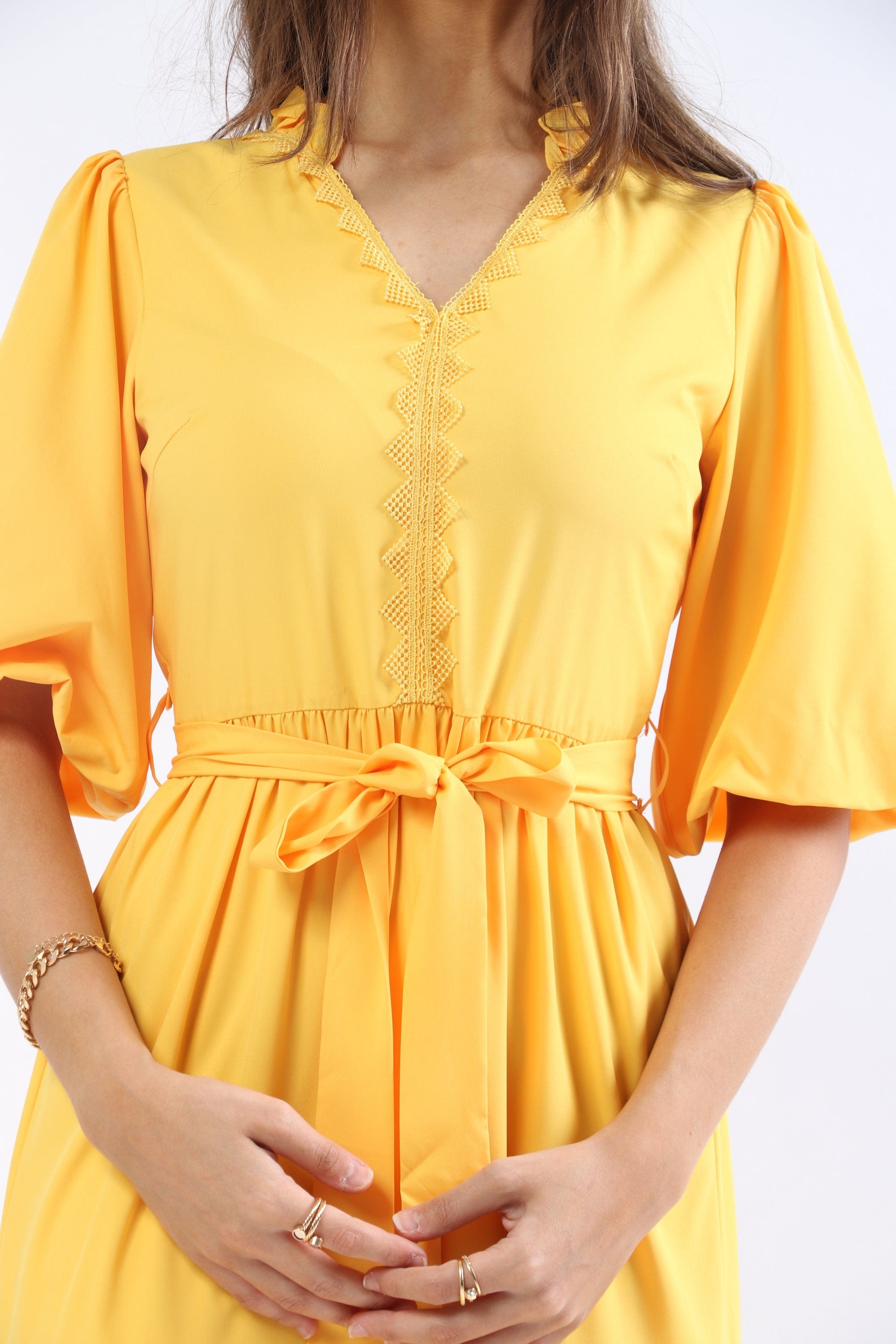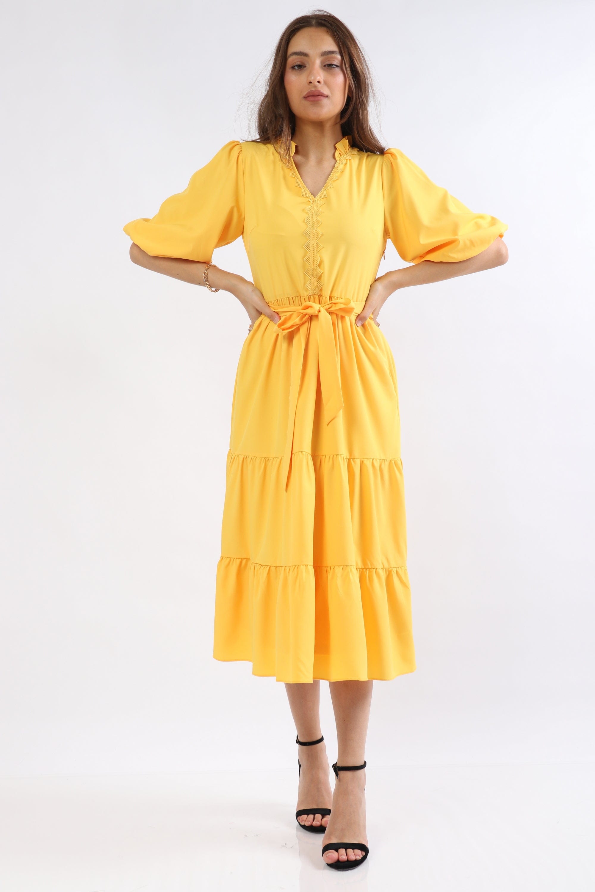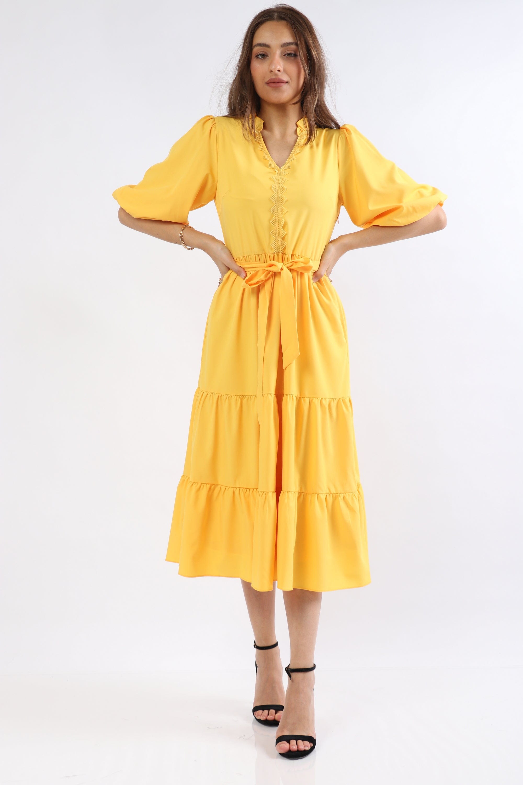 This sunny Yellow Solid Midi Belted Dress is a wardrobe-ready piece that radiates feminine charm and everyday ease. The A-line silhouette flatters the waist and skims the hips while the included belt creates a beautifully defined shape; a V-neck and short puffed sleeves lend romantic, textural interest to the plain solid surface. Crafted from a 97% polyester, 3% elastane blend, the fabric is wrinkle-resistant with a soft stretch for comfortable movement, and the unlined construction keeps the feel lightweight and breathable across seasons. Button-front closure and a pocketless, regular-fit profile maintain a clean, streamlined look at a versatile mid-calf midi length — ideal for casual outings. Shop this effortless staple at Fashion SA and add sunny sophistication to your everyday rotation today.