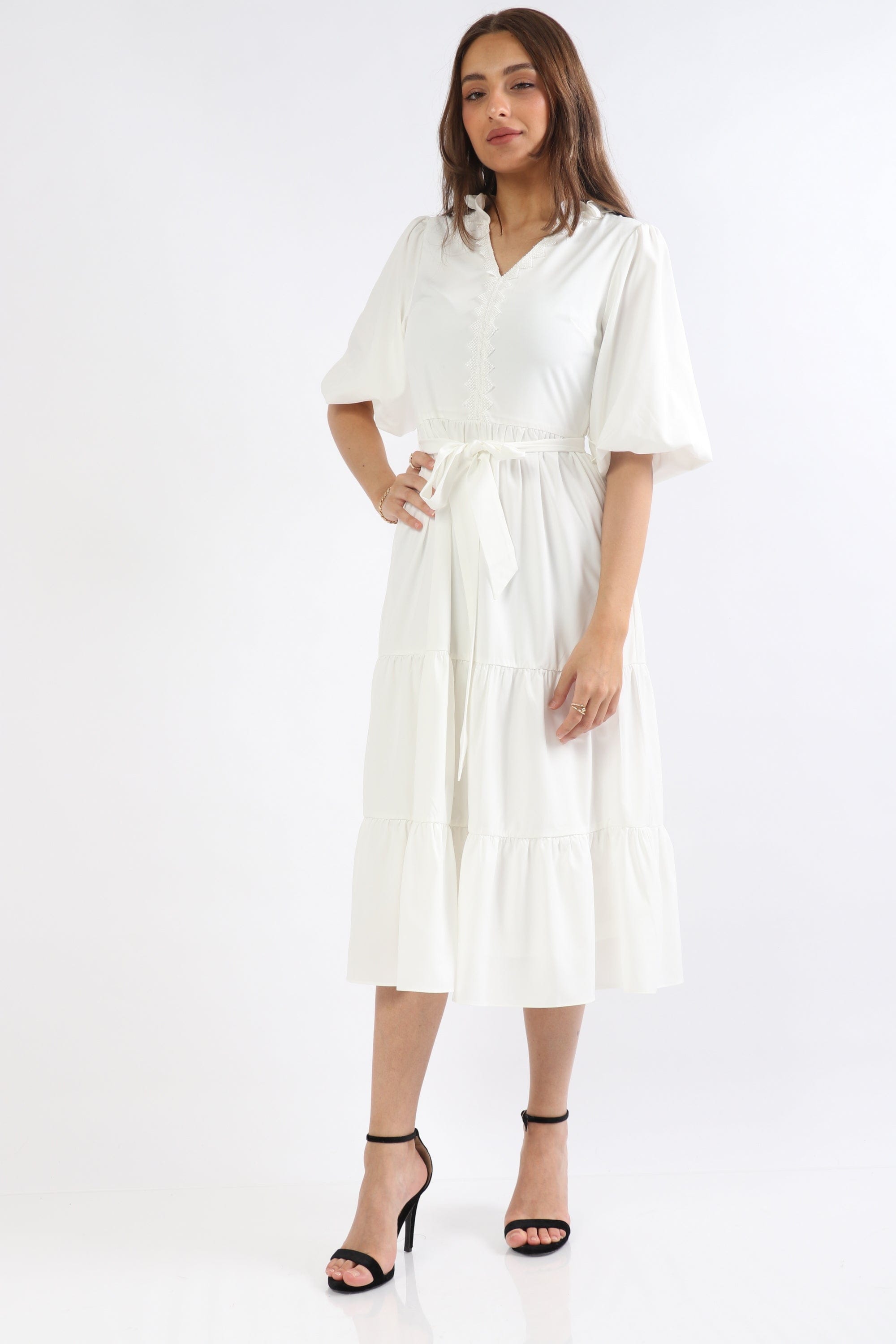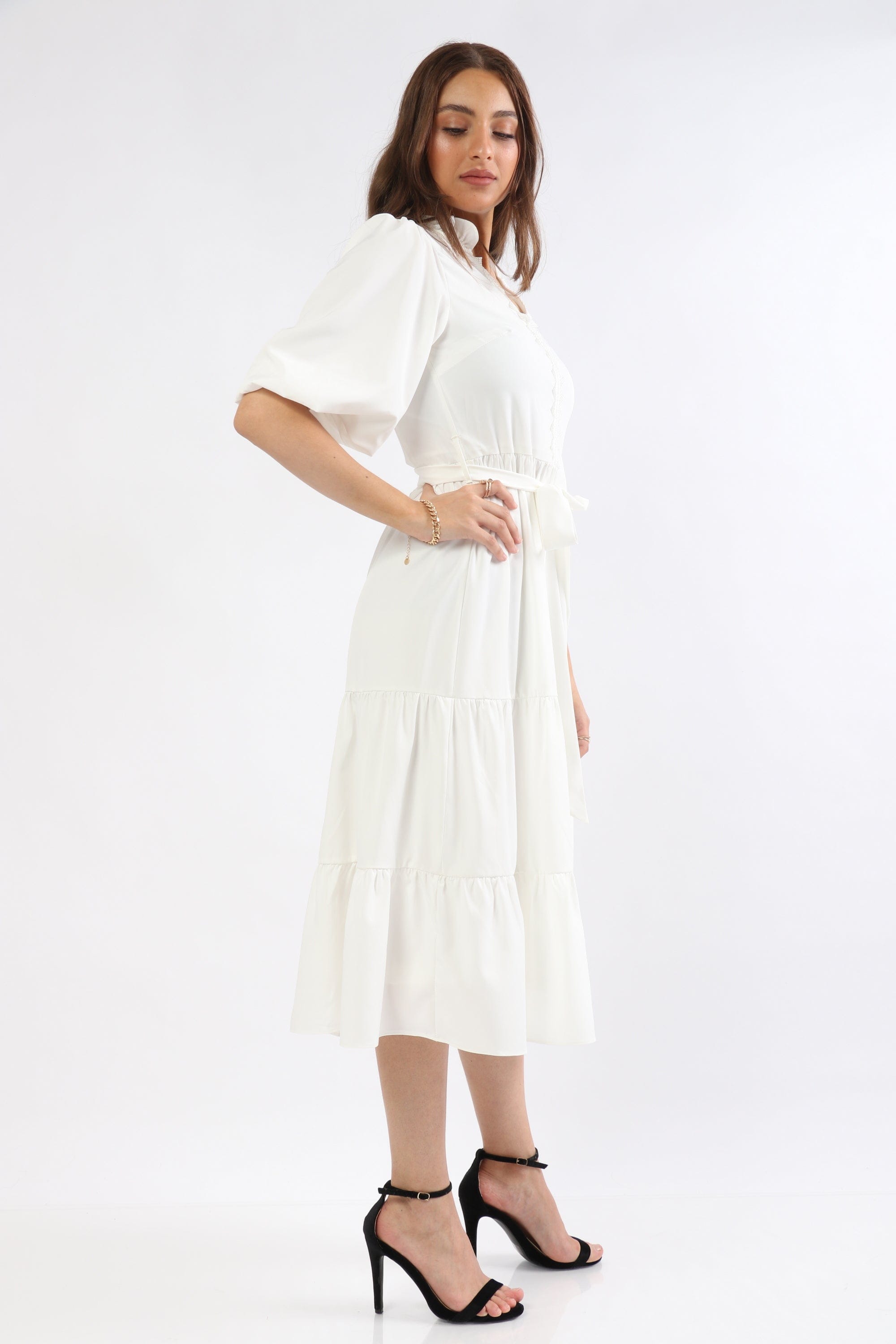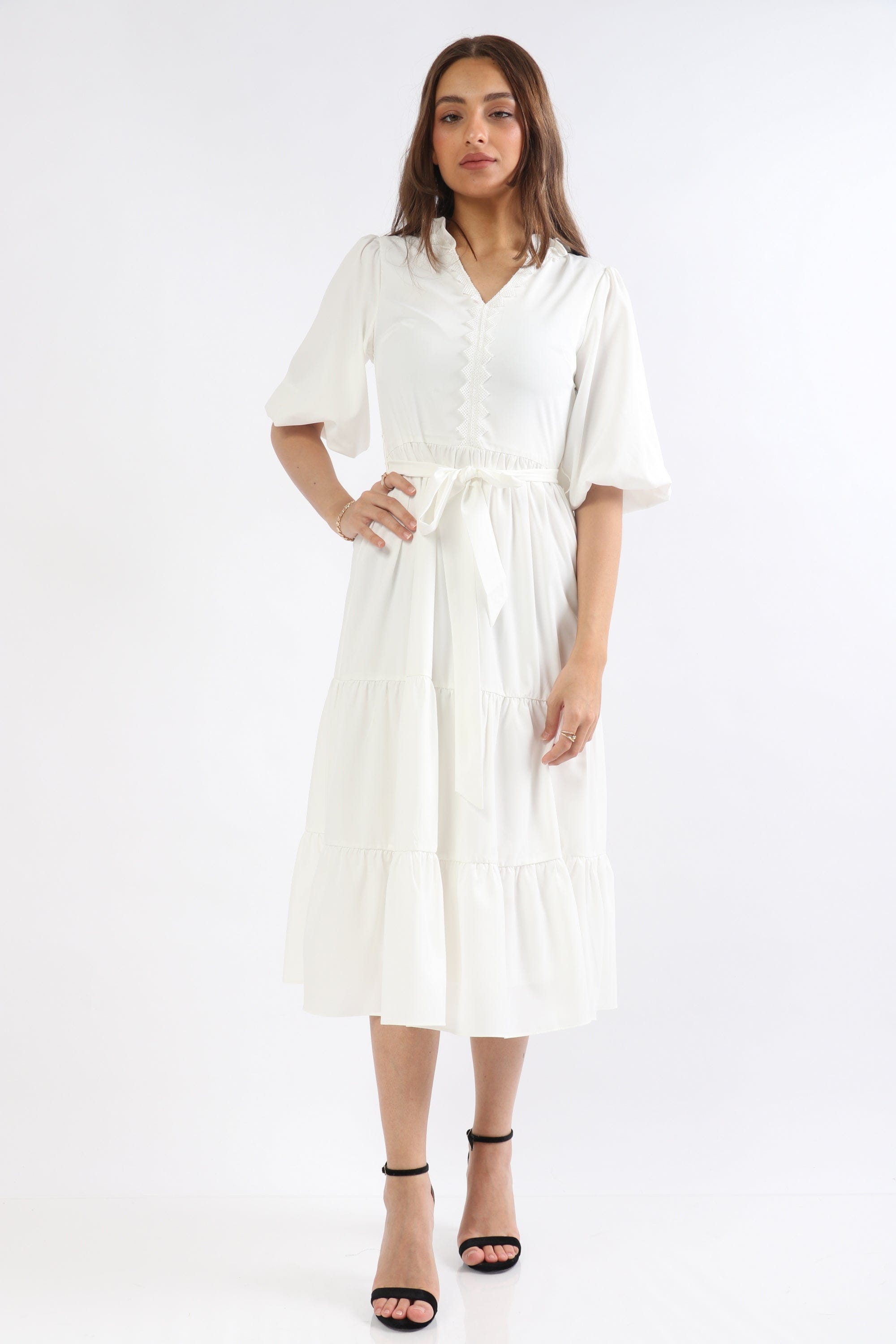 This sunny Yellow Solid Midi Belted Dress is a wardrobe-ready piece that radiates feminine charm and everyday ease. The A-line silhouette flatters the waist and skims the hips while the included belt creates a beautifully defined shape; a V-neck and short puffed sleeves lend romantic, textural interest to the plain solid surface. Crafted from a 97% polyester, 3% elastane blend, the fabric is wrinkle-resistant with a soft stretch for comfortable movement, and the unlined construction keeps the feel lightweight and breathable across seasons. Button-front closure and a pocketless, regular-fit profile maintain a clean, streamlined look at a versatile mid-calf midi length — ideal for casual outings. Shop this effortless staple at Fashion SA and add sunny sophistication to your everyday rotation today.