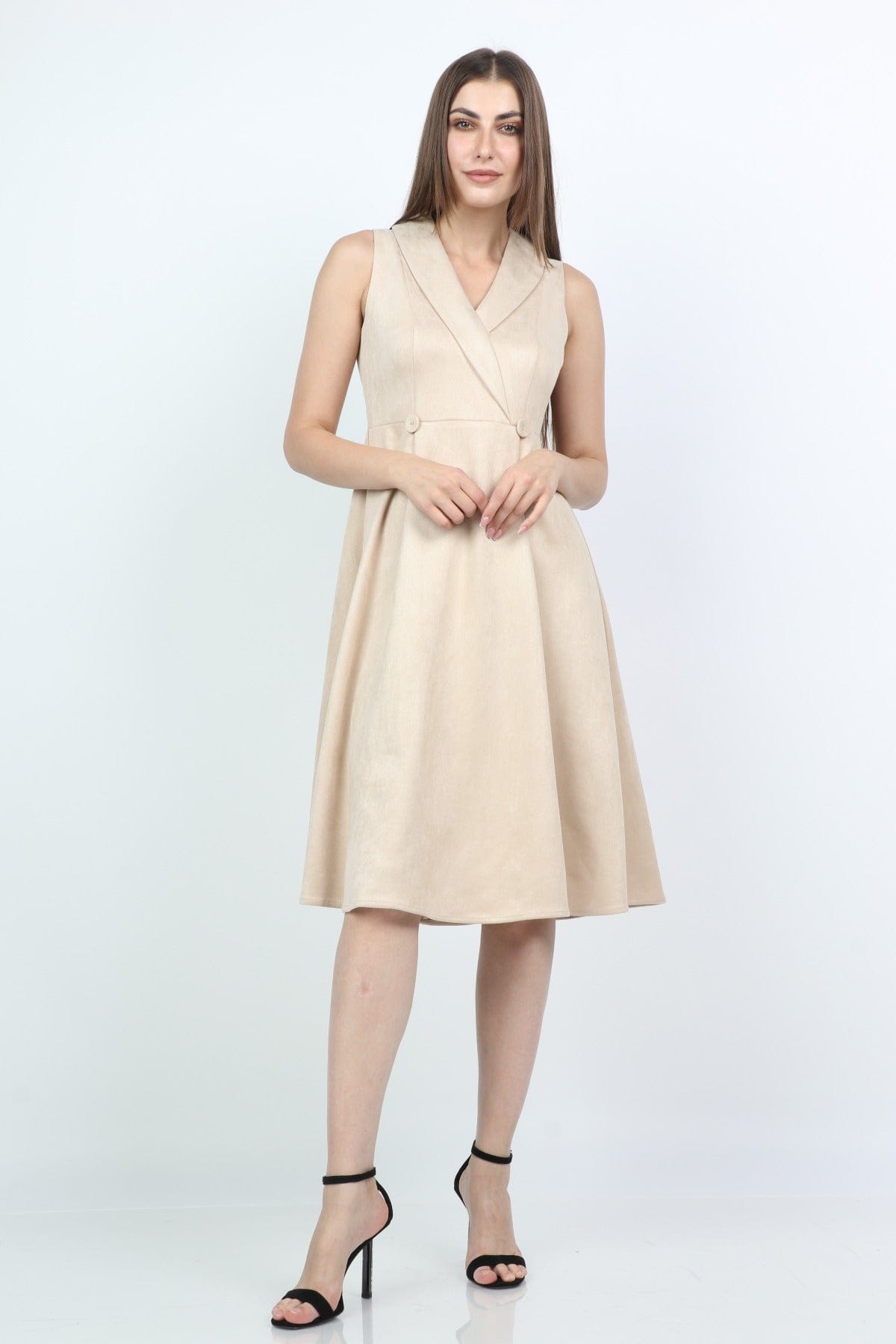 Effortlessly chic and endlessly wearable, the Beige Solid Knee-Length V-Neck Dress from Mica is a modern wardrobe essential in the Fashion SA edit. Cut in a flattering A-line silhouette with a V-neck and sleeveless profile, the regular-fit knee-length skirt skims the body for an approachable, polished look. The 95% polyester/5% elastane blend delivers wrinkle-resistant structure with a hint of stretch for all-day comfort. Unlined and pocketless with a subtle button closure, this medium-weight dress provides breathable coverage across seasons and layers beautifully under blazers for work or with sandals for weekend outings. The plain beige hue offers a neutral canvas for accessories, making it ideal for casual days, smart-casual office settings, or relaxed after-hours plans — add it to your cart at Fashion SA today.