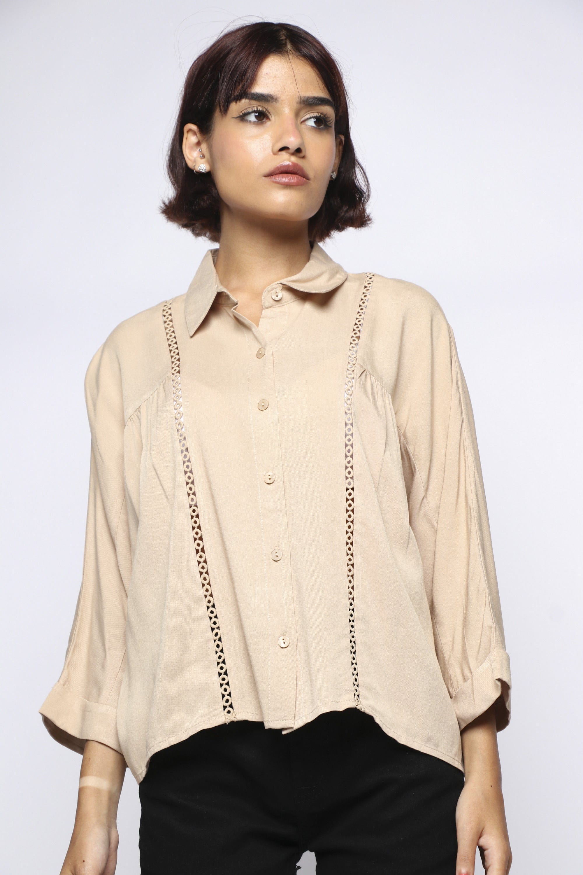 Shine bright with Mika's button-front blouse with two perforated stripes and 3/4 sleeves, designed to give you a touch of elegance and comfort. Featuring beautiful colors and distinctive details, this blouse is an ideal choice for everyday looks or special occasions. The 3/4 sleeves add a modern touch, while the perforated stripes provide a unique and distinctive look. You can easily style this blouse with jeans or a skirt for a great look. Don't miss out! Order your favorite blouse now from Fashion Saudi and enjoy your elegance! Product number: mol025721q304