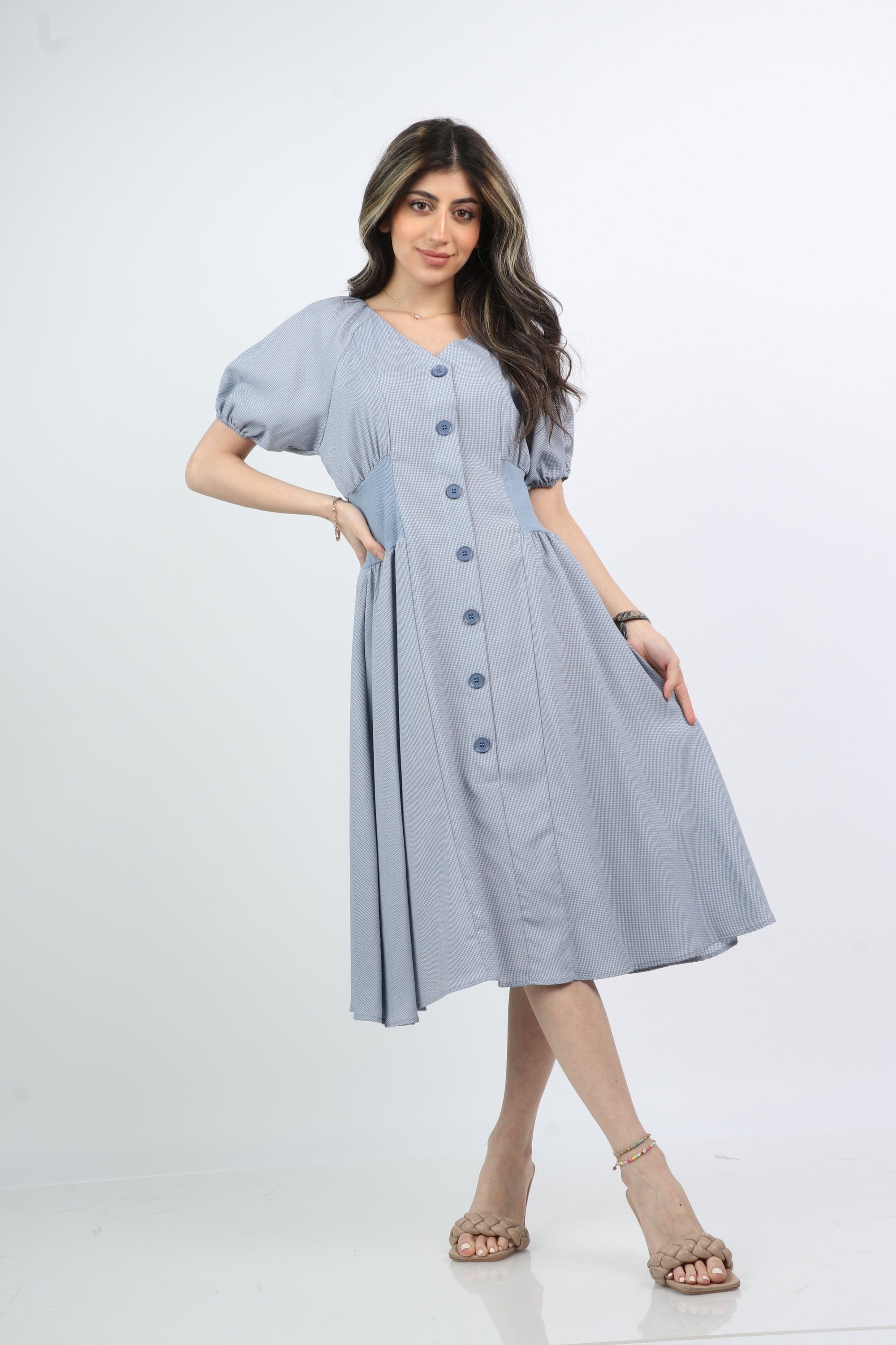 Effortlessly polished and supremely comfortable, this Gray Plain Midi Belted Dress is a wardrobe essential that balances clean lines with easy-care performance. The A-line silhouette and regular fit skim the body while the removable belt defines the waist, and the V-neck and short sleeves keep the look fresh and flattering. Crafted from a 97% polyester, 3% elastane blend, the plain gray fabric is wrinkle-resistant with a touch of stretch for all-day comfort; it's unlined and pocketless for a sleek drape. The midi length offers versatile coverage—perfect for casual weekends, office styling or travel—and a button-front closure adds subtle detail. For effortless everyday dressing, choose this modern staple from Fashion SA and shop now to elevate your neutral rotation. Order today — enjoy free returns within 3 days and speedy delivery from Fashion SA.