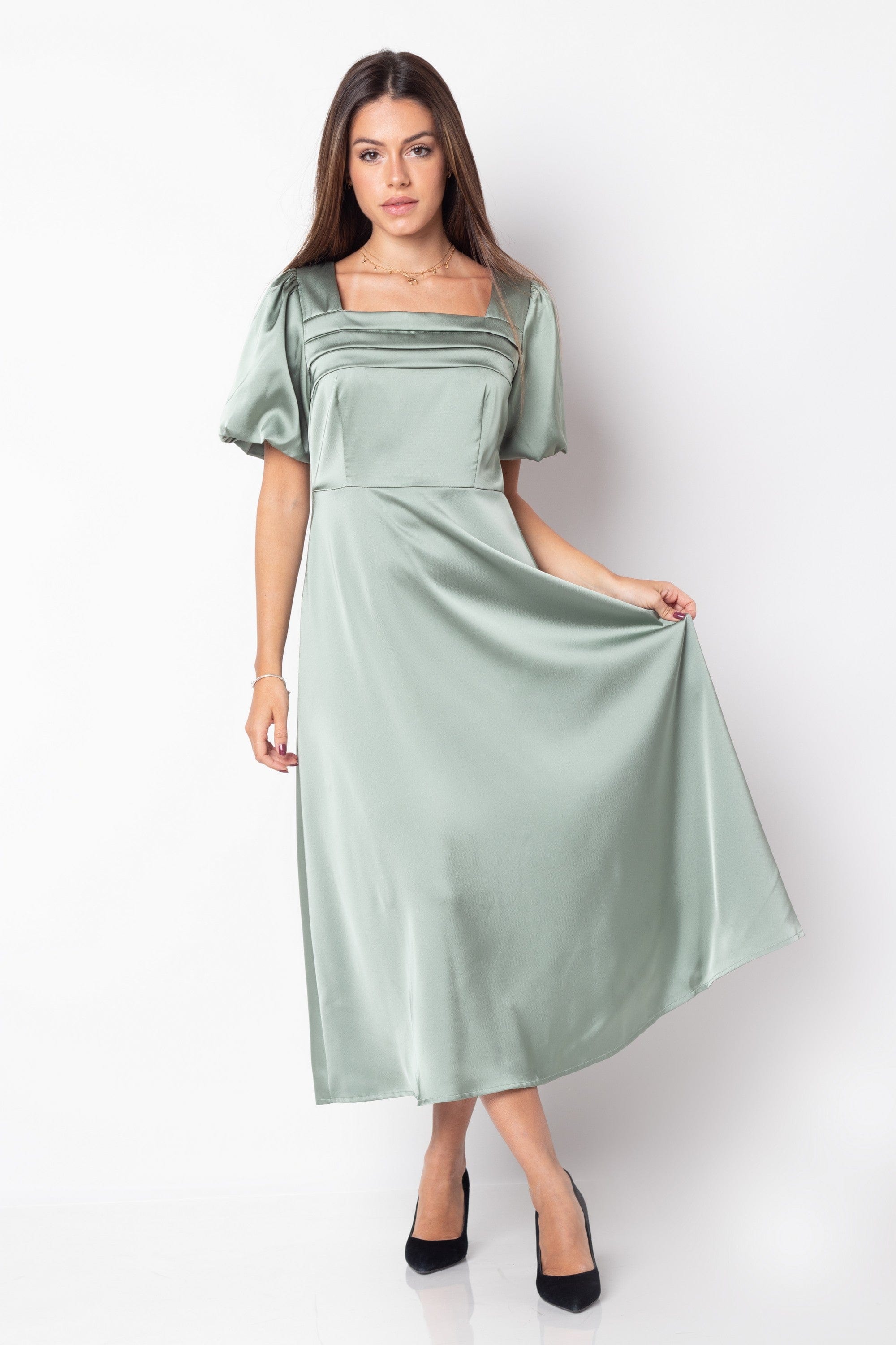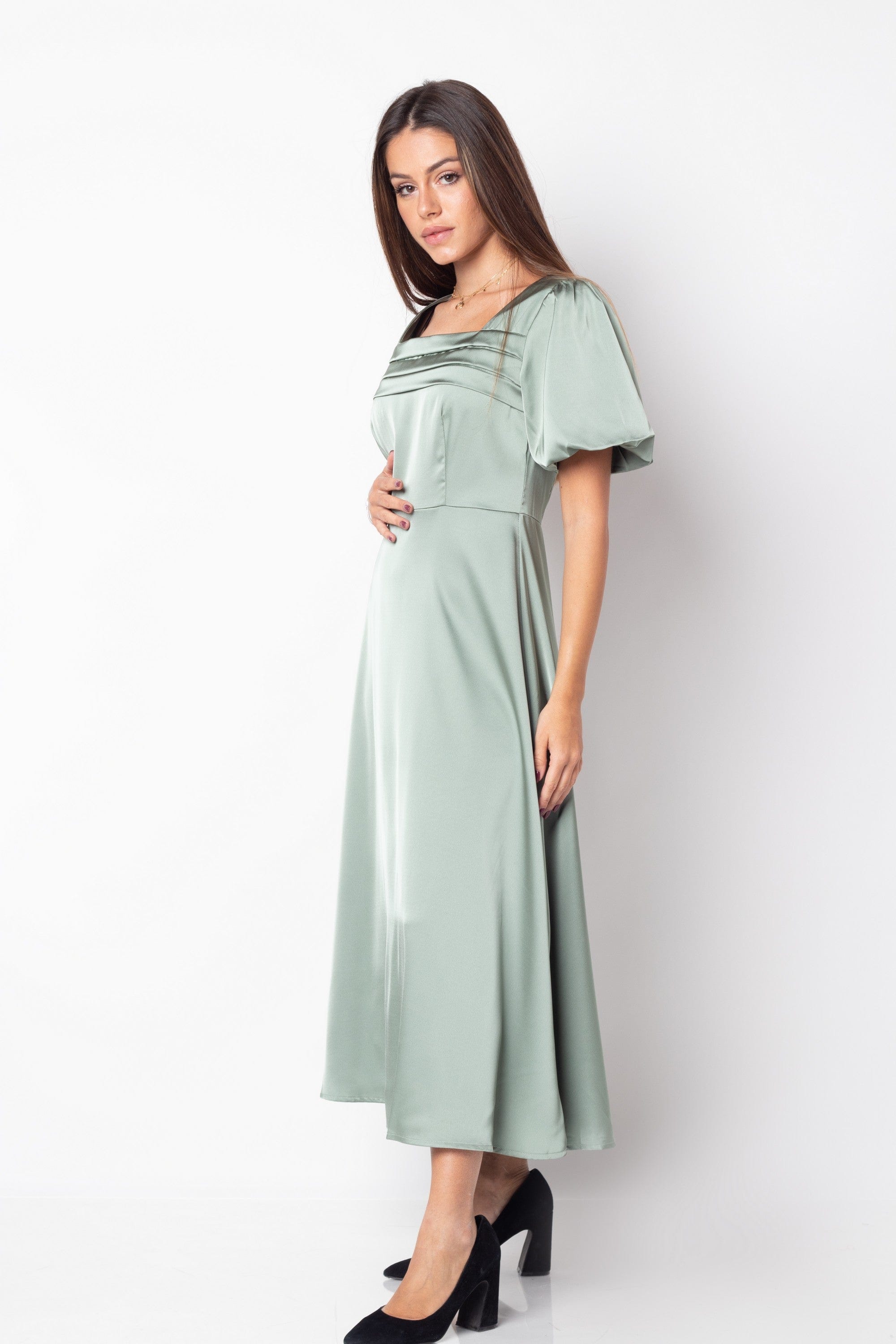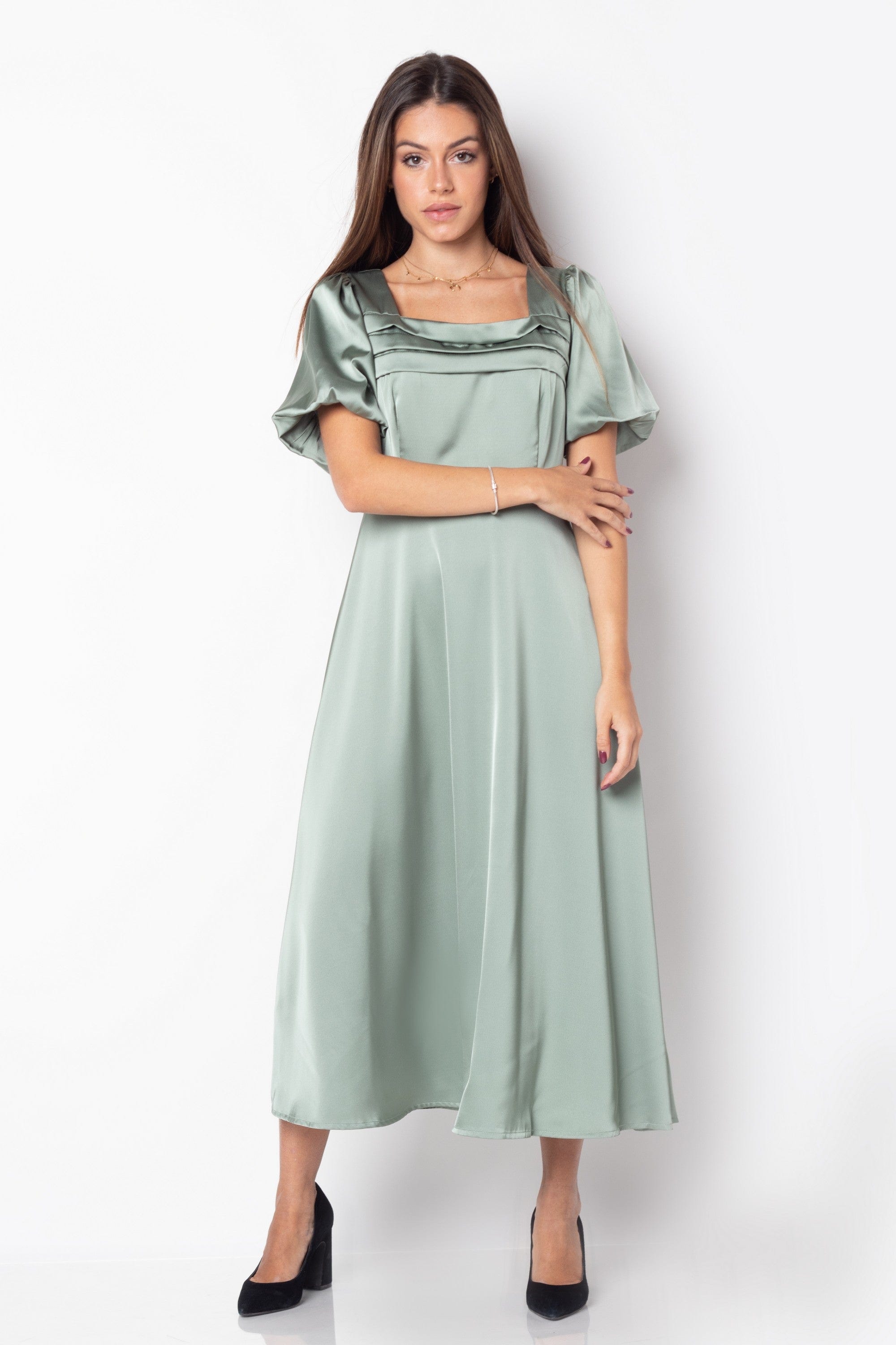 This green plain midi dress is a wardrobe essential that balances effortless style with everyday practicality. Cut in a flattering A-line silhouette from 100% polyester, the regular-fit design skims the waist and falls to a versatile midi length for polished coverage. The clean, unprinted surface and square collar create a modern, minimalist look while short sleeves and medium-weight fabric make it suitable across seasons. Unlined and pocketless for a sleek profile, the polyester composition delivers wrinkle-resistant wear and easy-care performance — perfect for busy days. Wear it casually with sneakers and a denim jacket, or dress it up with heels and a lightweight blazer for meetings or dinners. Discover this versatile piece at Fashion SA and add a dependable, stylish staple to your rotation today.