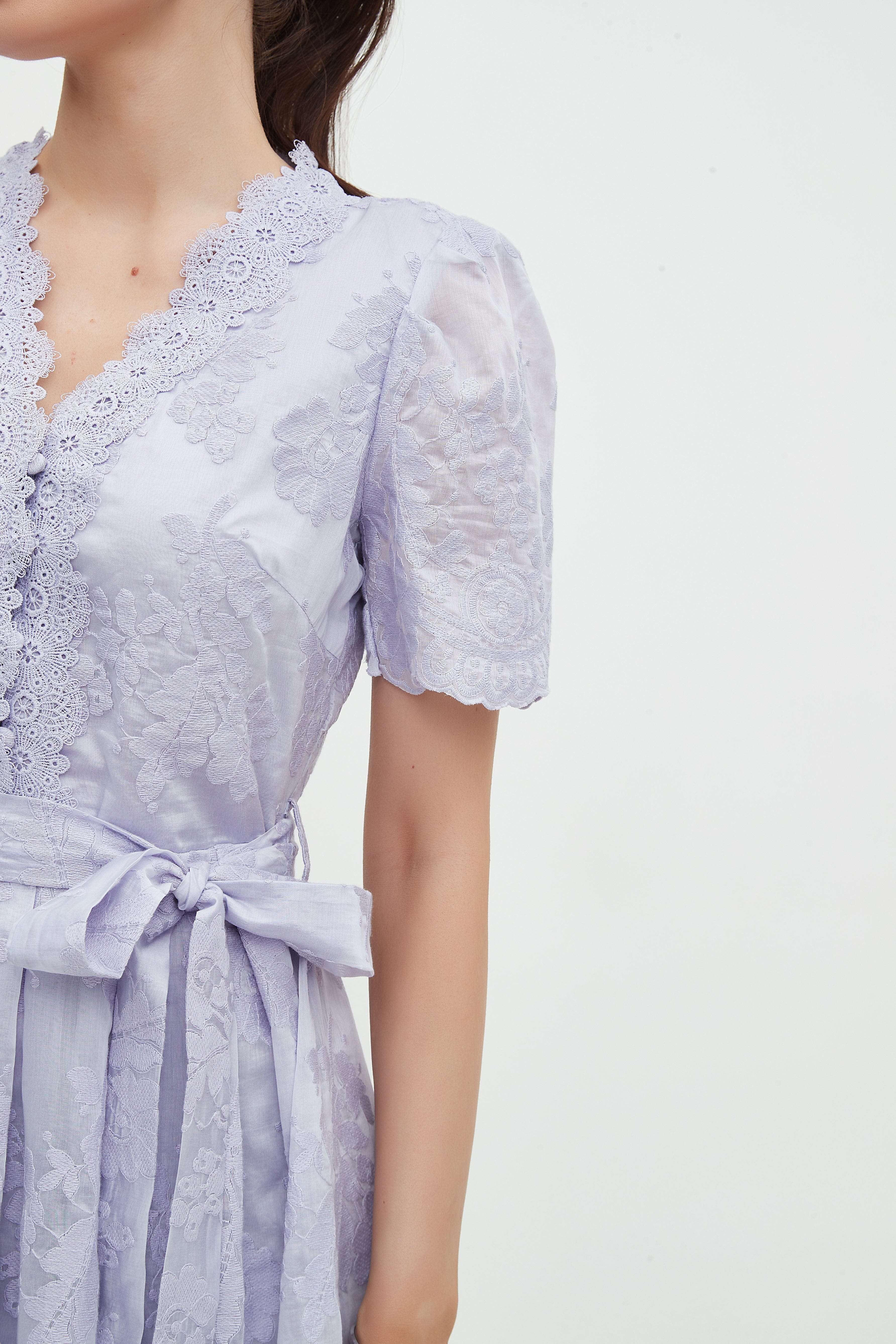 - Embroidered floral pattern with V-neck and button closure for feminine detail