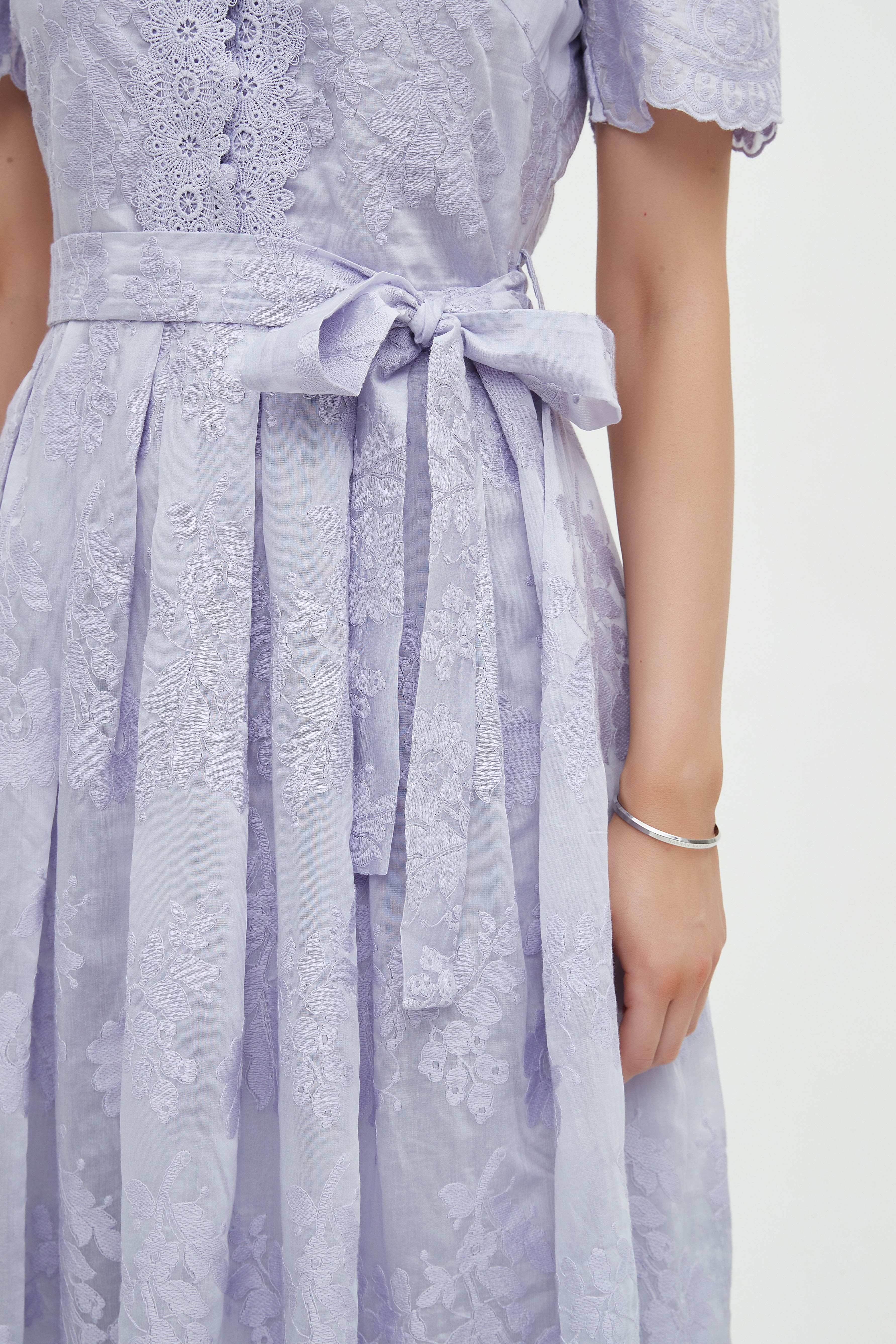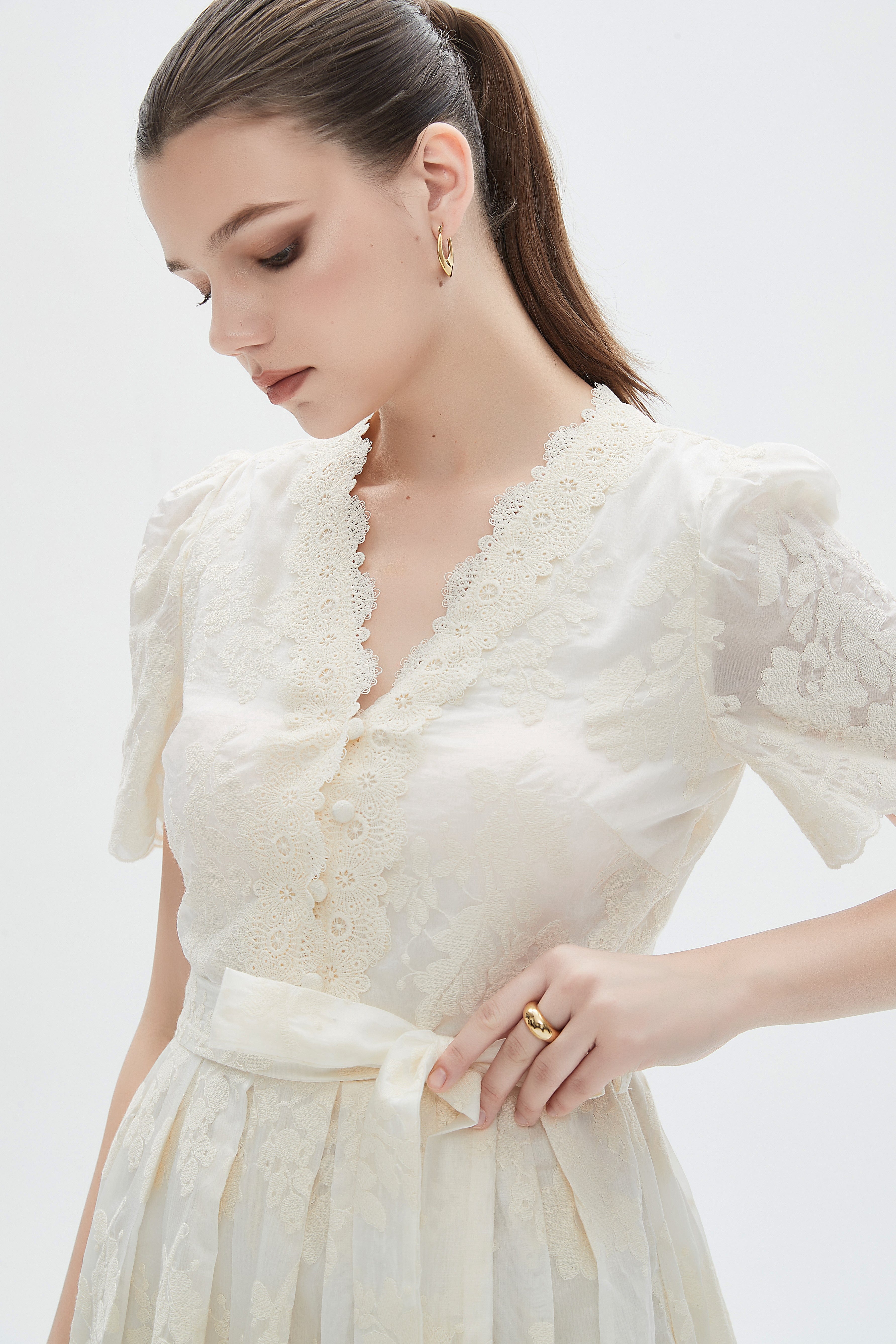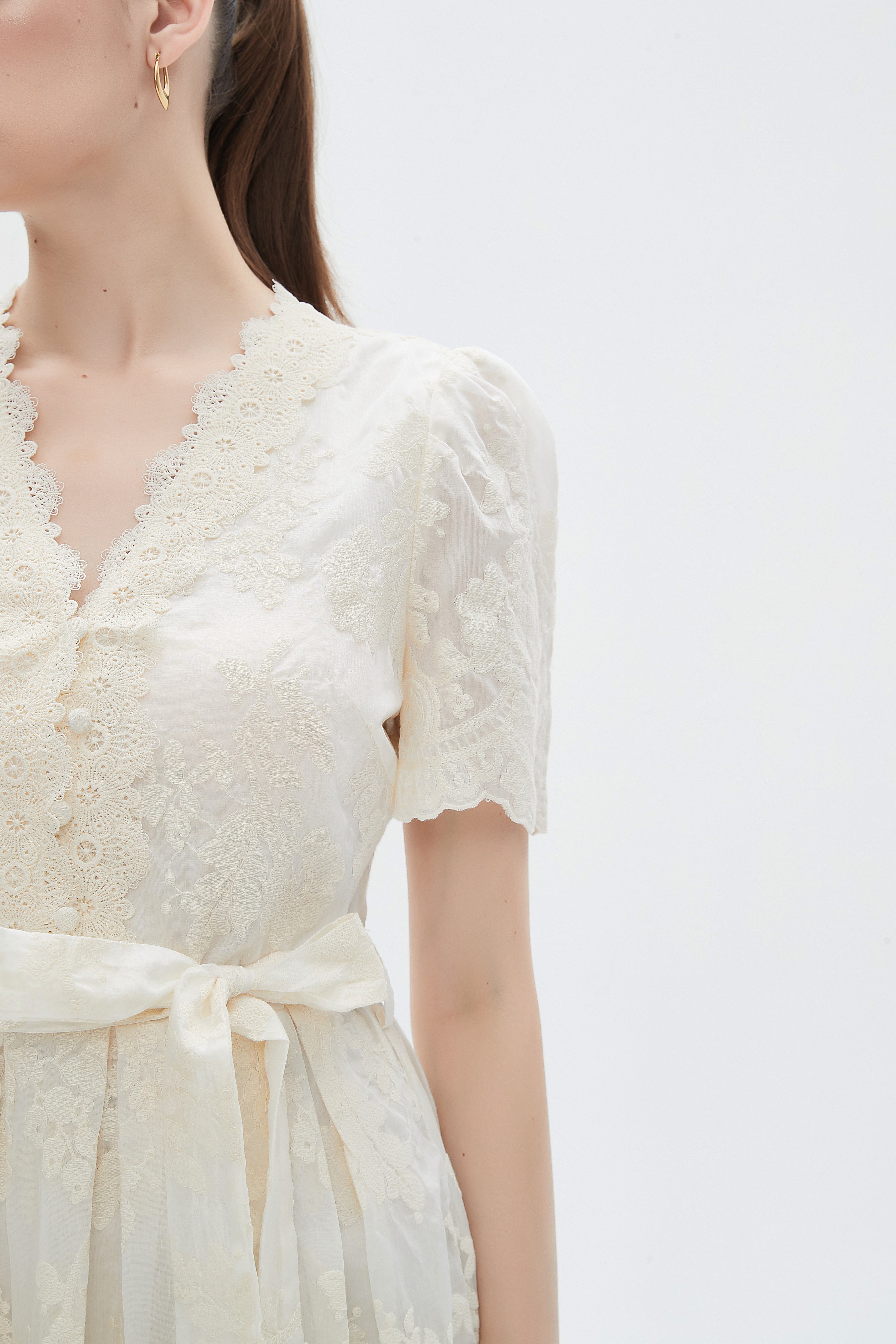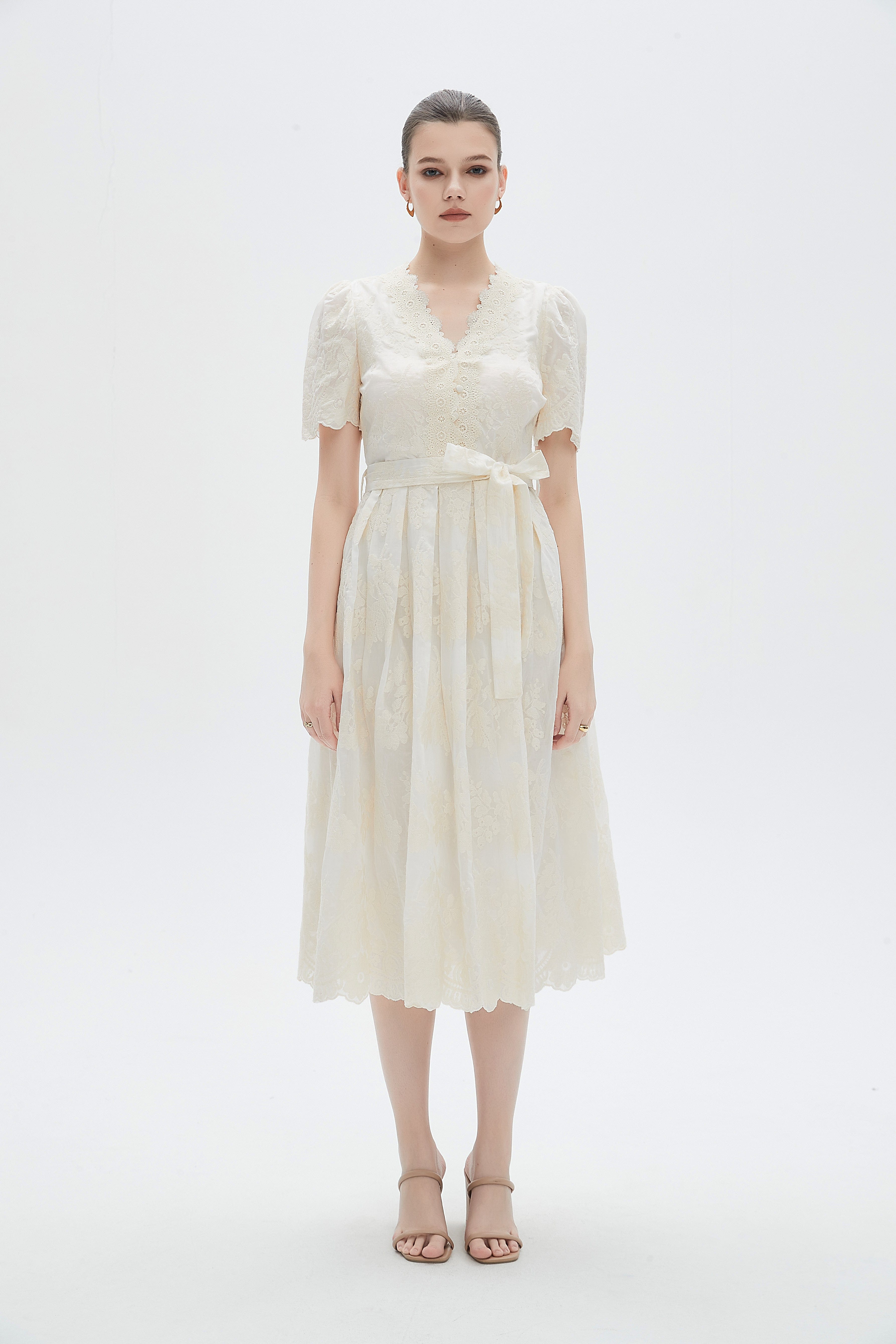 This cream floral midi belted dress from Mica is an effortless spring-to-autumn staple that flatters with feminine embroidery and easy everyday wearability. Cut in a flattering A-line silhouette and finished at a midi length, the dress skims the body in a regular fit while the self-tie belt defines the waist for a polished hourglass shape. Made from 100% polyester with medium weight for smooth drape and wrinkle-resistant ease, the unlined construction keeps the look light and comfortable for casual outings. Short sleeves and a V-neck with button closure add approachable, wearable detail, while embroidered floral motifs bring romantic texture. Pocketless yet practical, this versatile piece transitions from brunch to office-casual with simple accessories. Shop this Cream Floral Midi Belted Dress at Fashion SA and add a timeless, easy-to-style favorite to your wardrobe today.