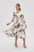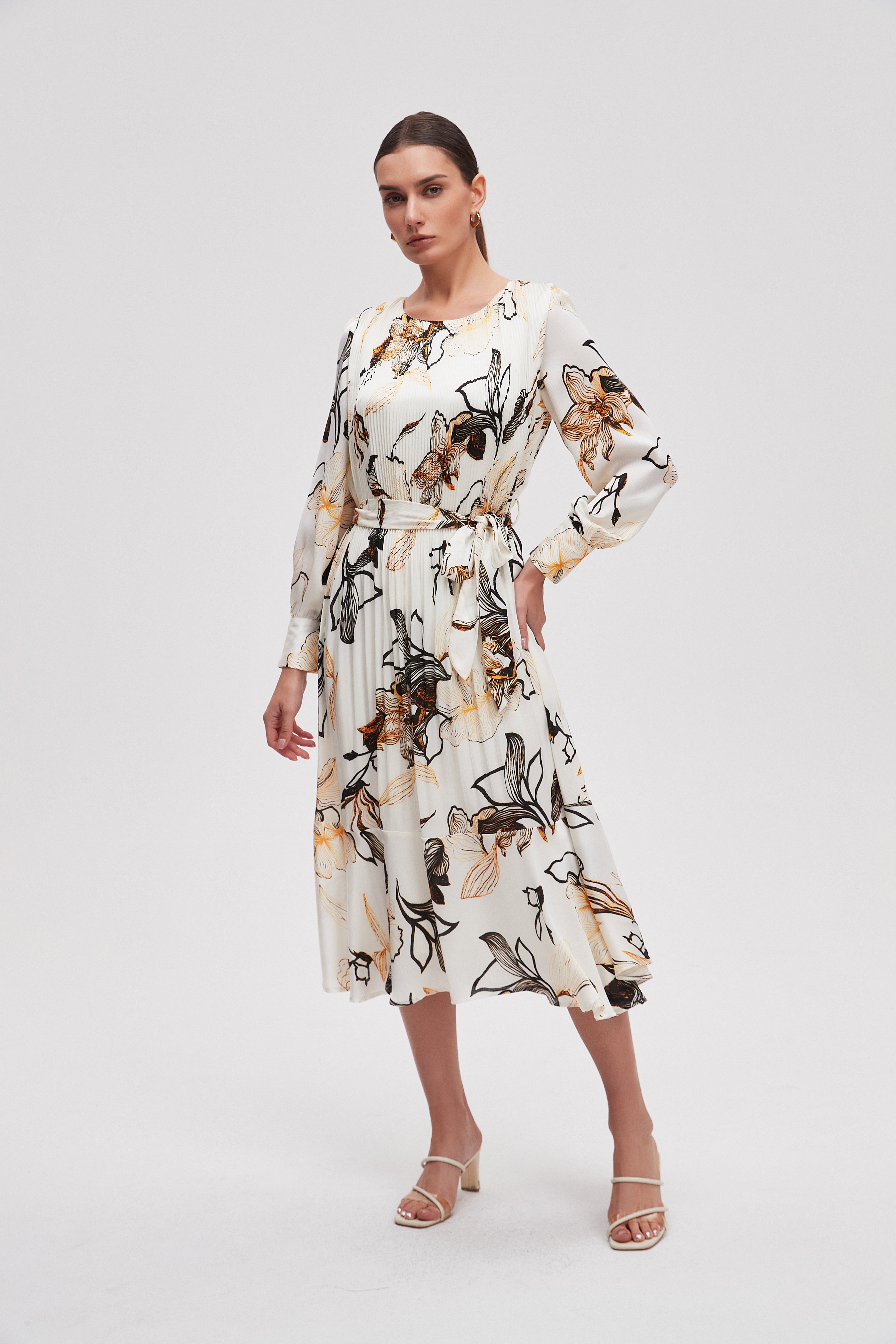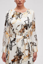 Printed Long Sleeve Midi Dress with Belt