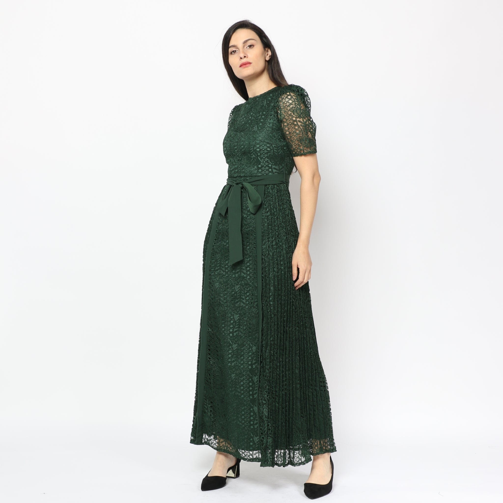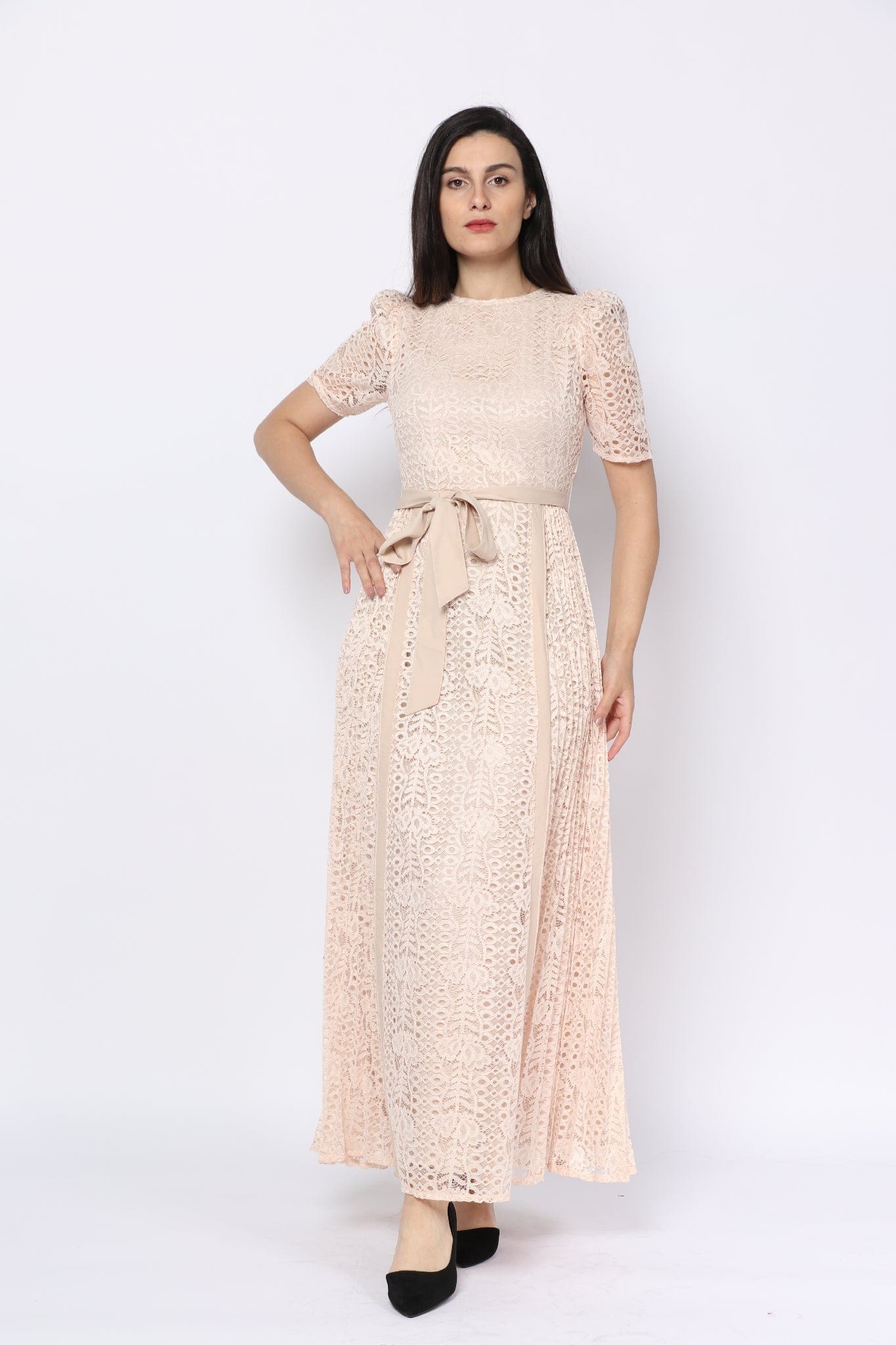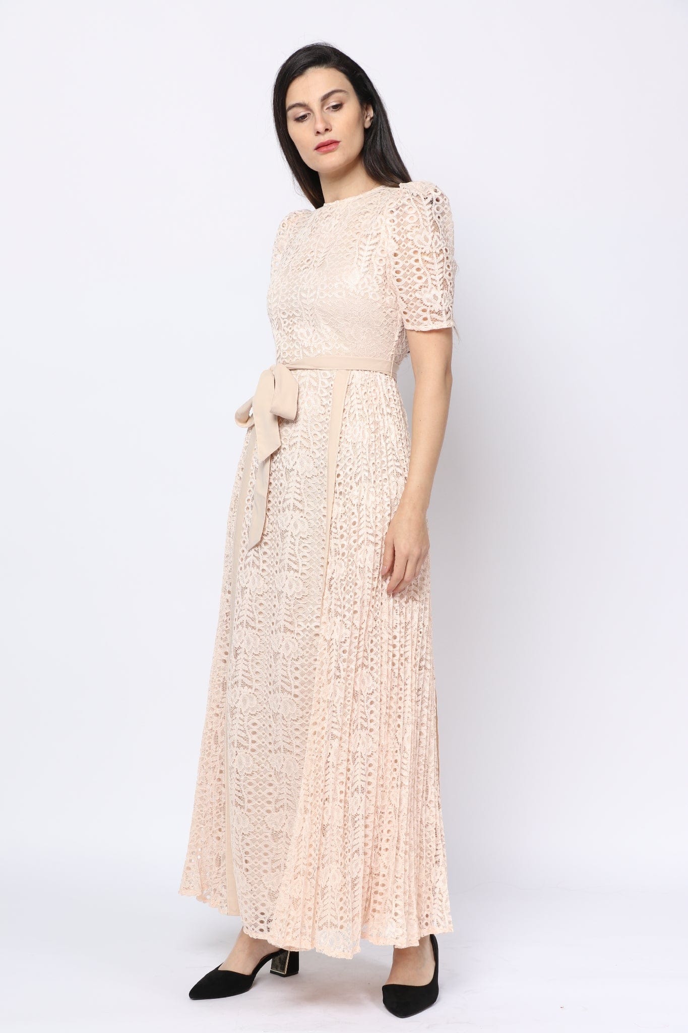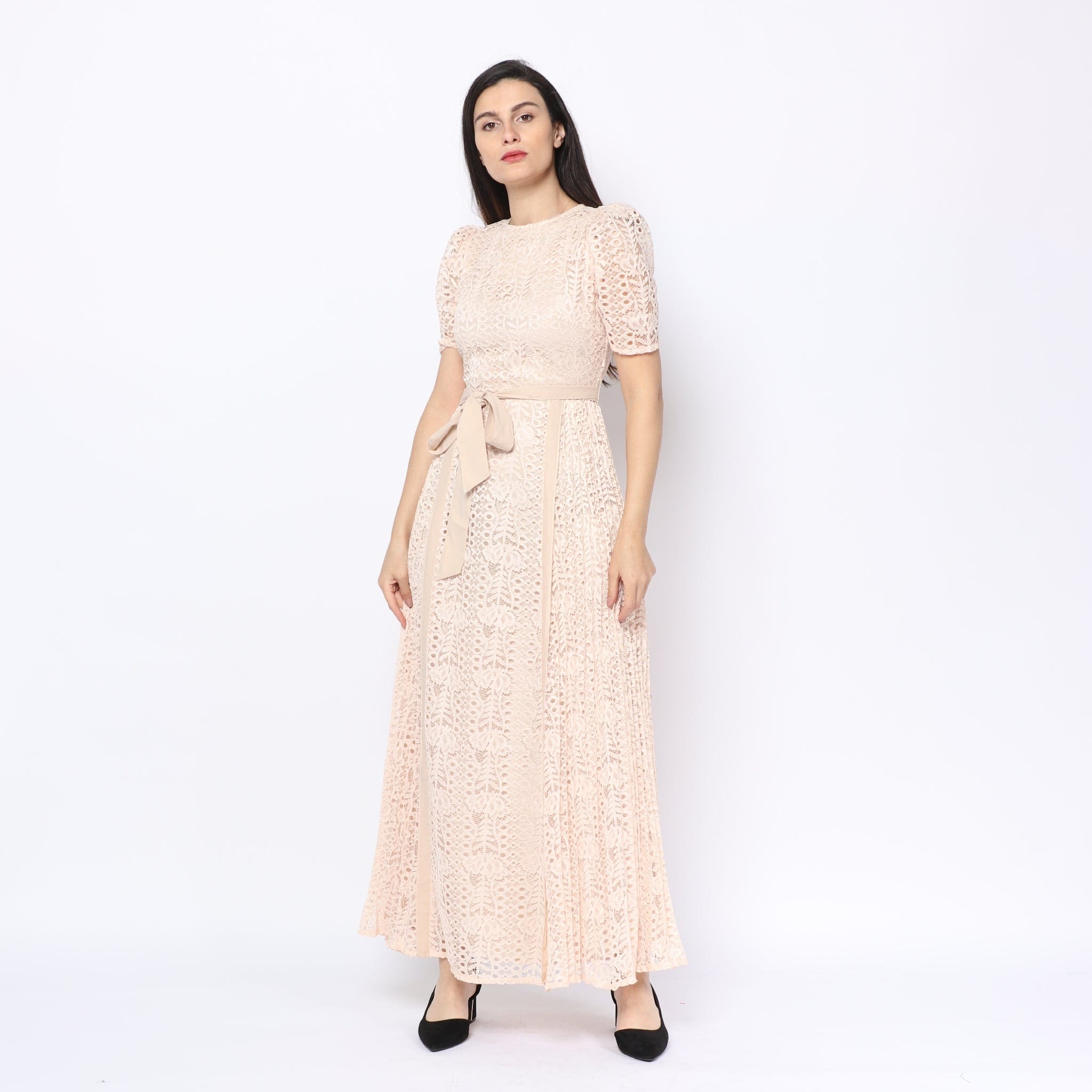 Short-Sleeve Lace Maxi Dress with Waist Belt
