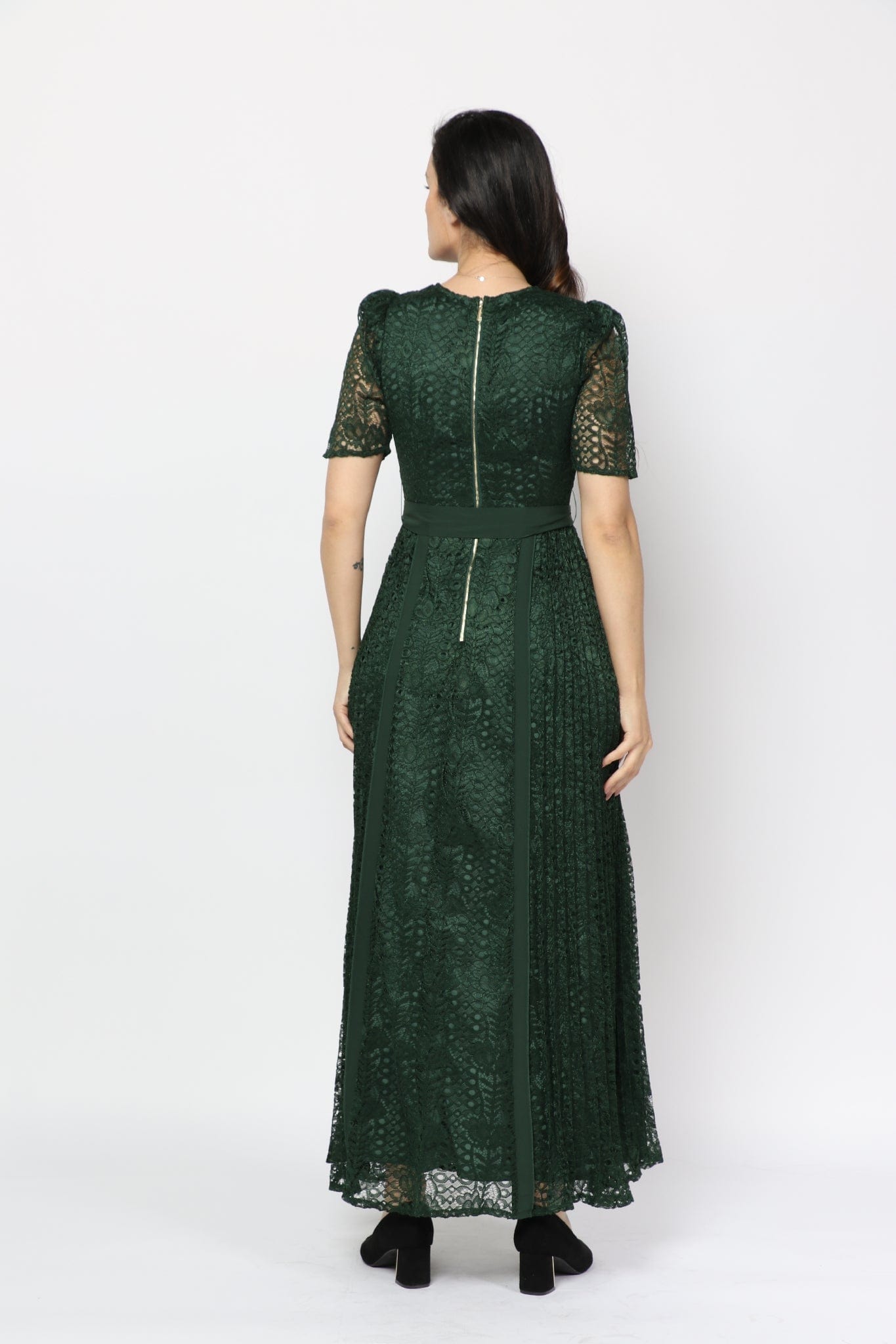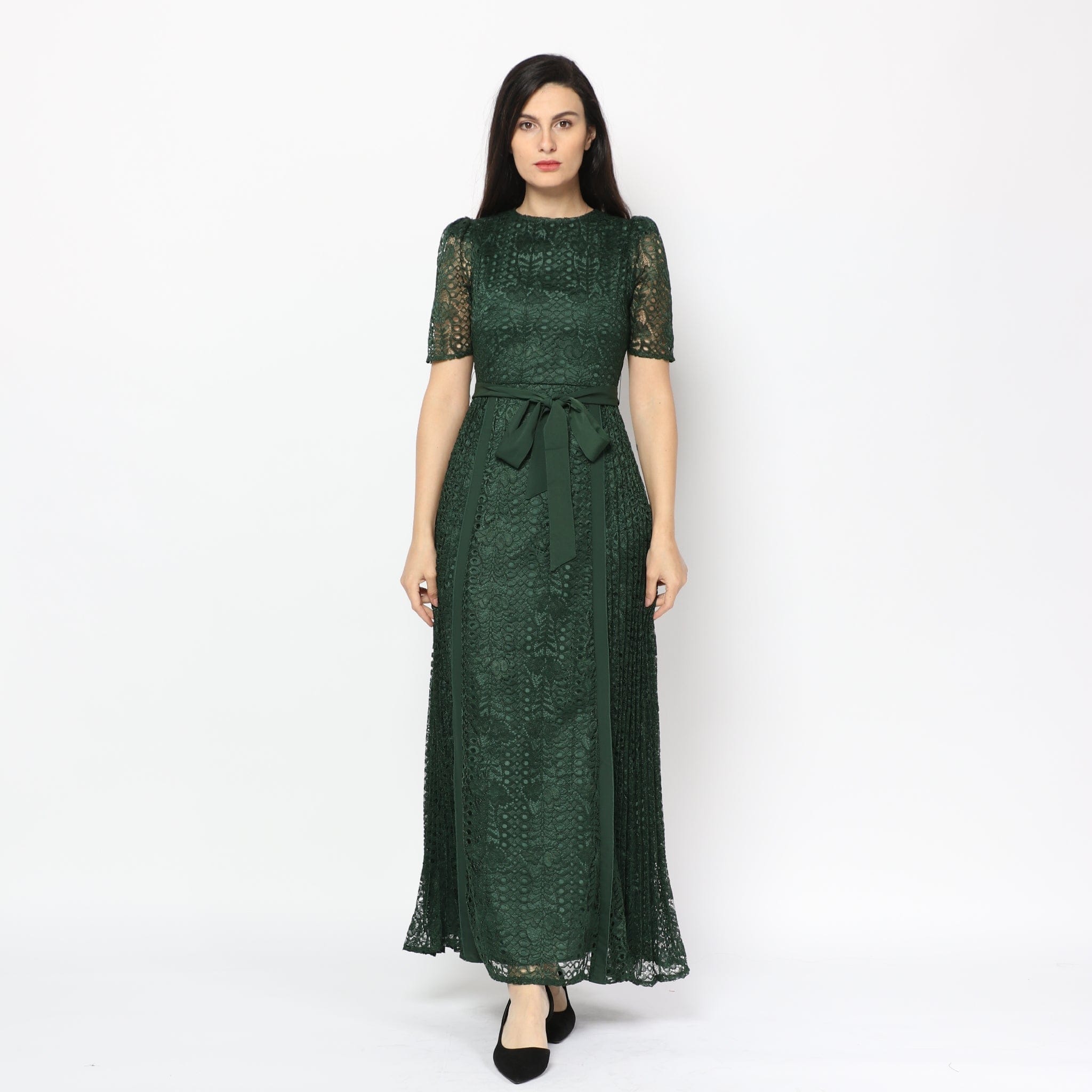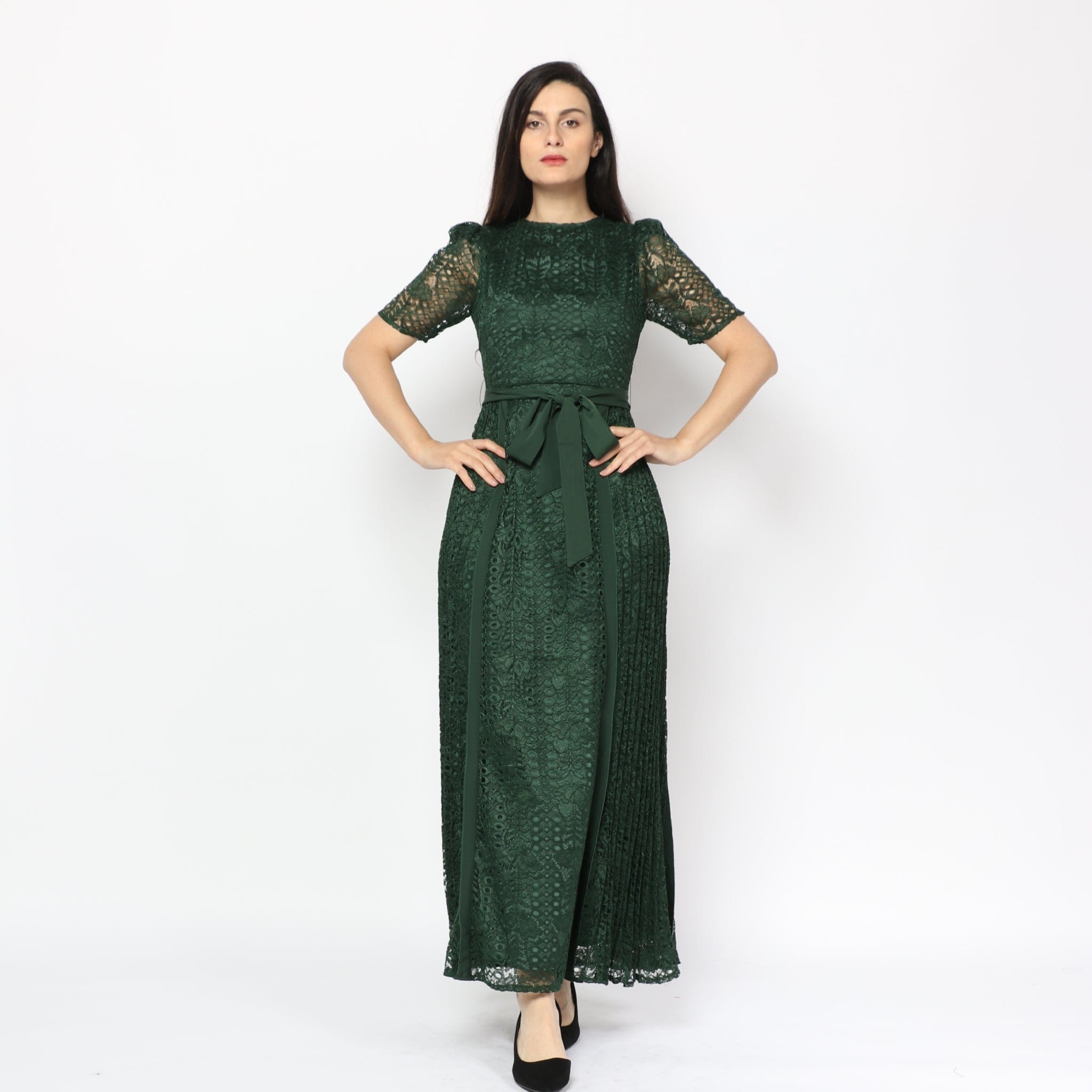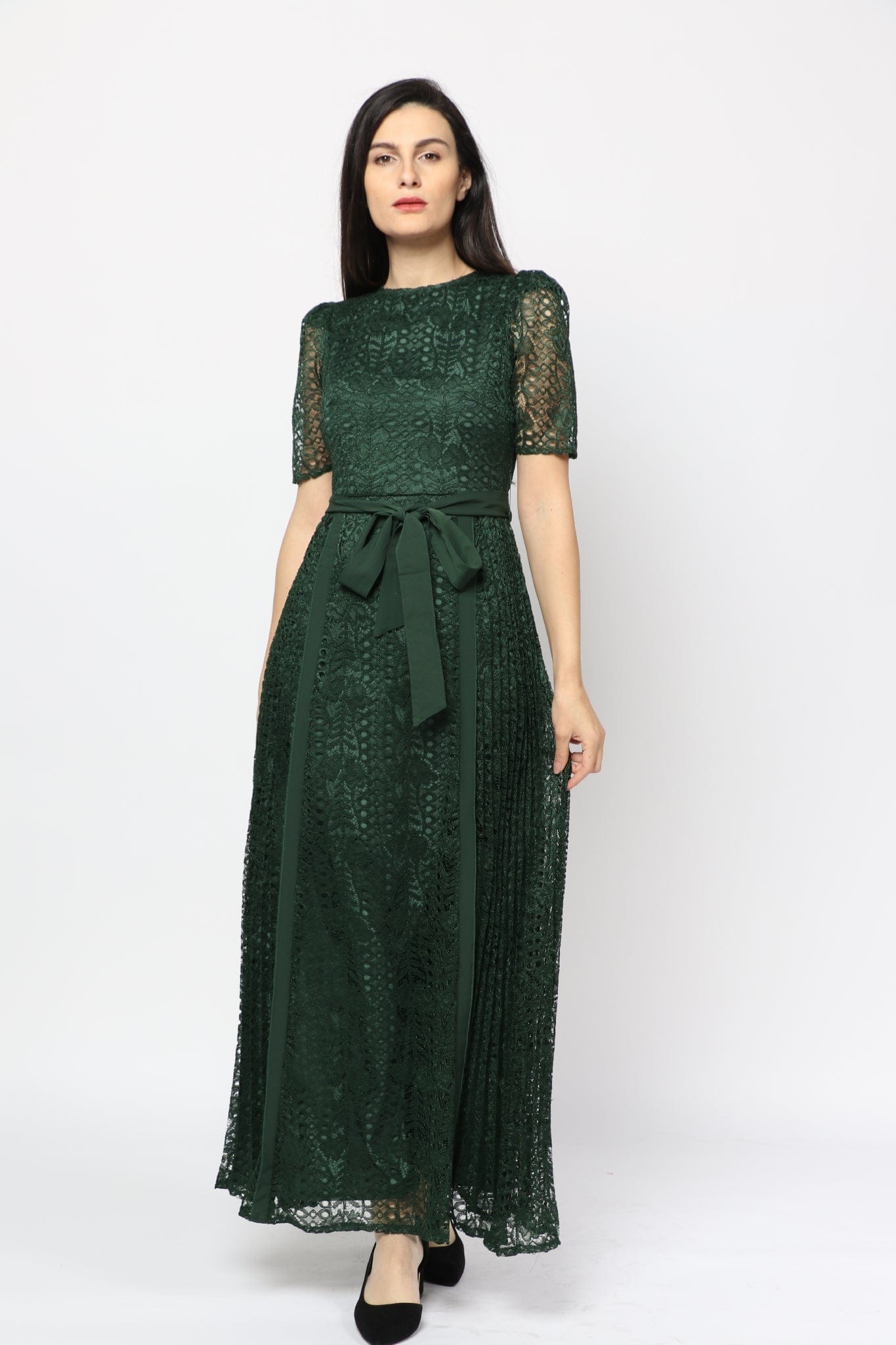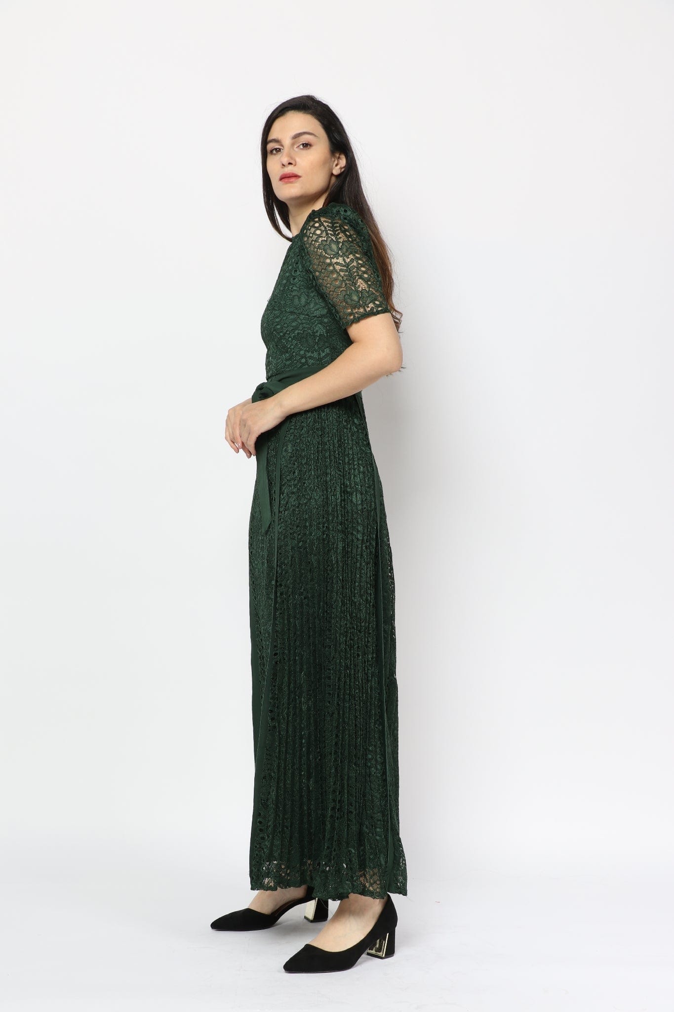Short-Sleeve Lace Maxi Dress with Waist Belt