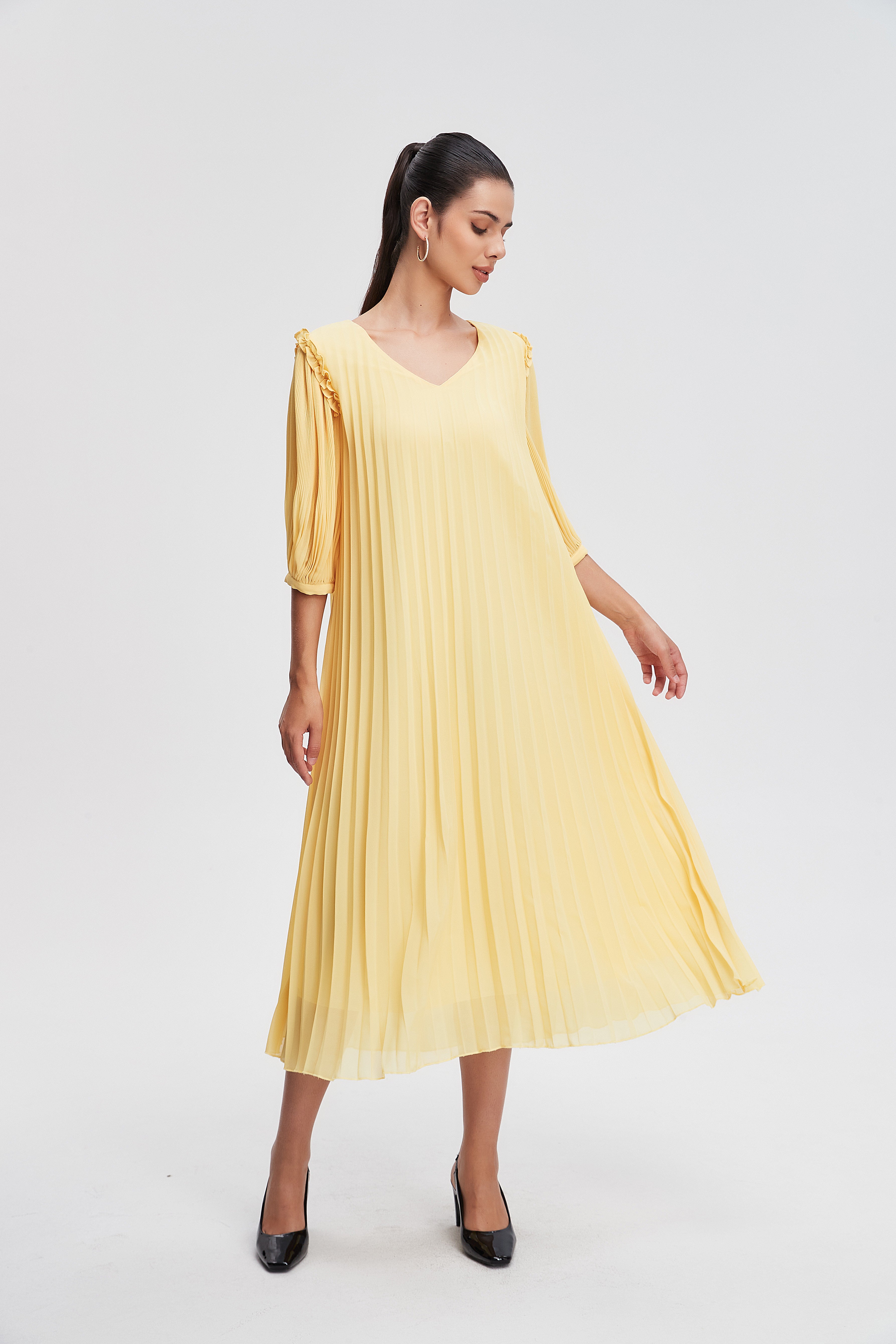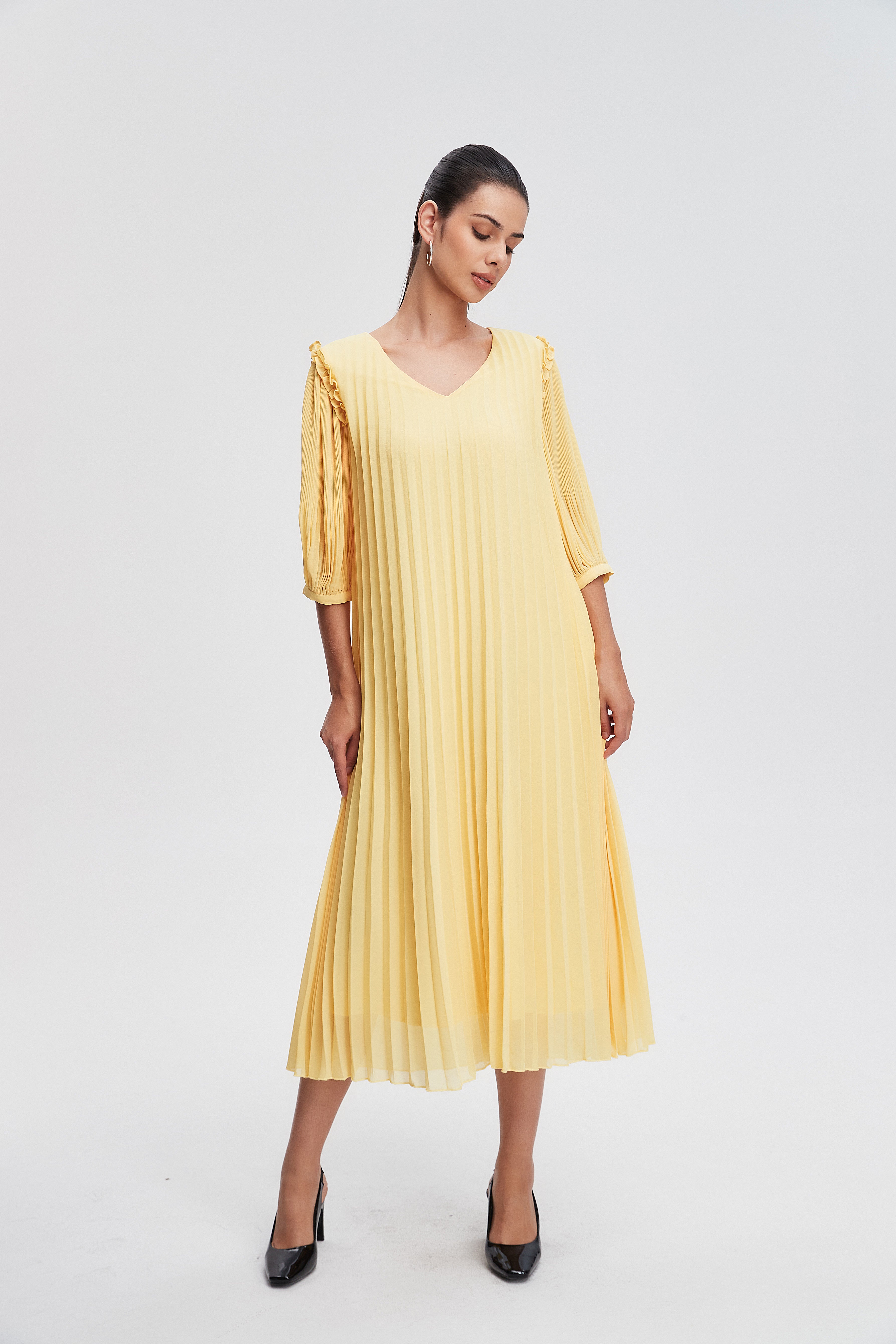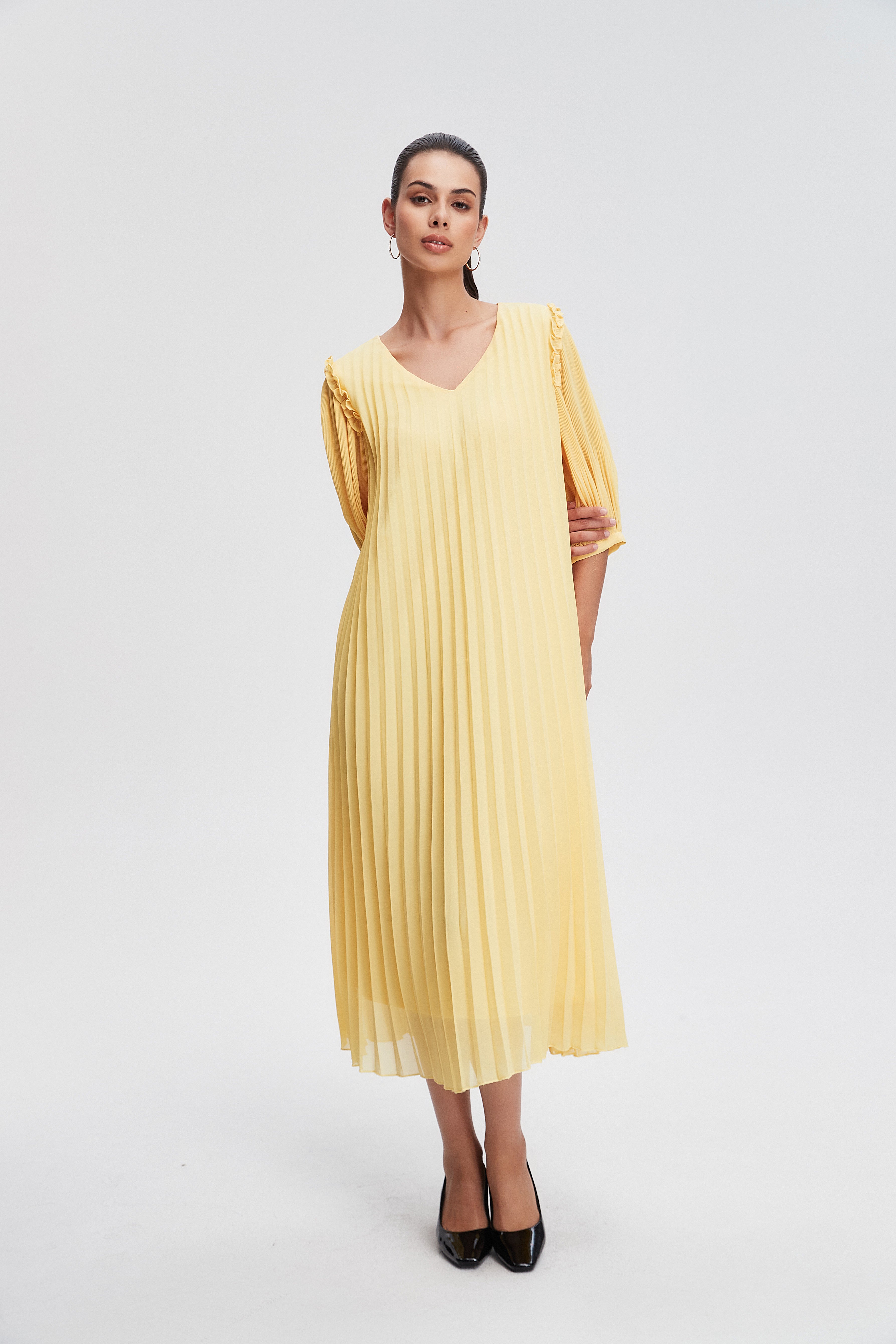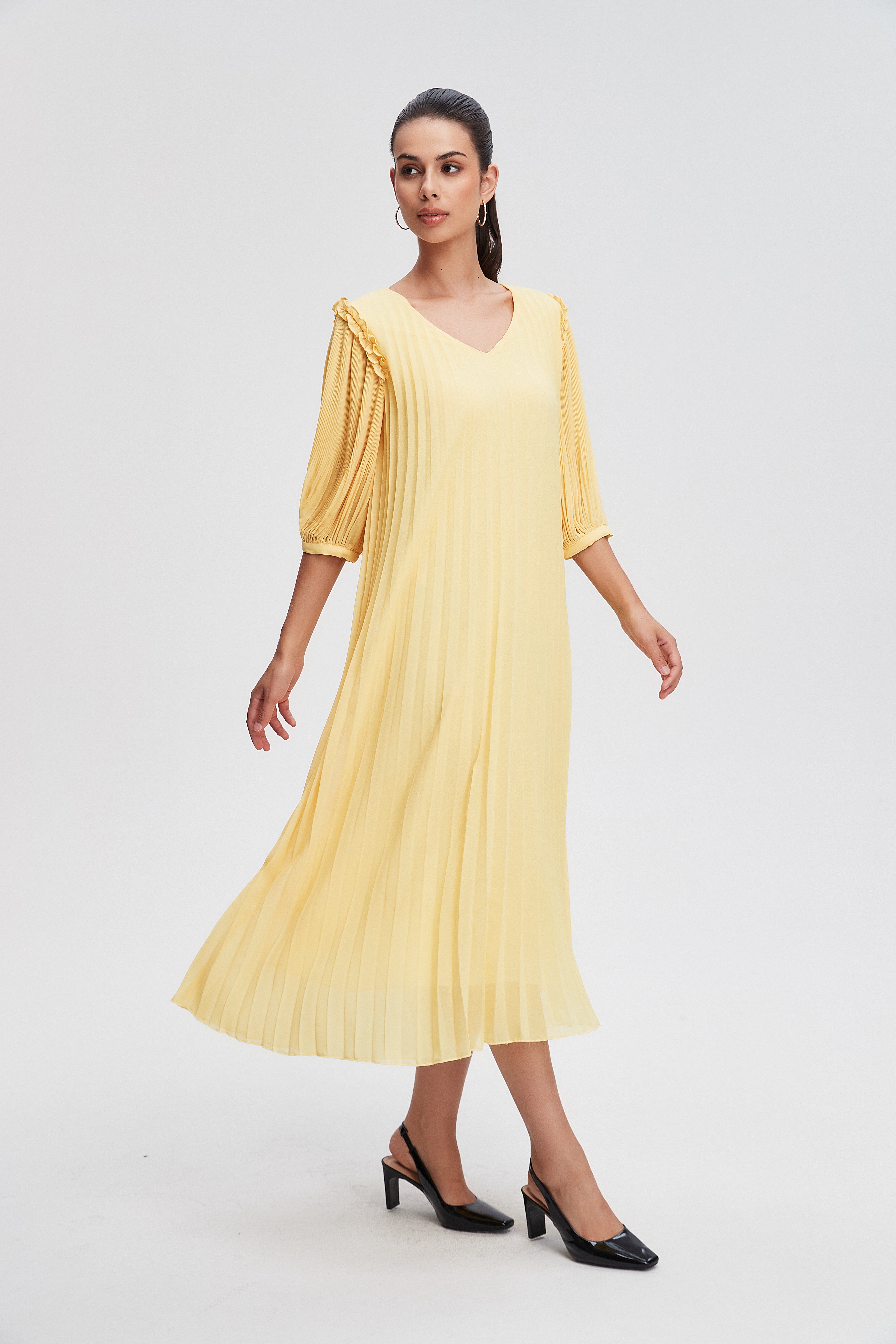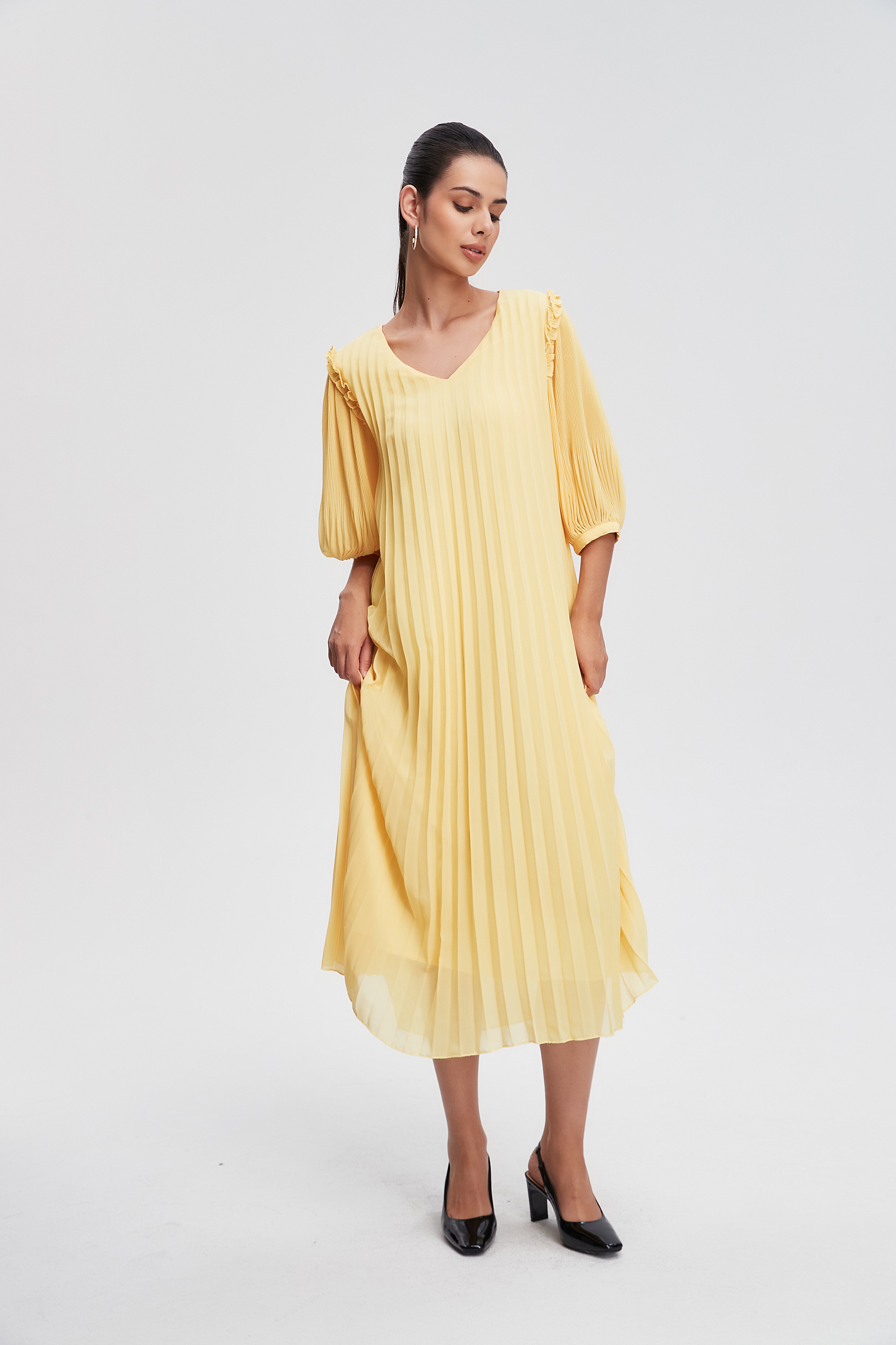Capture the essence of effortless elegance with our knee-length floral ruffled dress. Designed for the modern woman, this dress features a flattering V-neckline that beautifully frames your silhouette. The wide long sleeves add a touch of sophistication while providing comfort for any occasion. The playful ruffles cascade down the skirt, creating a delightful movement with every step. Perfect for brunches, picnics, or casual outings, this dress pairs wonderfully with sandals or heels. Product Number: wz95723q202