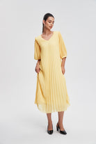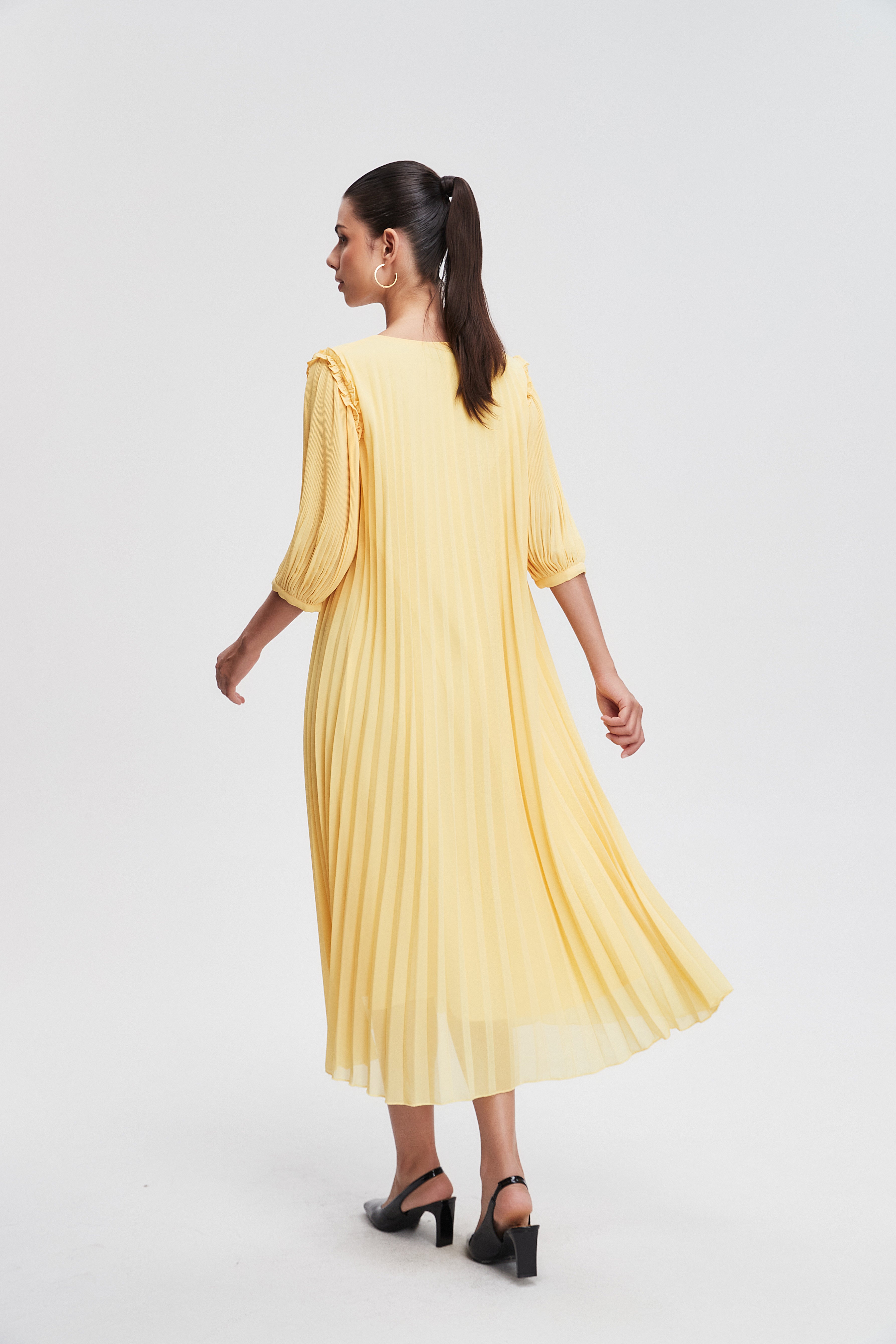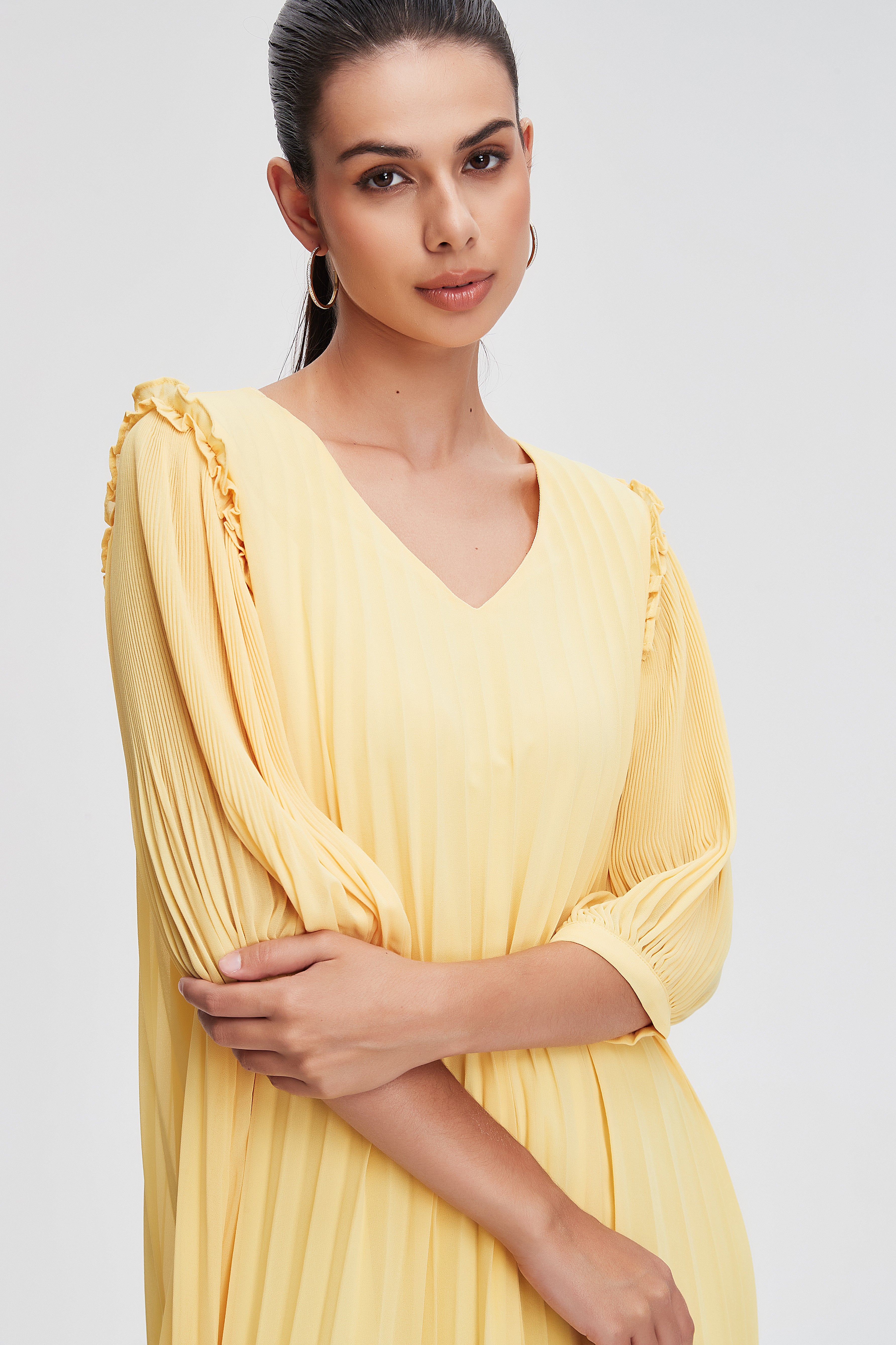 knee-length floral ruffled dress with a V-neck and wide long sleeves