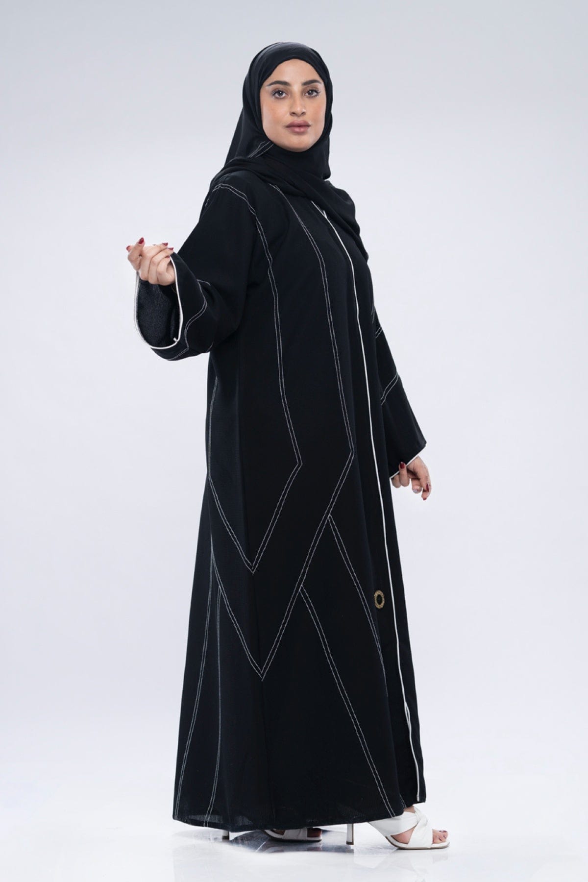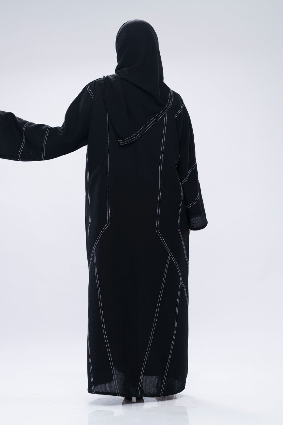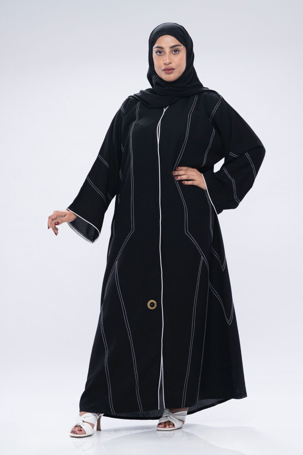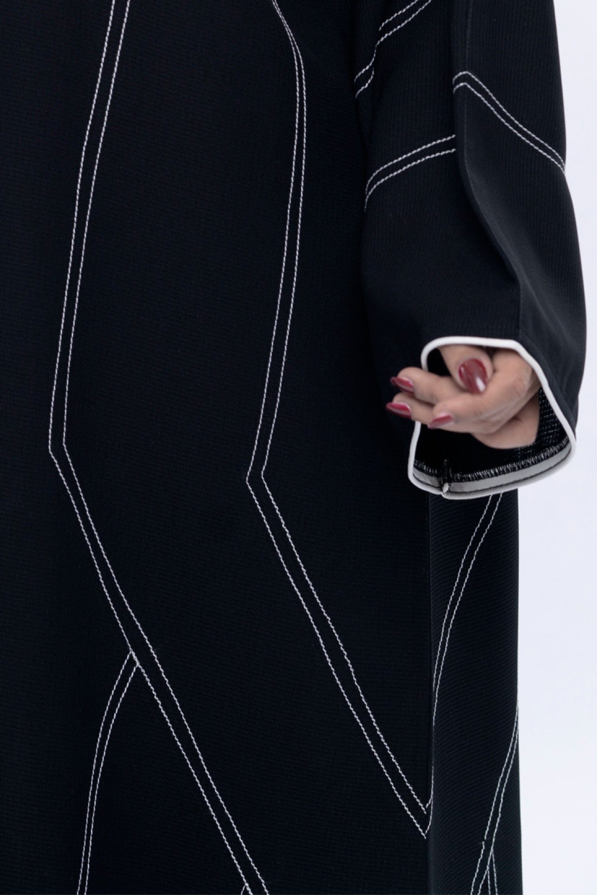 عباية كتان سوداء كلاسيك مخططة بطريز بالطول كم طويل
