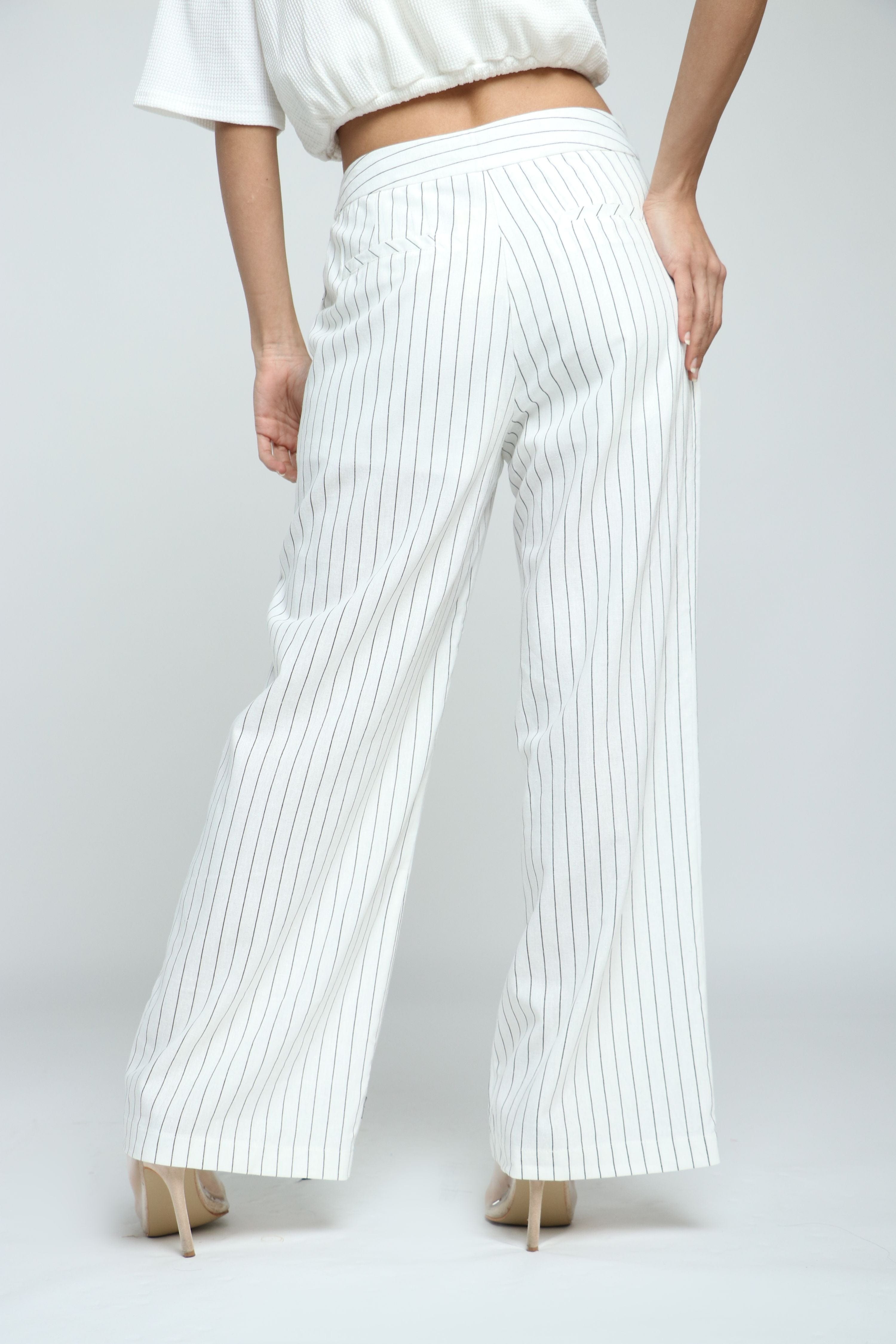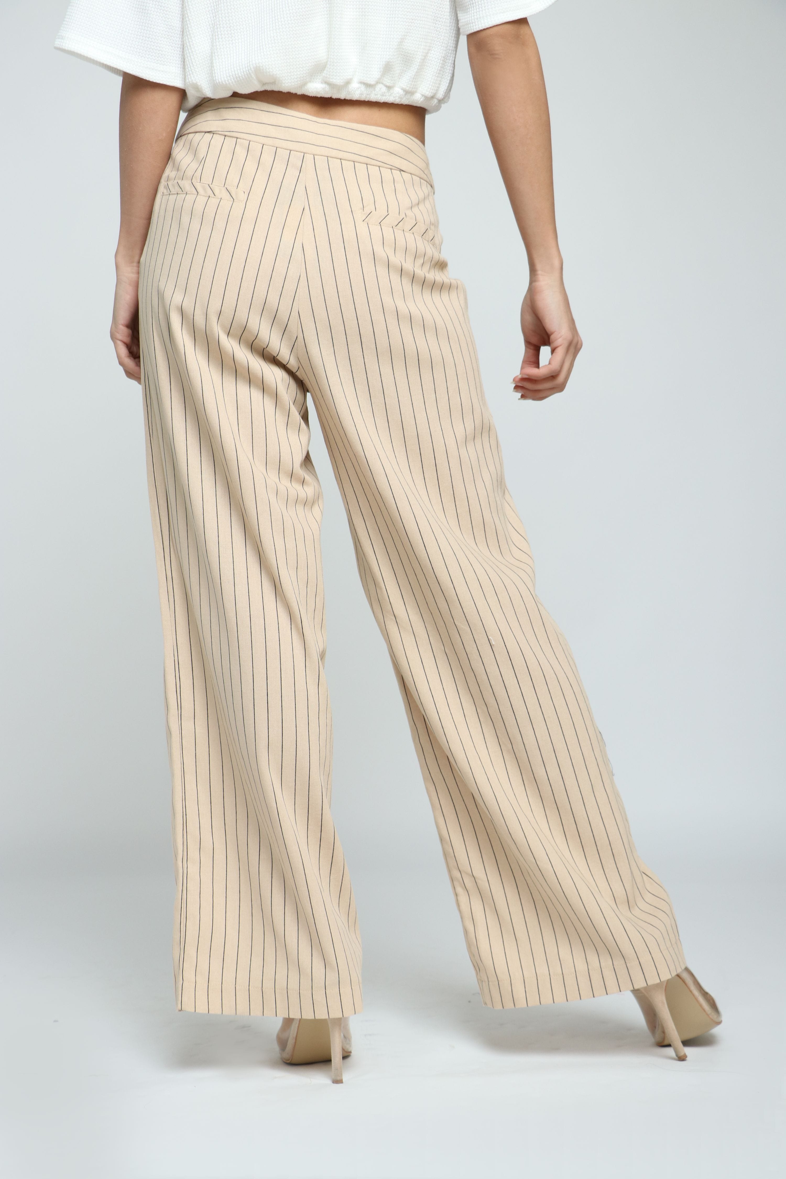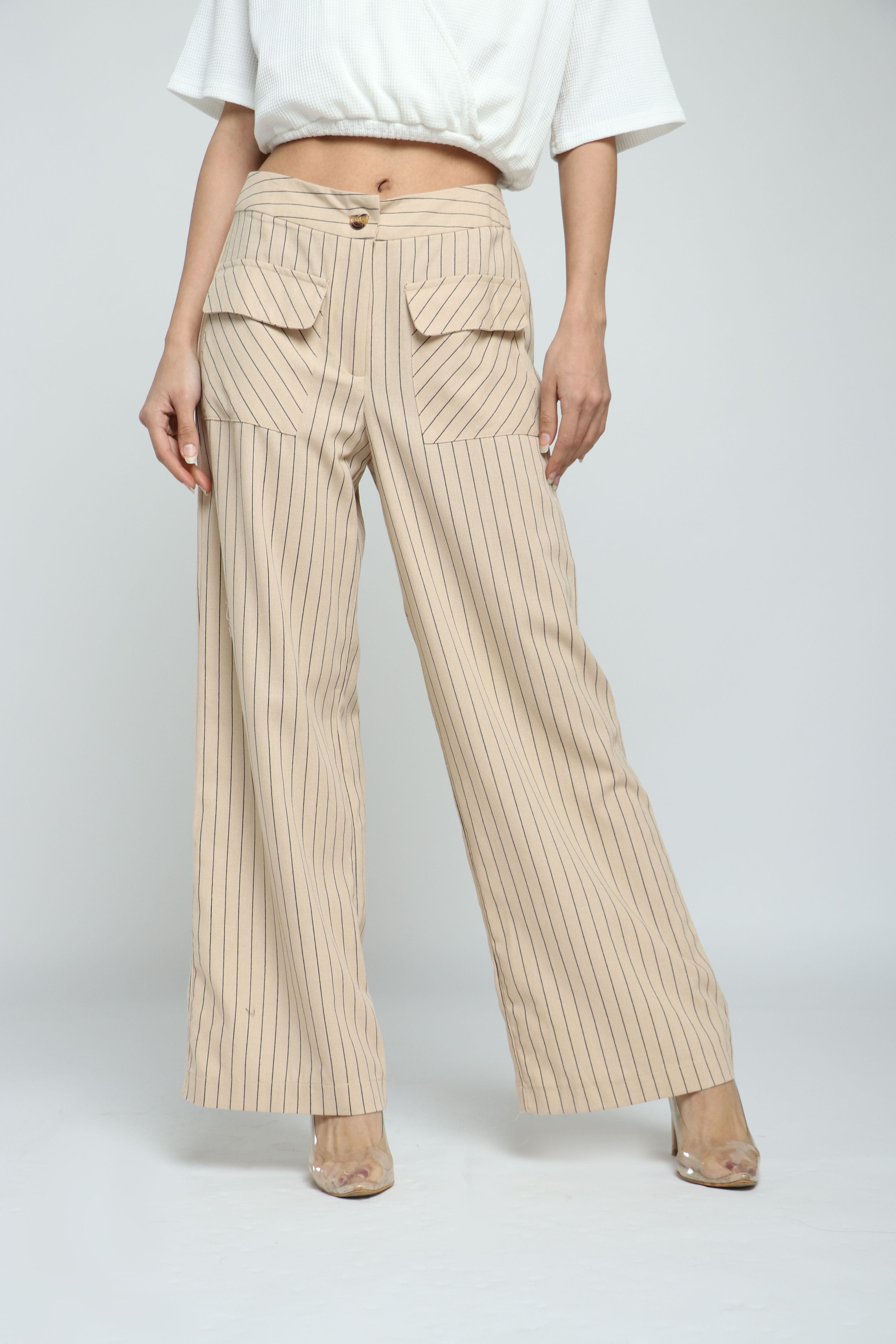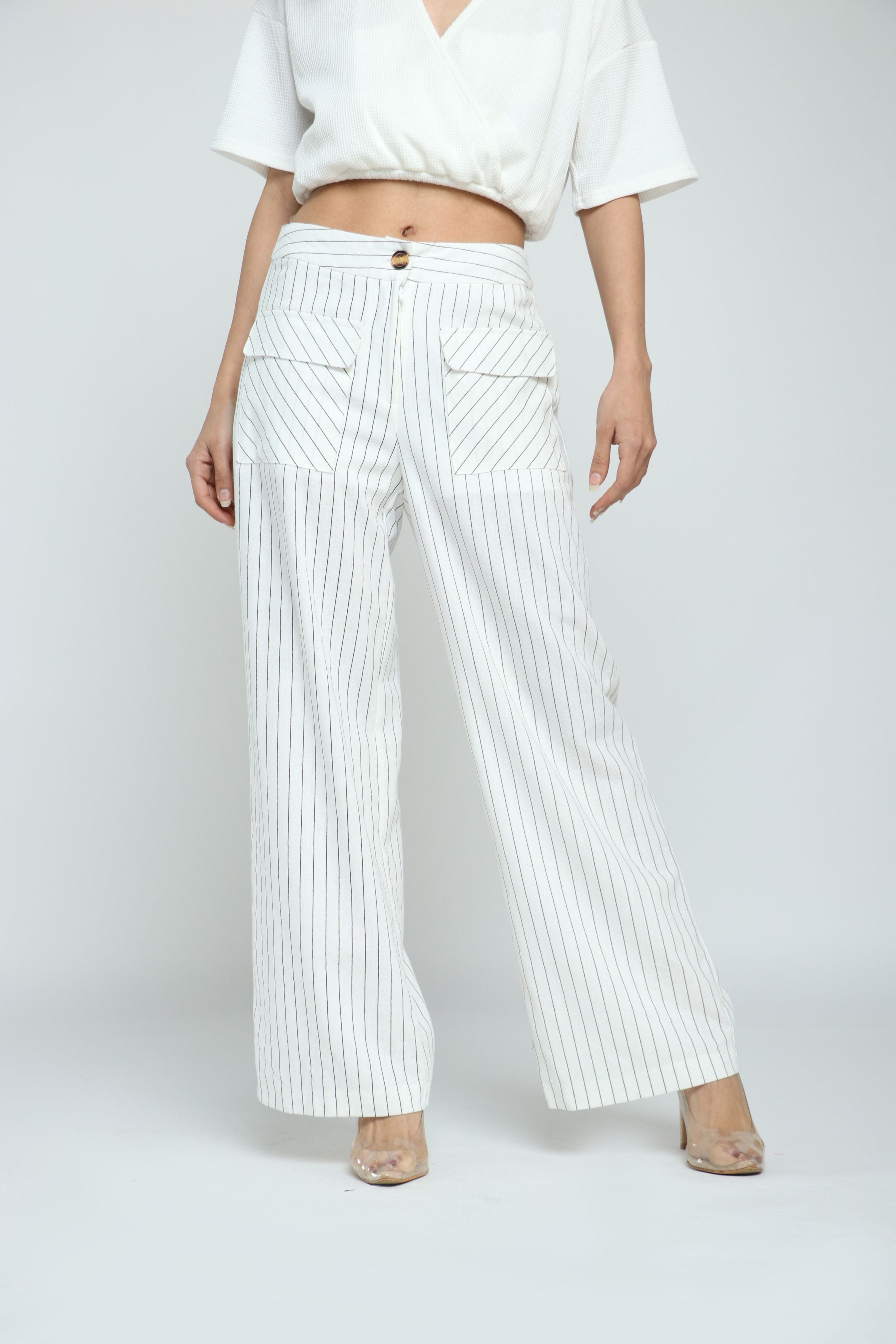 سروال مخطط مع جيوب أمامية وزرار واسع طويل نسائي
