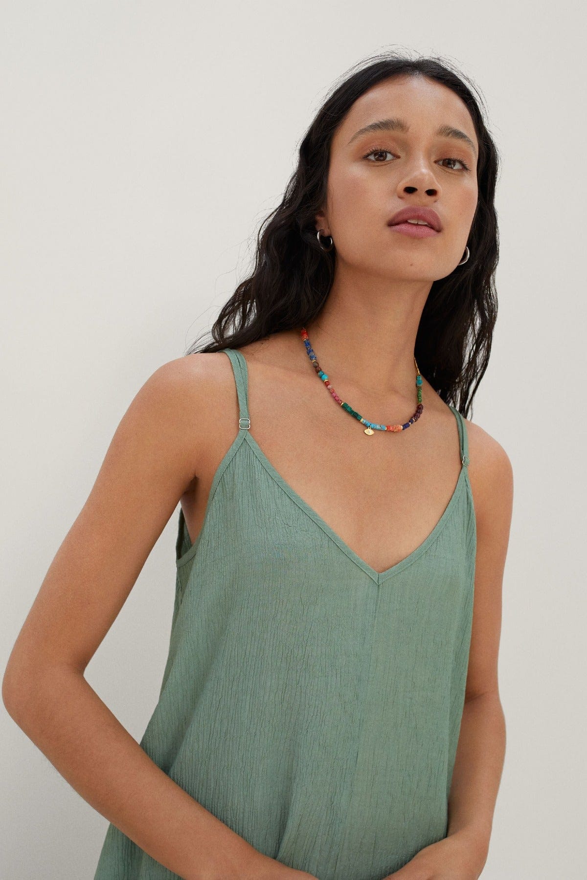 - ياقة V مع حمالات رفيعة لمظهر أنثوي