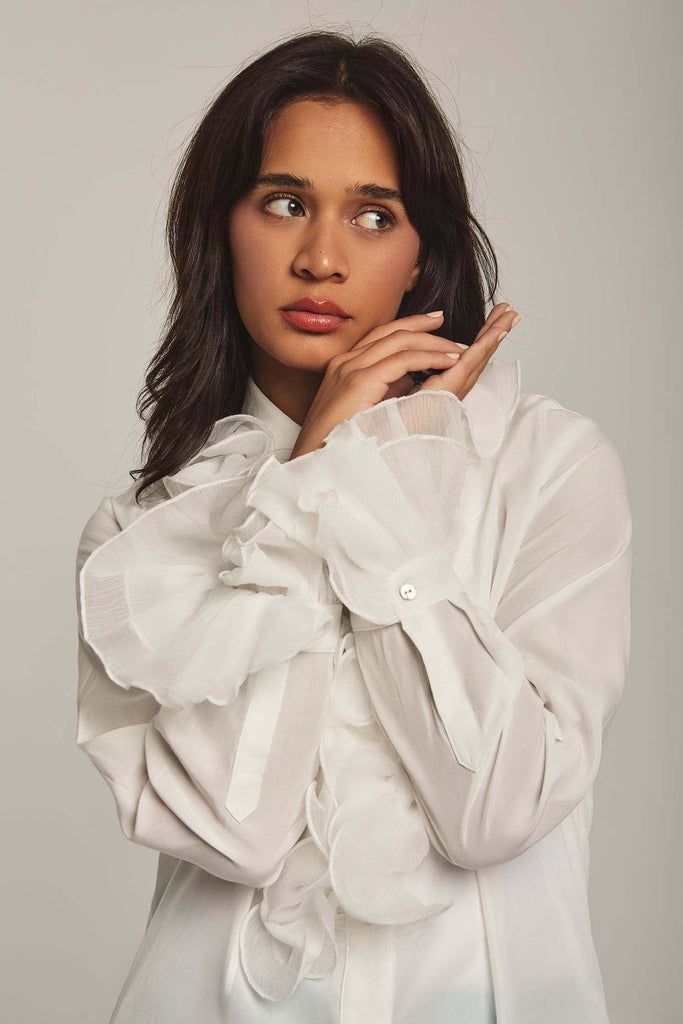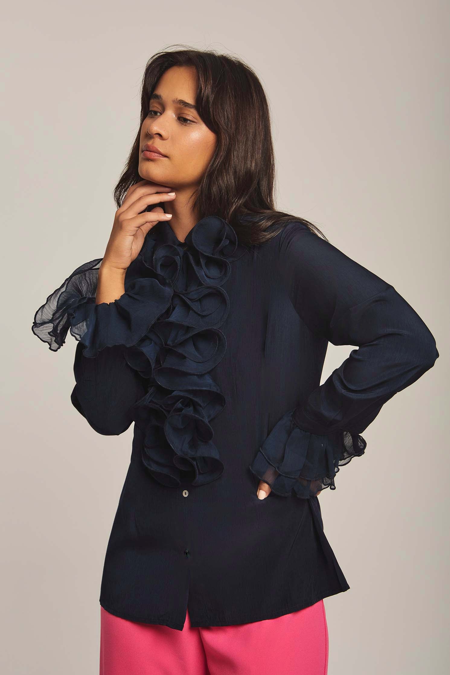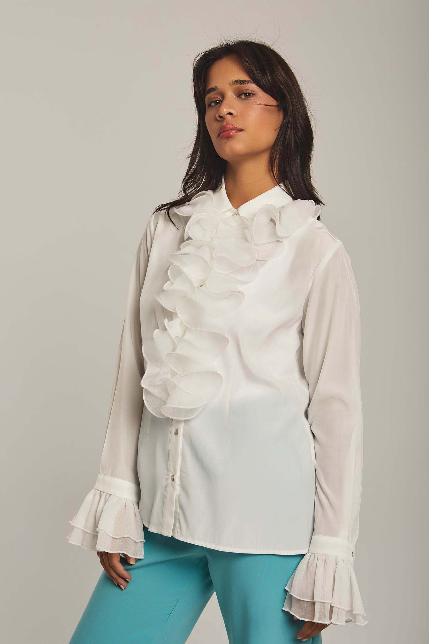 بلوزة نسائية سادة كشكش من الأمام كم طويل