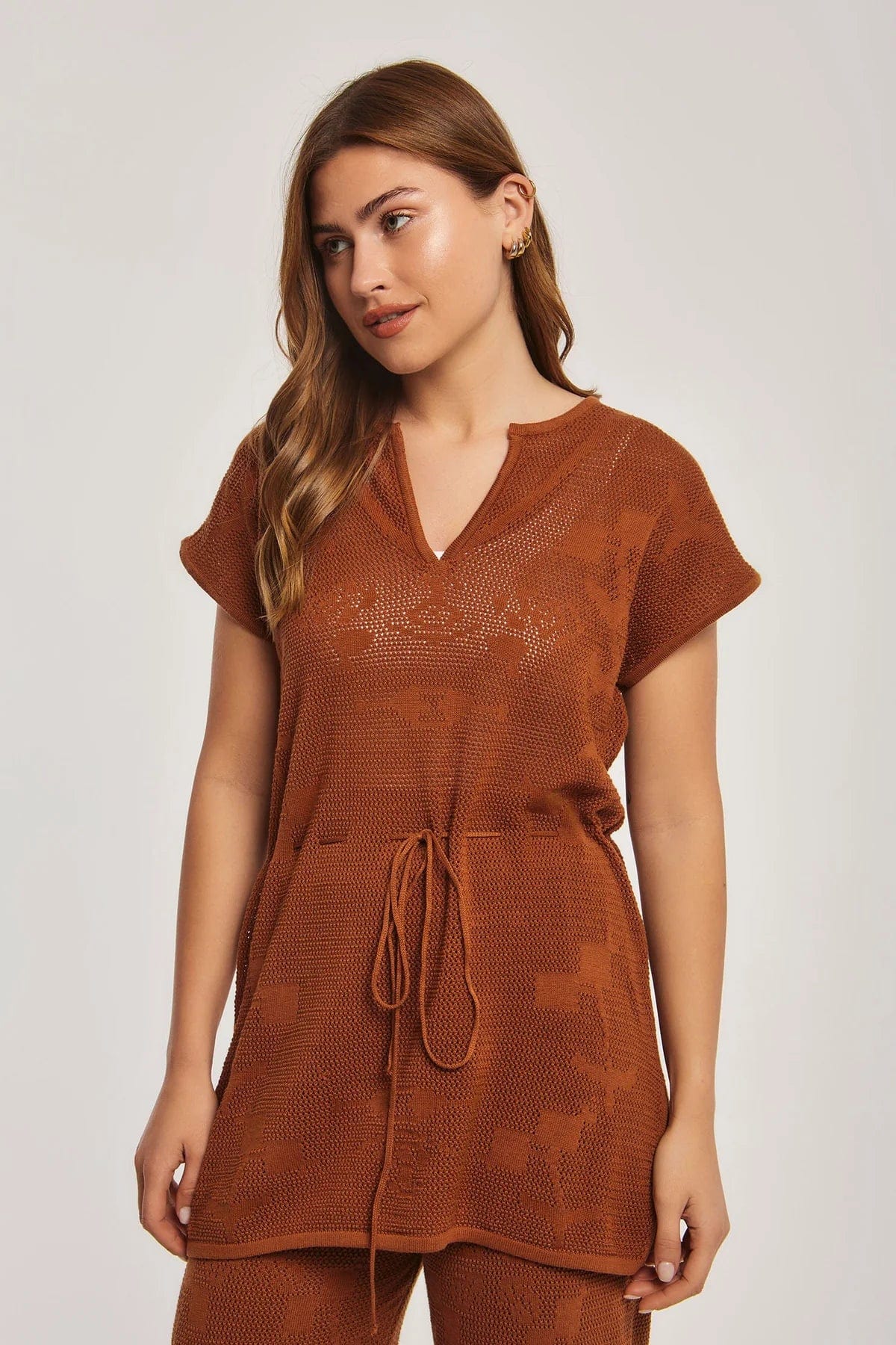 تونيك سادة برباط على الخصر كم قصير بفتحة صدر V نسائي
