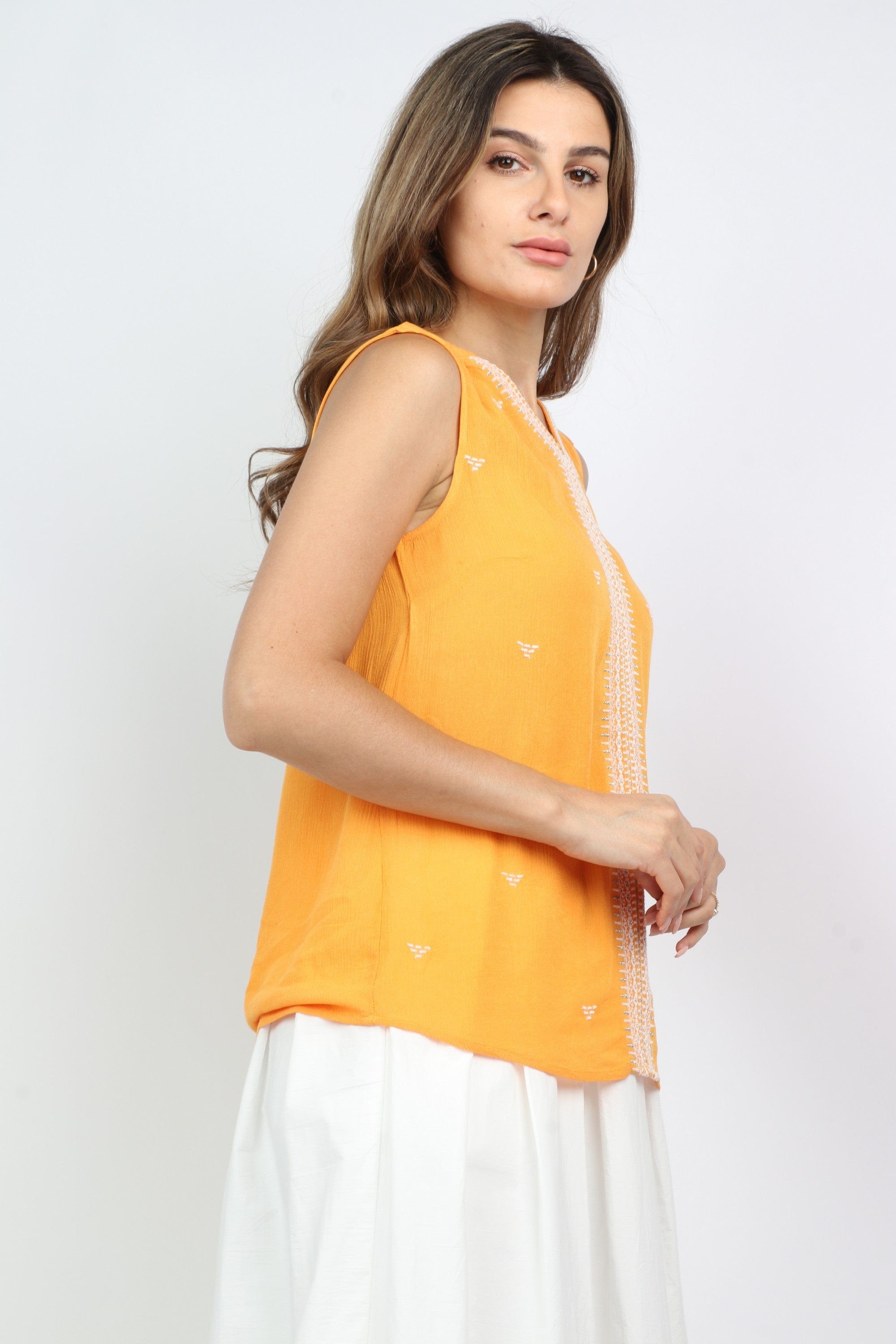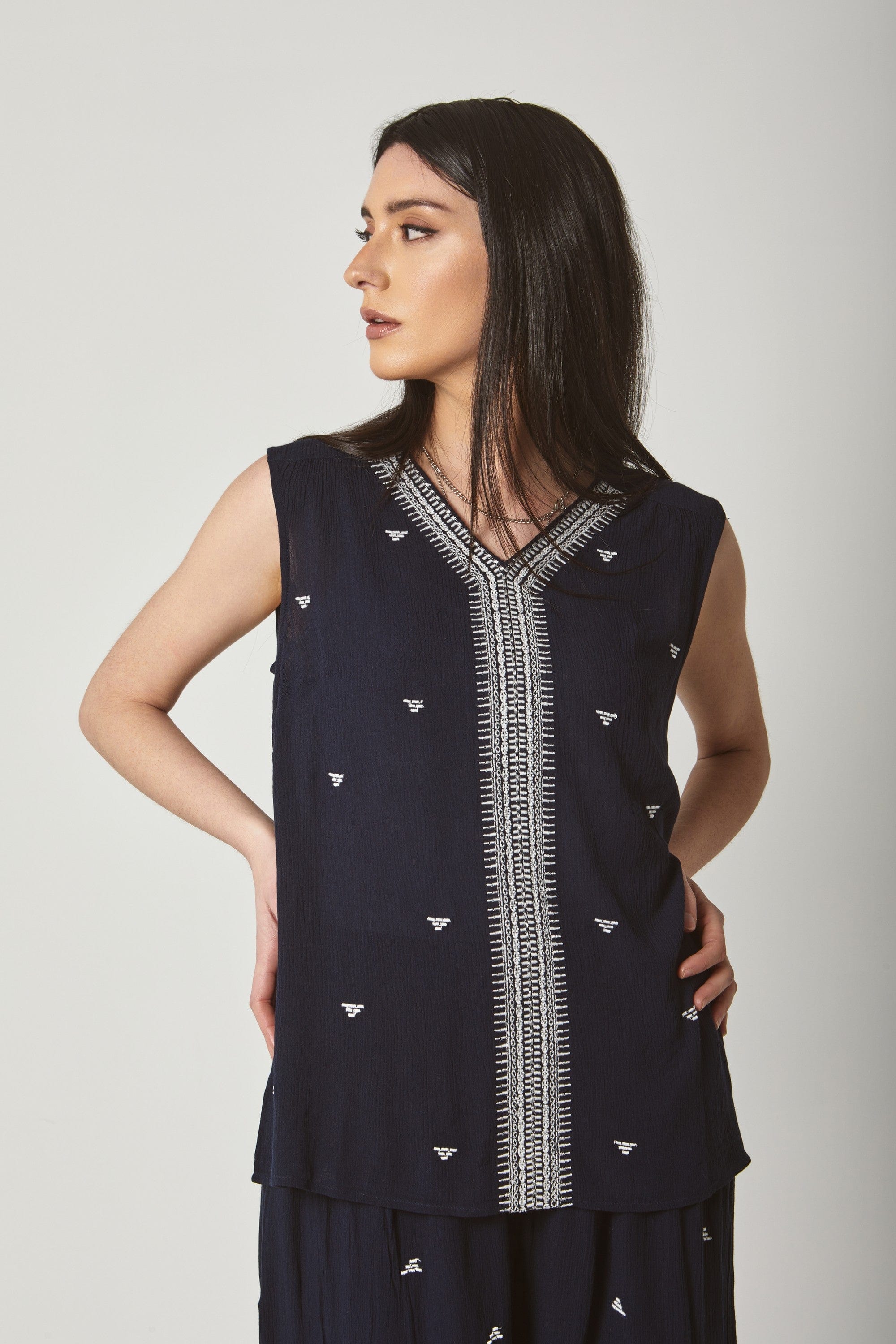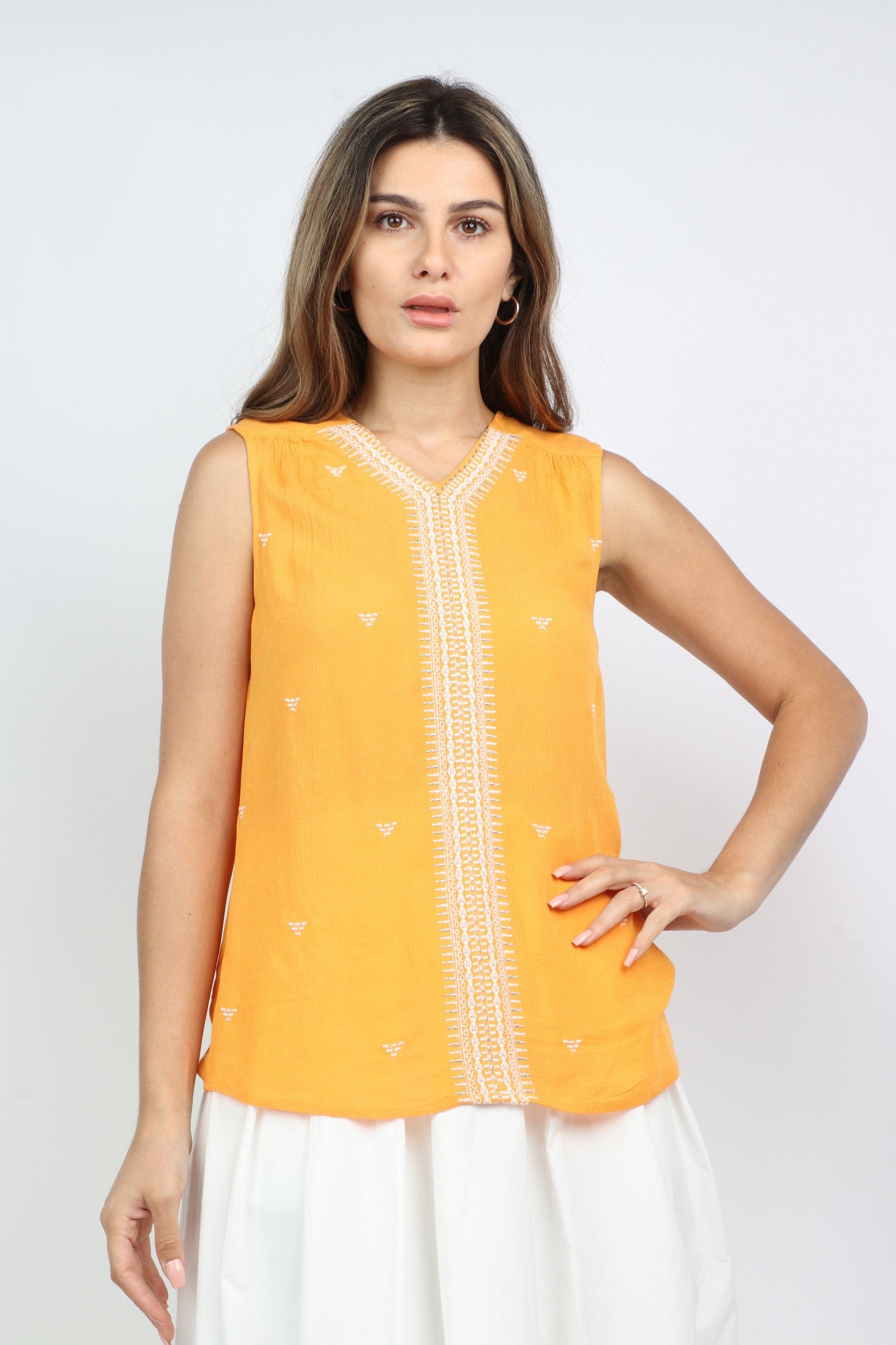 بلوزة نسائية مطرزة من الأمام بدون أكمام