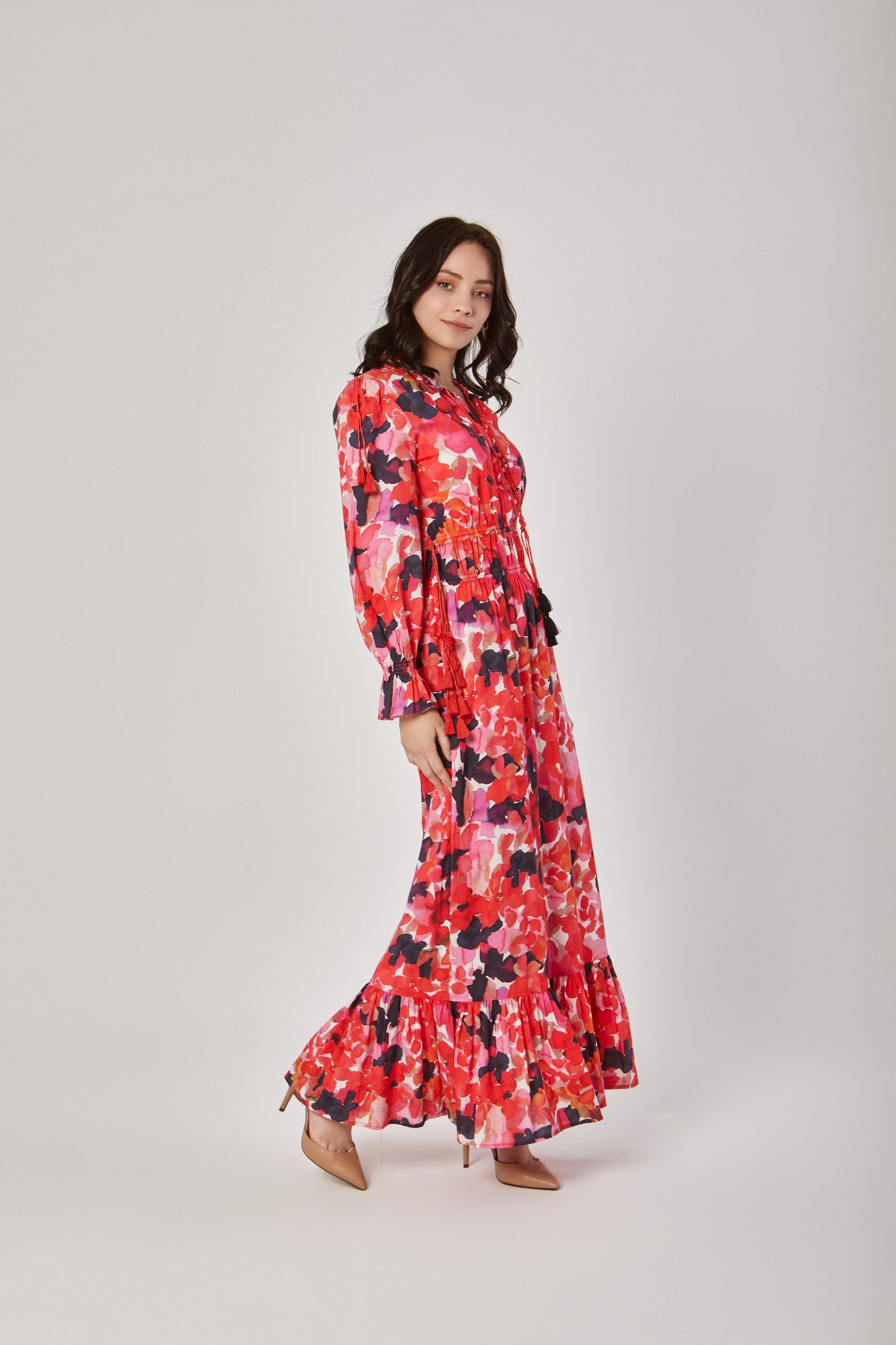- العناية: اغسلي الفستان بلطف بماء بارد أو على دورة غسيل لطيفة للحفاظ على الألوان الزهرية، تجنبي المبيضات، جففيه معلّقاً وكيه على حرارة متوسطة إذا لزم.