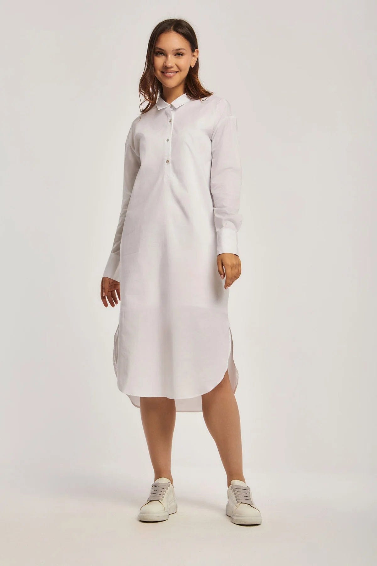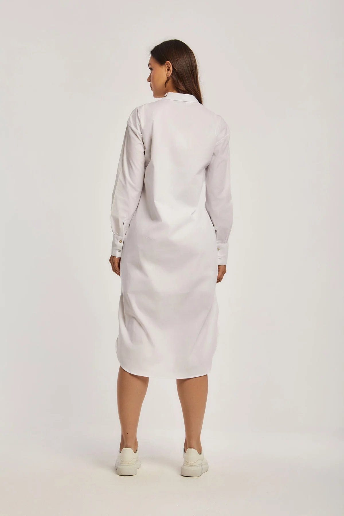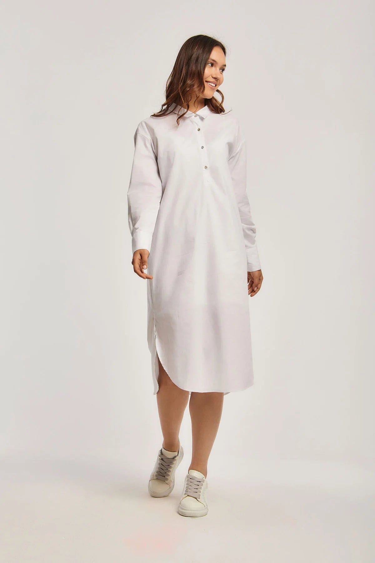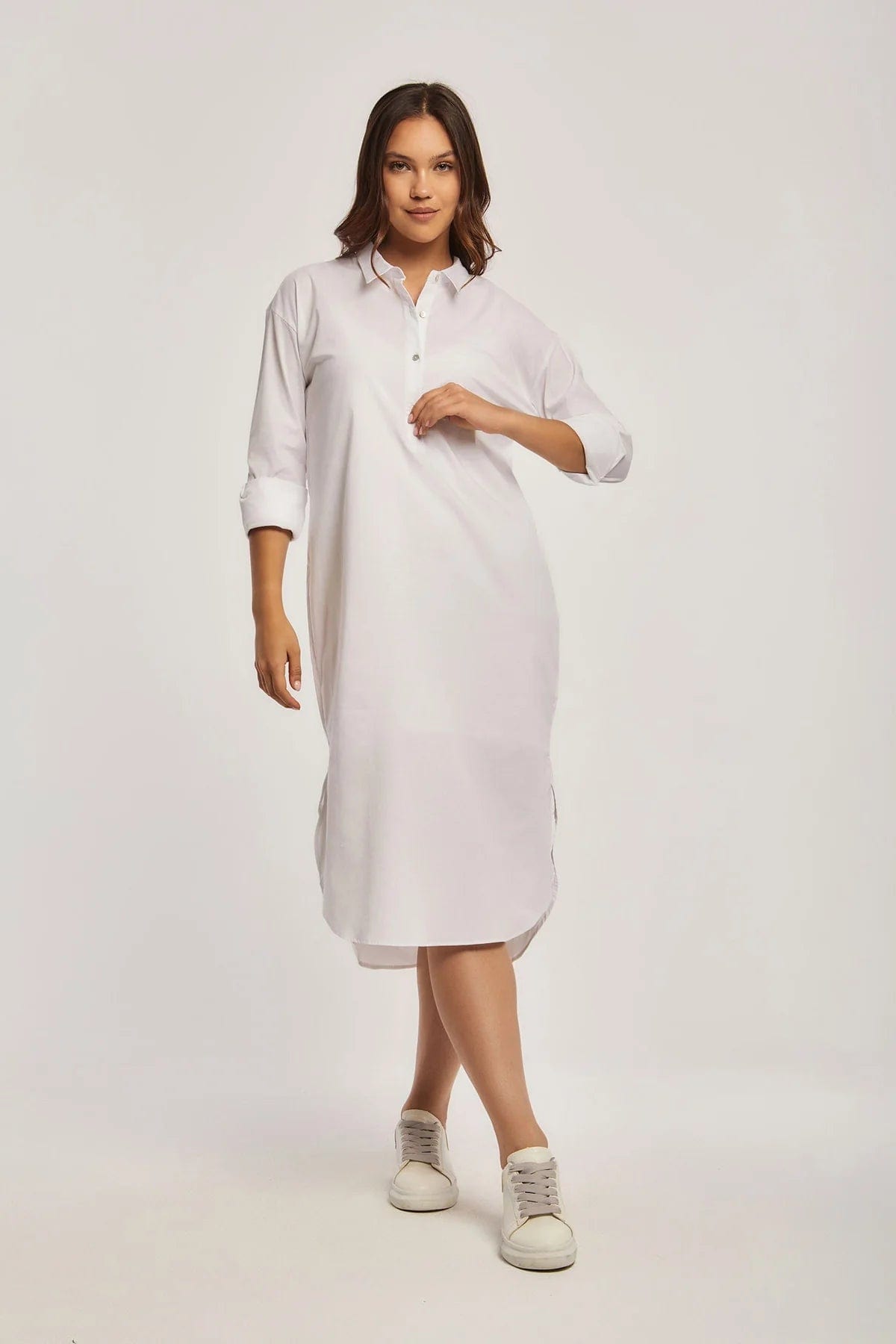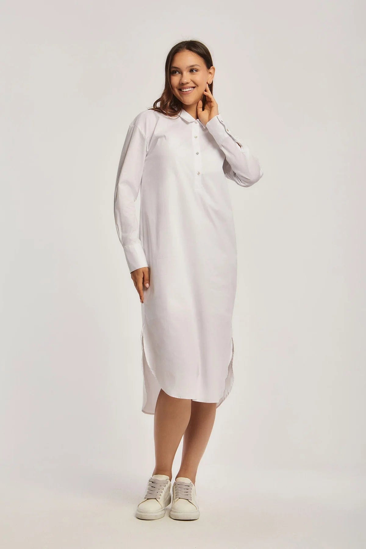 لو تبحثين عن فستان أبيض عملي وأنيق للخروجات اليومية، هذا الفستان بقصة مستقيمة هو خيار ممتاز. خفيف المتوسط السماكة وبدون بطانة، يمنحك إحساس طبيعي يناسب كل المواسم ويظل مناسبًا طوال اليوم. ياقة القميص تضيف لمسة رسمية بسيطة، والأكمام الطويلة العادية تجعل الفستان مناسبًا للأجواء المعتدلة. طوله ميدي يمنحه توازنًا بين الراحة والأناقة، والنقشة السادة تسهل تنسيقه مع إكسسوارات متعددة. الإغلاق بأزرار يمنحك مرونة في اللوك ويعطي تفاصيل بسيطة أنيقة. لا يحتوي على جيوب ولا حزام، مما يحافظ على مظهره النظيف والمباشر. مناسب للخروجات الكاجوال واليومية، ويمكن تحويله بسهولة لإطلالة أكثر رسمية بلمسات بسيطة؛ ستحبين كيف يتحرك معك ويظل عمليًا وأنثويًا في آن واحد. اعثري على مقاسك في فاشن السعودية وأضيفي هذه القطعة المتنوعة إلى خزانة ملابسك اليوم.