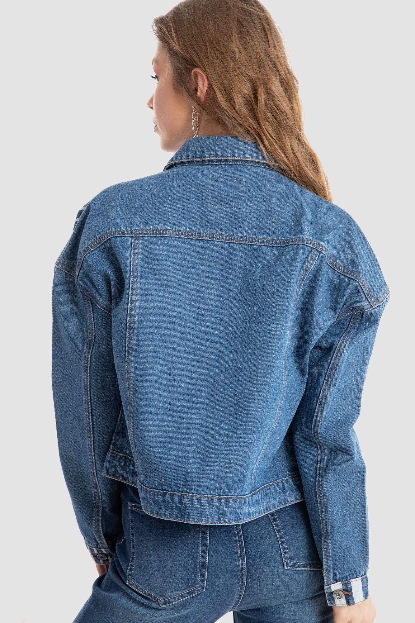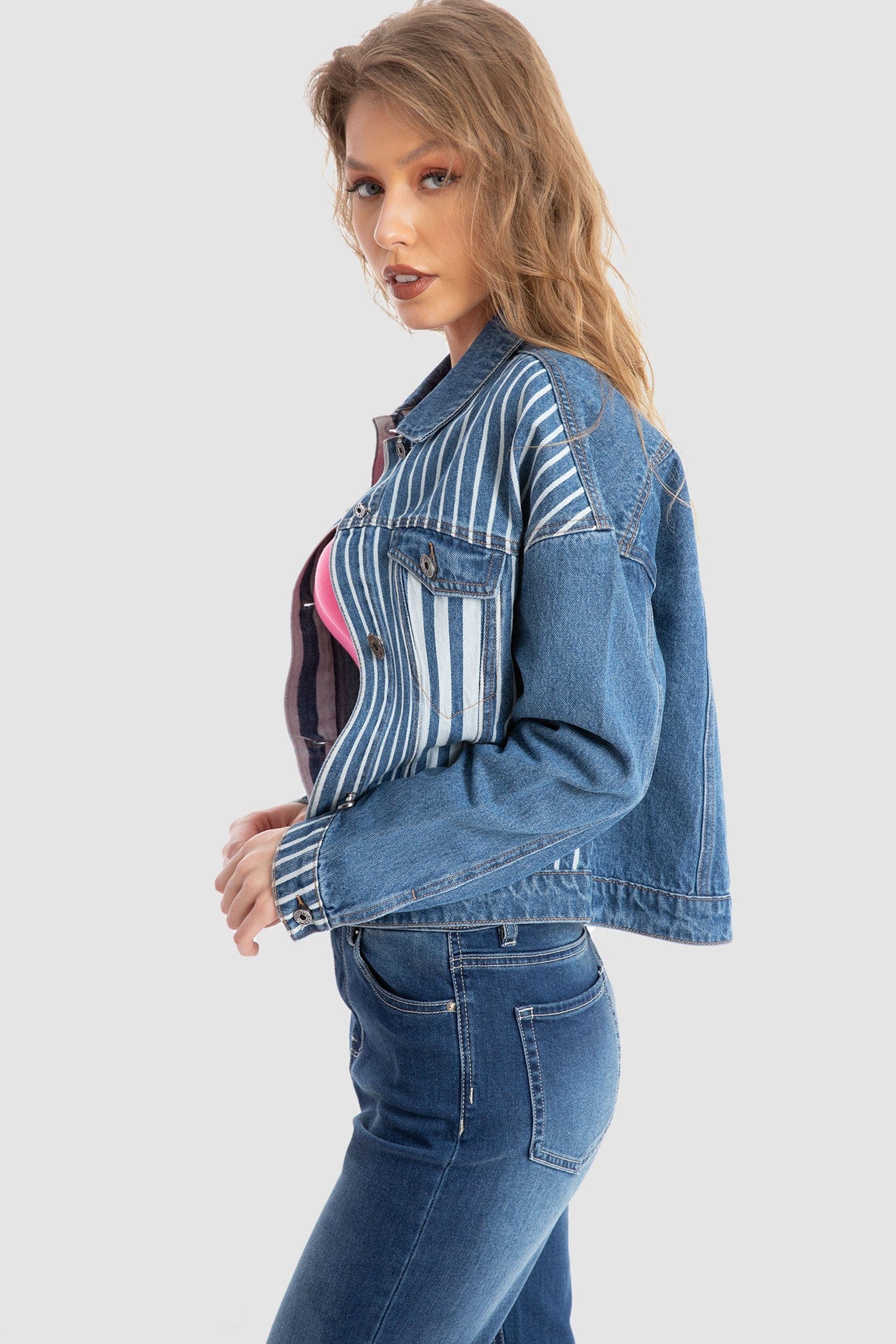 جاكيت جينز مخطط بالطول بجيوب كم طويل نسائي