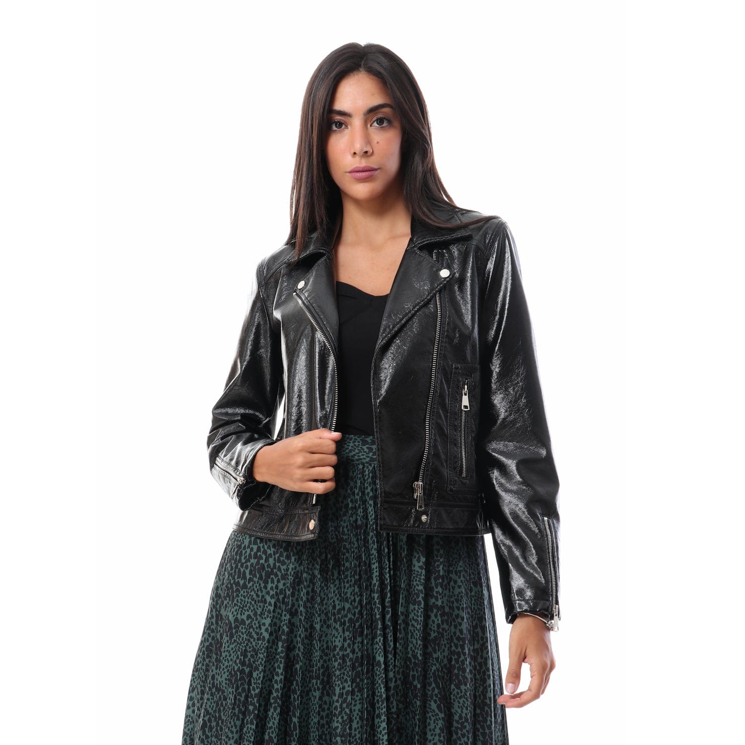 جاكيت جلد لامع بسحابات نسائي