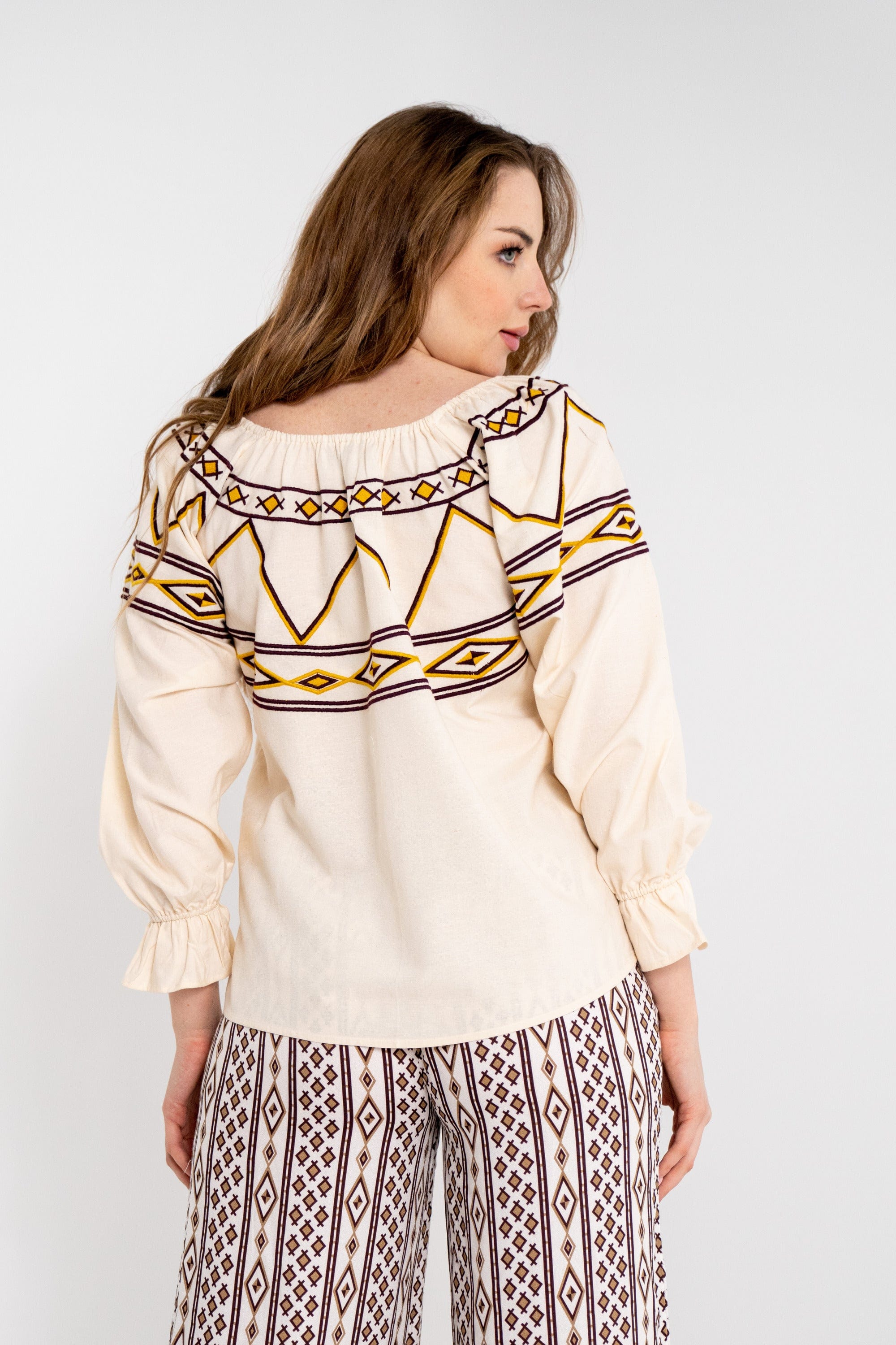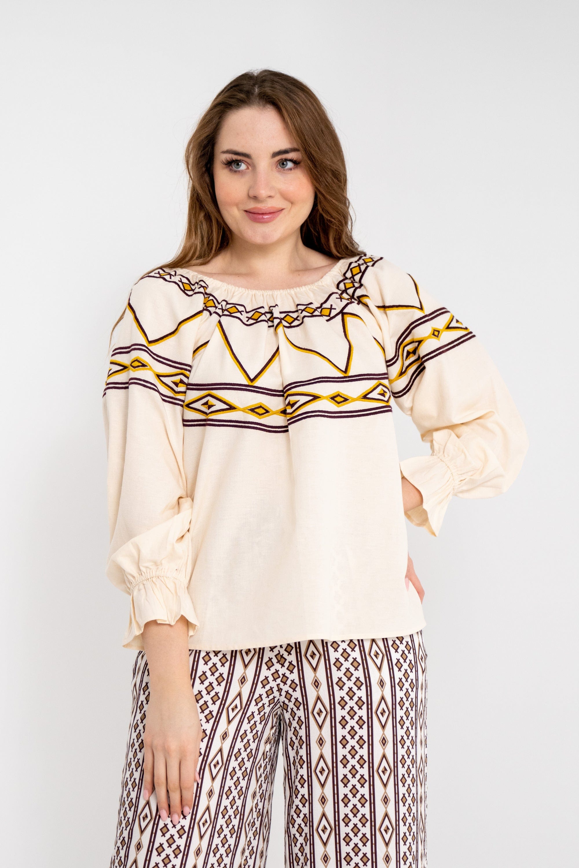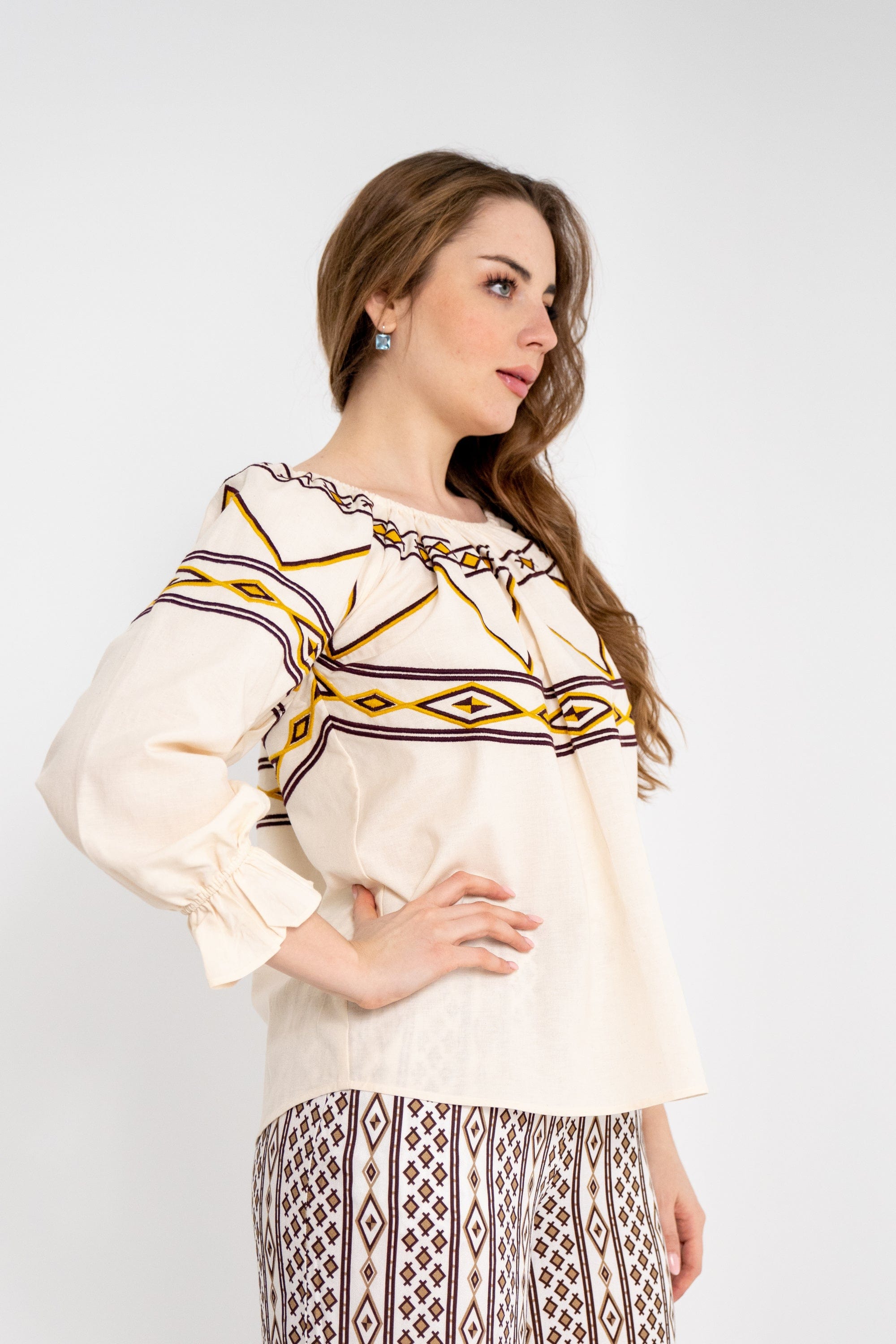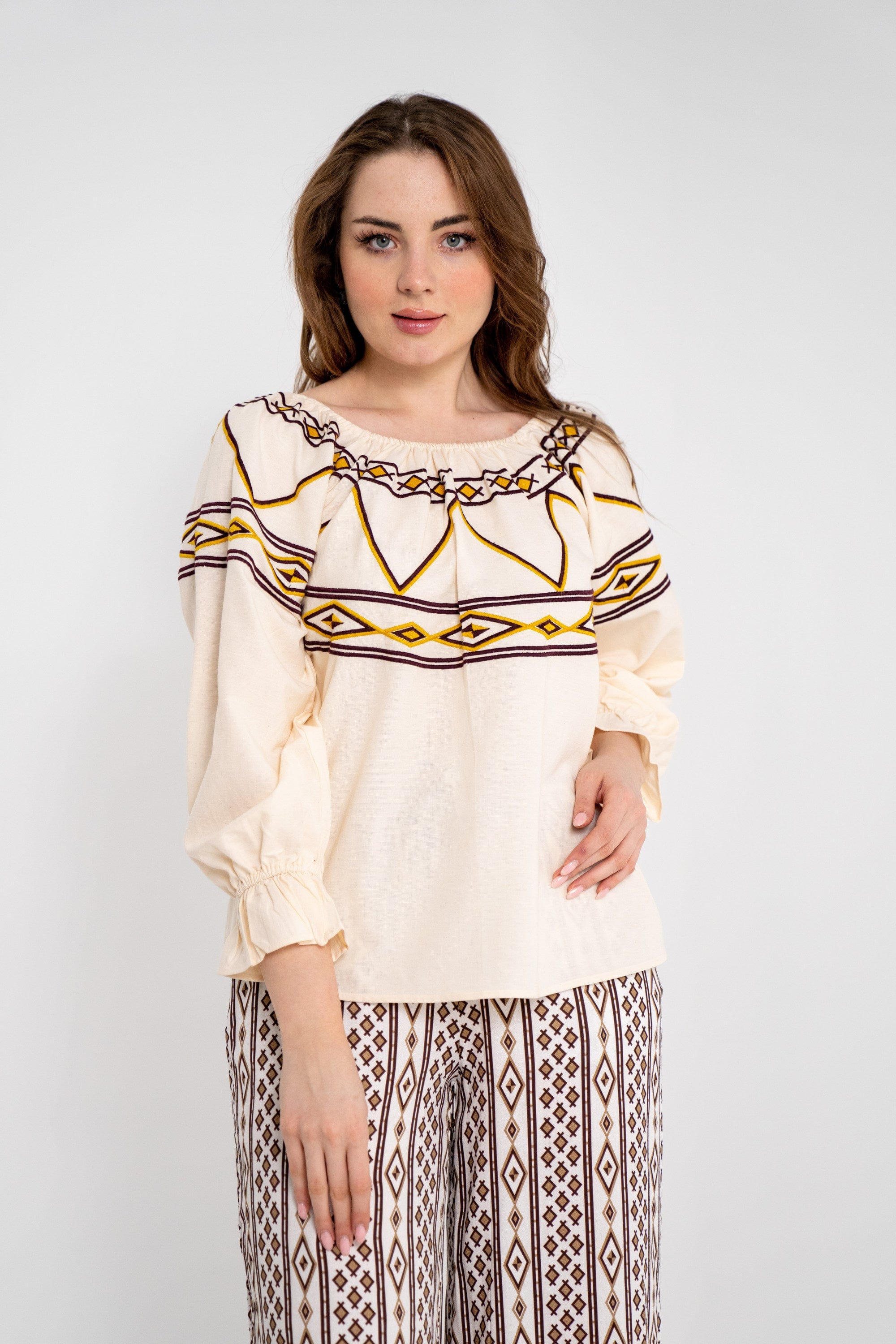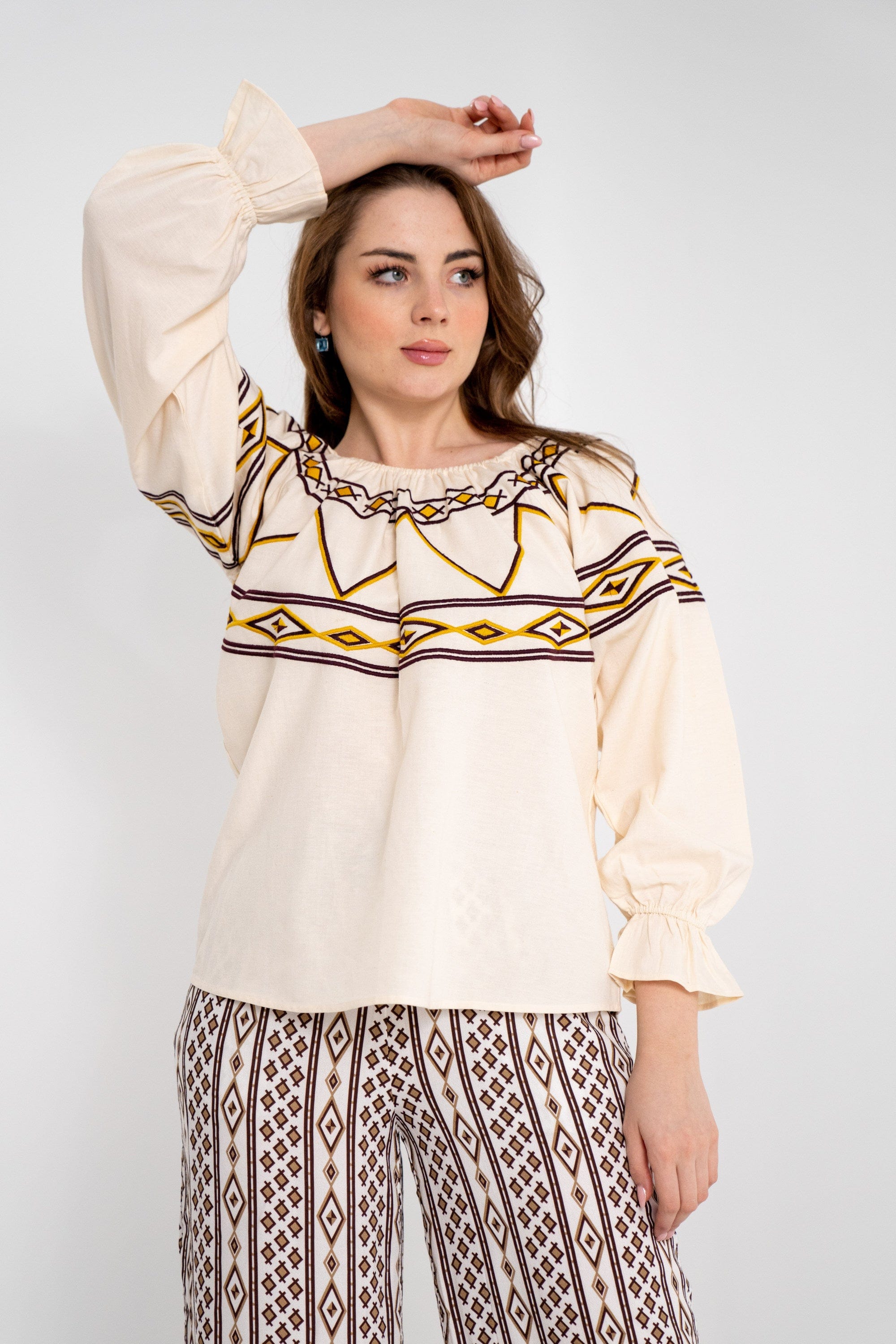 بلوزة نسائية قصيرة بنقشة على الأكمام والصدر