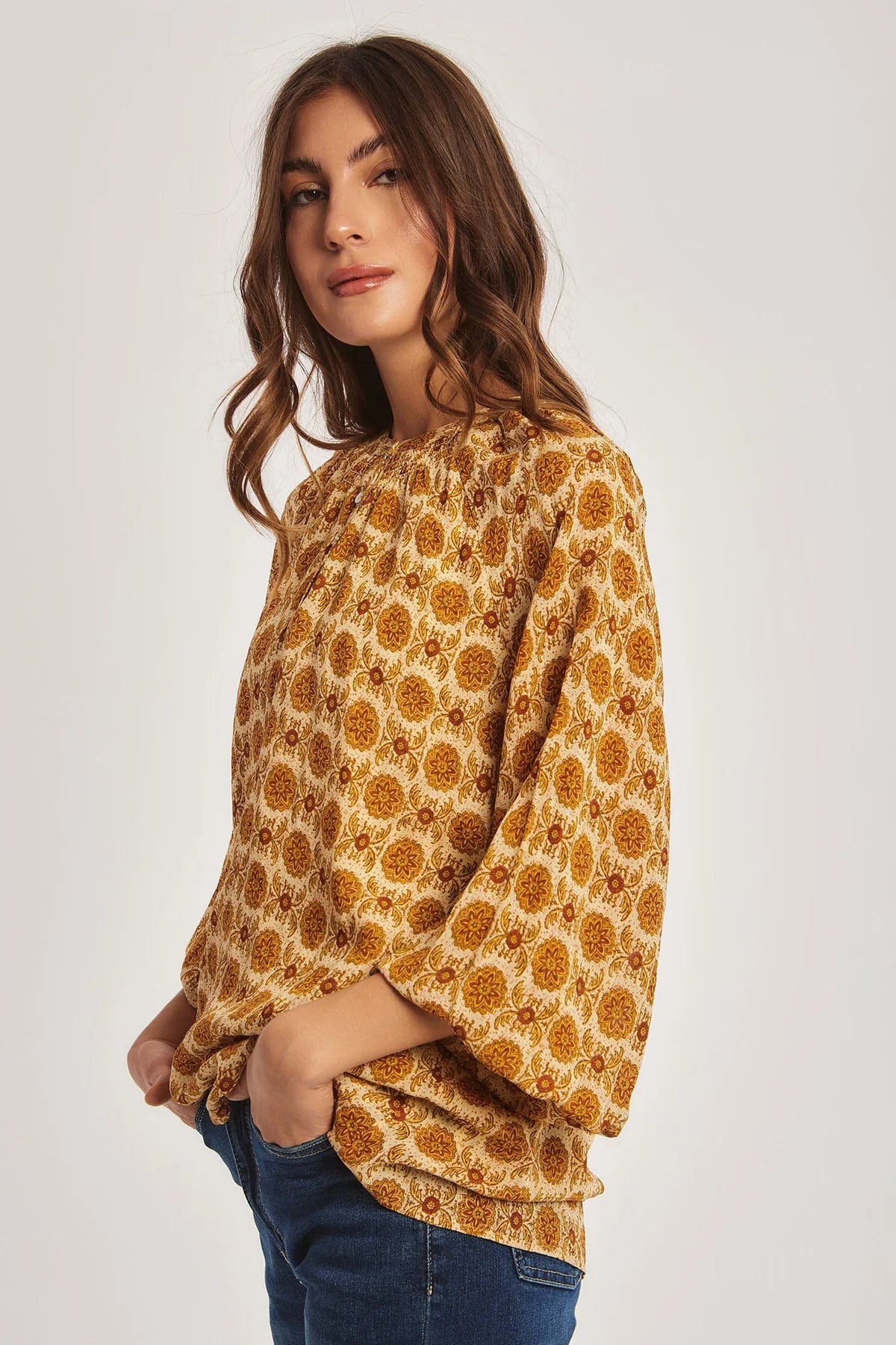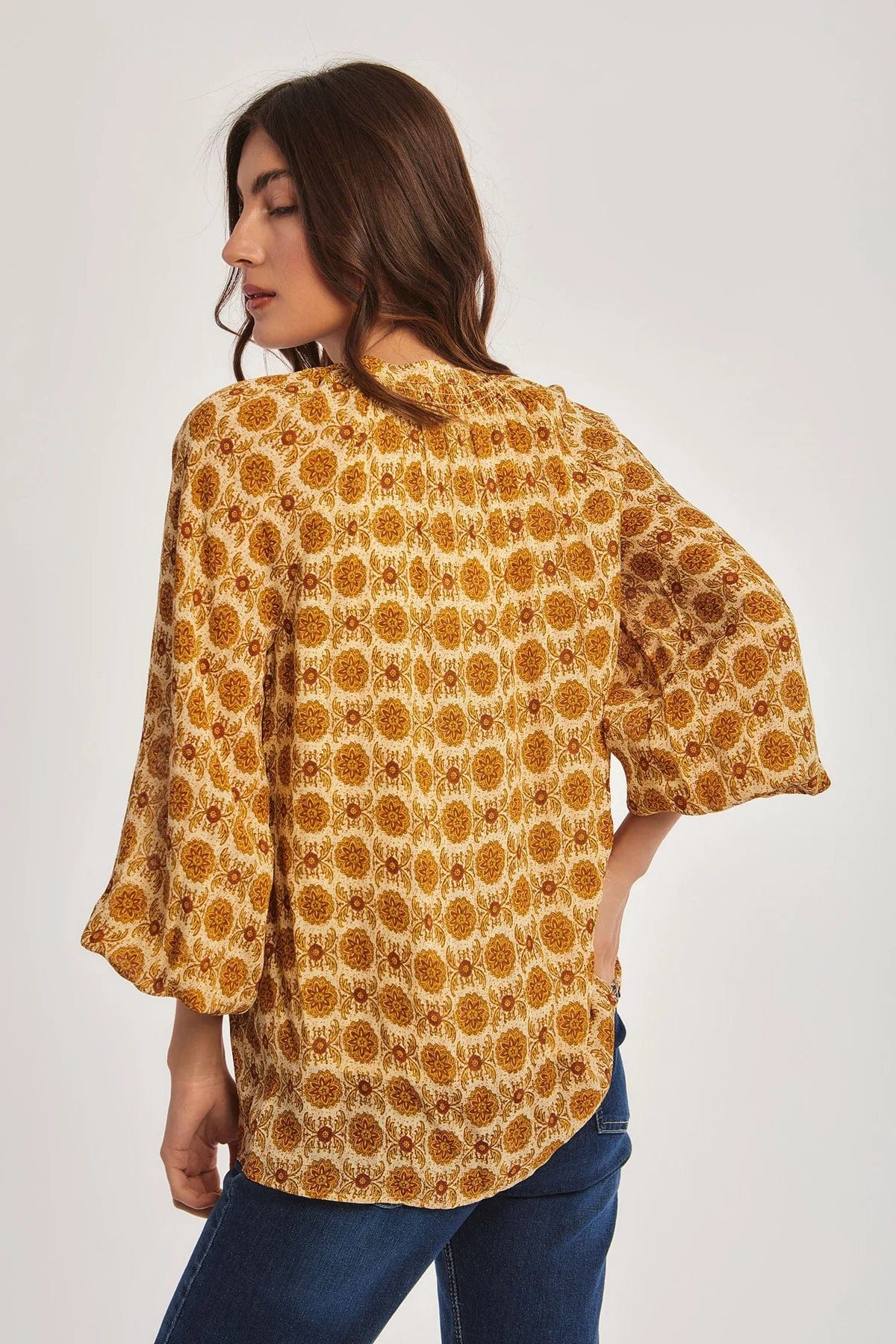 بلوزة منقوشة طويلة كم طويل