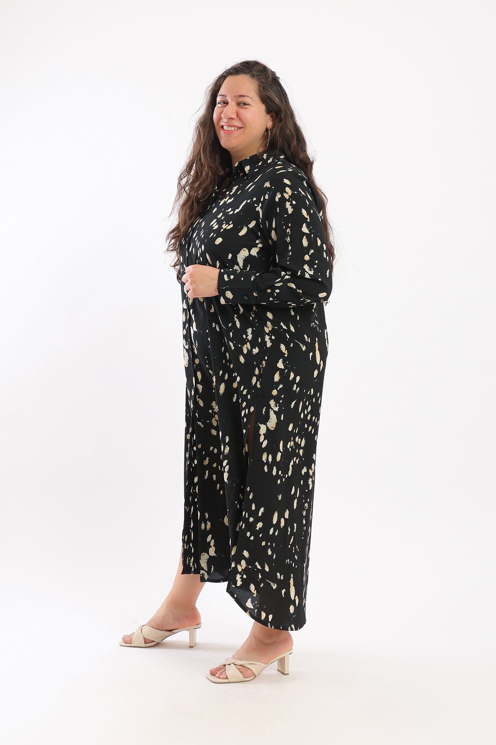 تخيلِ فستاناً أسود بسيطاً لكنه مميزاً، ستحتاجينه لكل يوم. هذا الفستان بقصة واسعة وميدي يقدم مزيجاً من الحرية والأناقة، وياقة القميص تمنحه طابعاً كلاسيكياً بينما الأكمام الطويلة تمنحك تغطية مريحة. خامته متوسطة السماكة وبدون بطانة، لذلك مناسب لكل المواسم وستحبين كيف يتحرك معك في المشي. الإغلاق بالأزرار يعطي لمسة عملية وزينة أمامية لطيفة، والقصة المريحة تجعله مناسباً للخروجات الكاجوال واليومية. لا يحمل جيوباً ولا حزاماً، ما يبرز انسيابية التصميم ومظهره النظيف. لمن تبحث عن فستان مواكب للموضة وبنقشة مجردة باللون الأسود، هذا خيار عملي وأنيق للنهار والسهرة البسيطة على حد سواء. اعثري على مقاسك في فاشن السعودية وأضيفي هذه القطعة المتنوعة إلى خزانة ملابسك اليوم.
