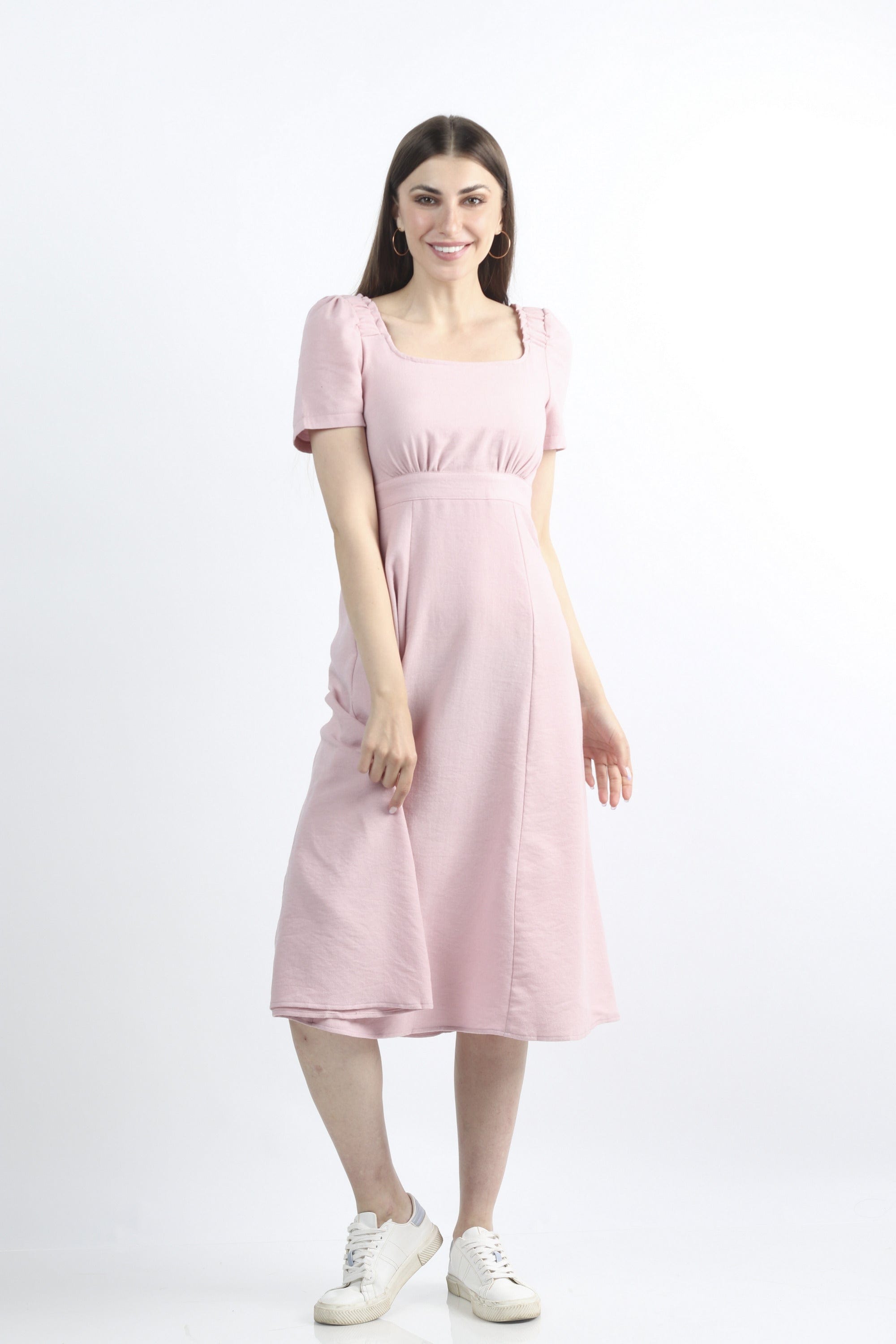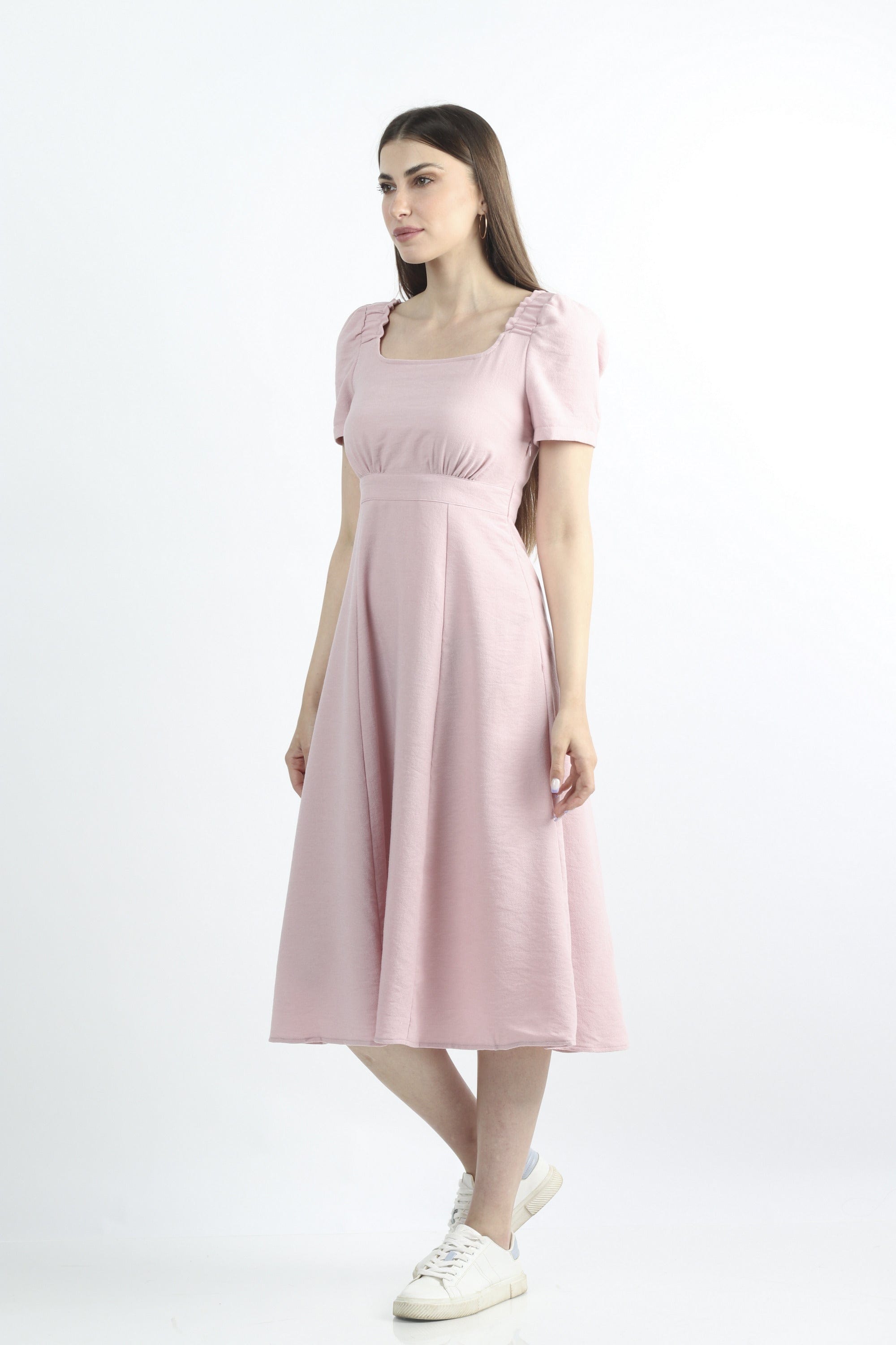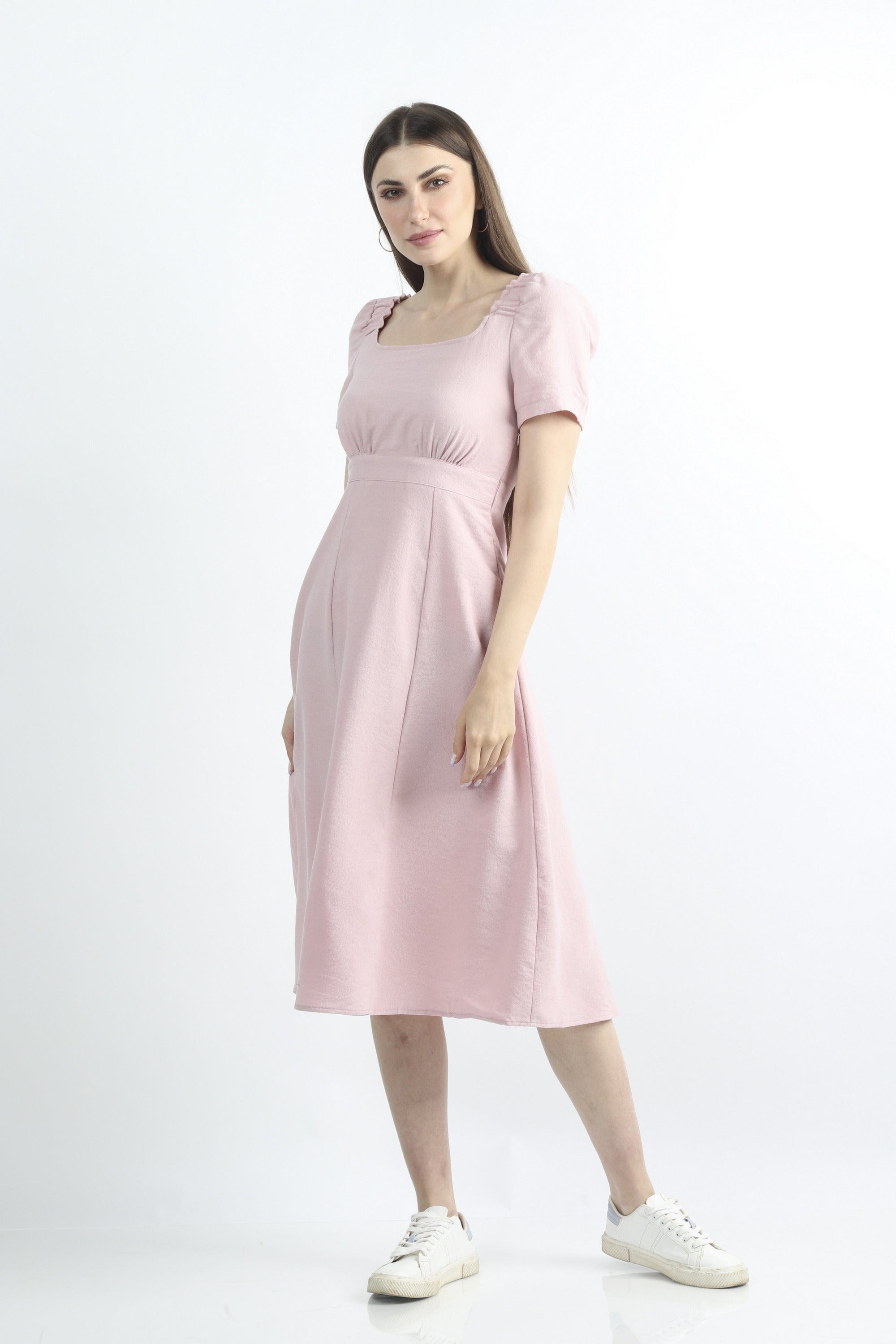 فستان ميدي سادة مخصر نص كم بف