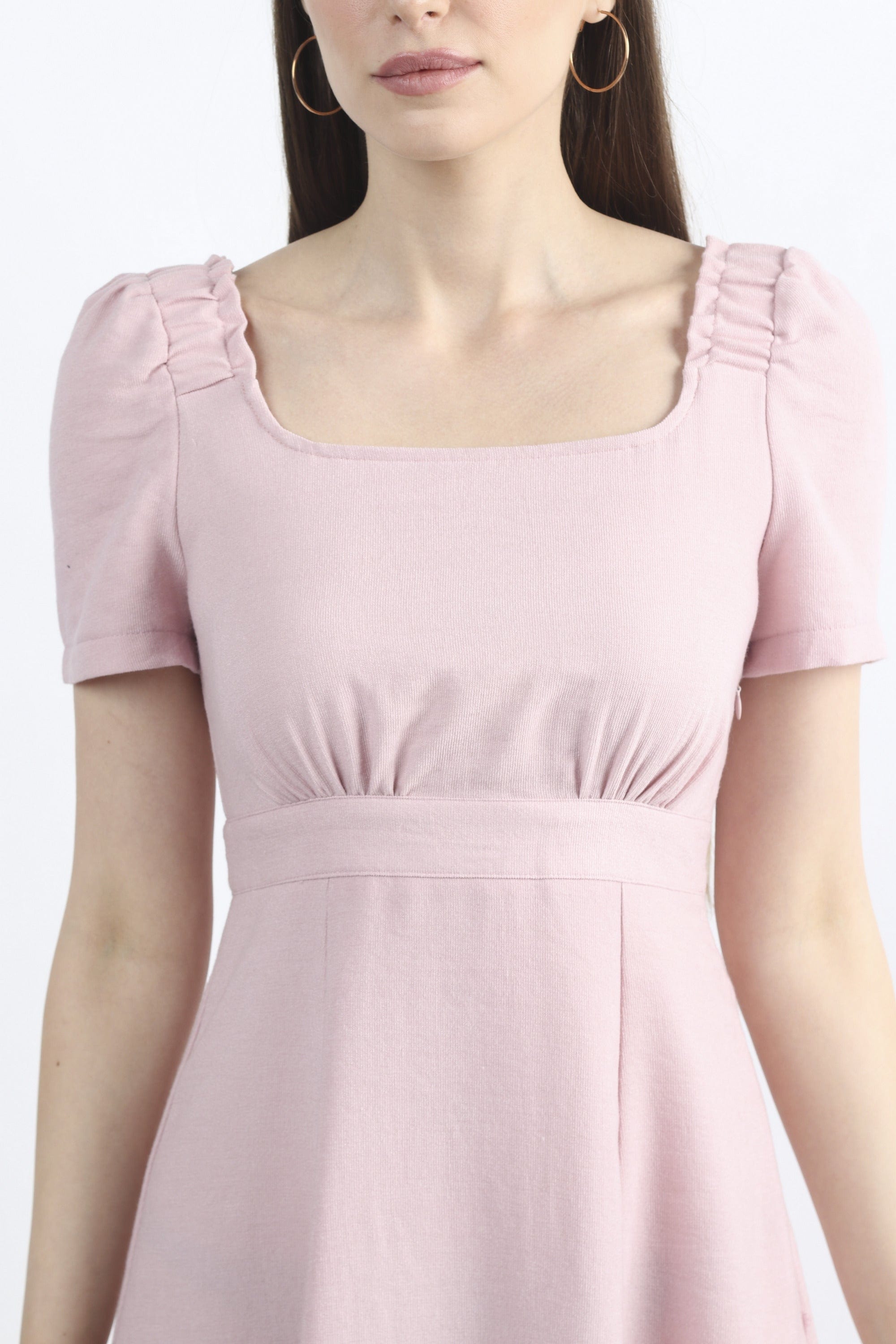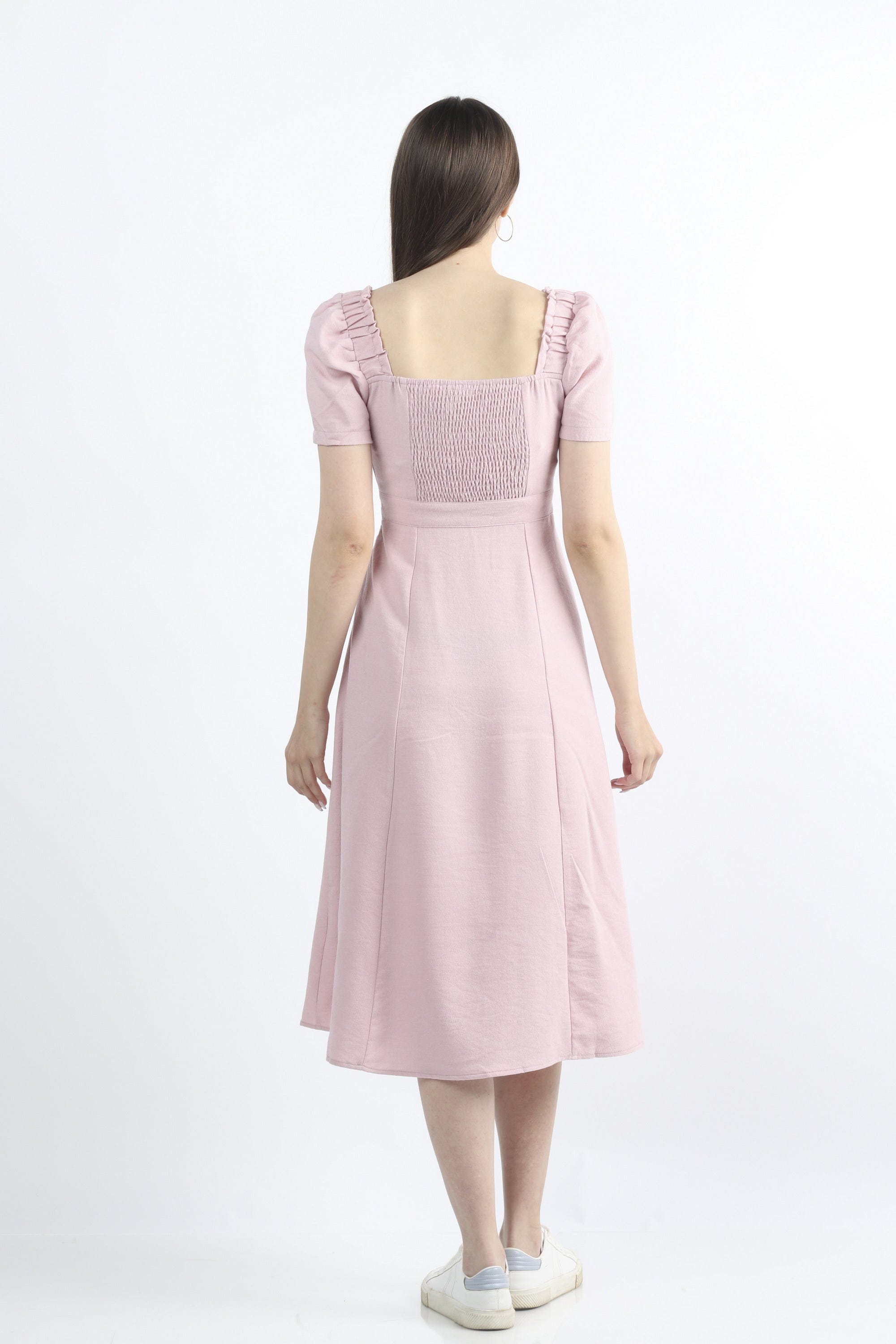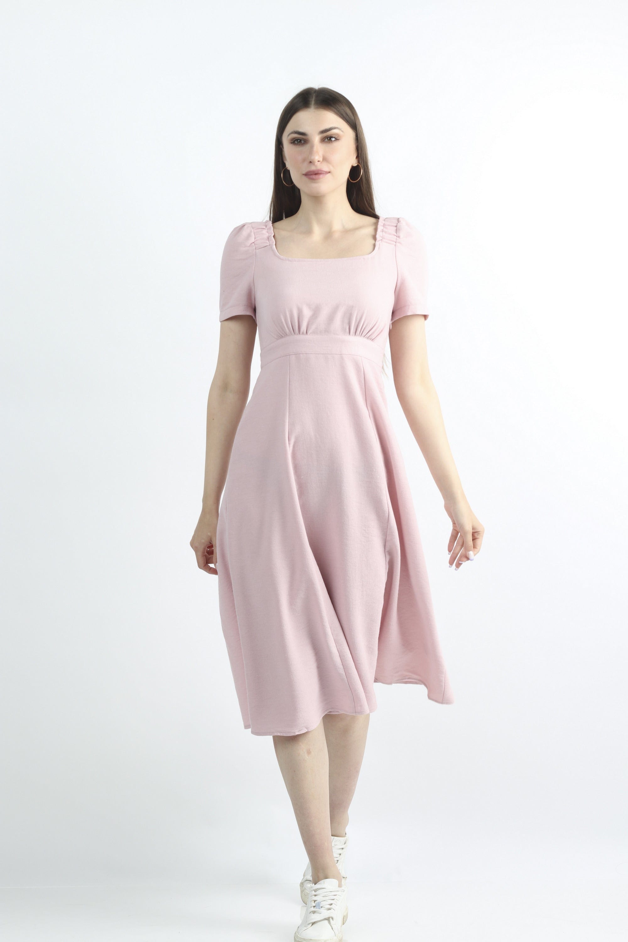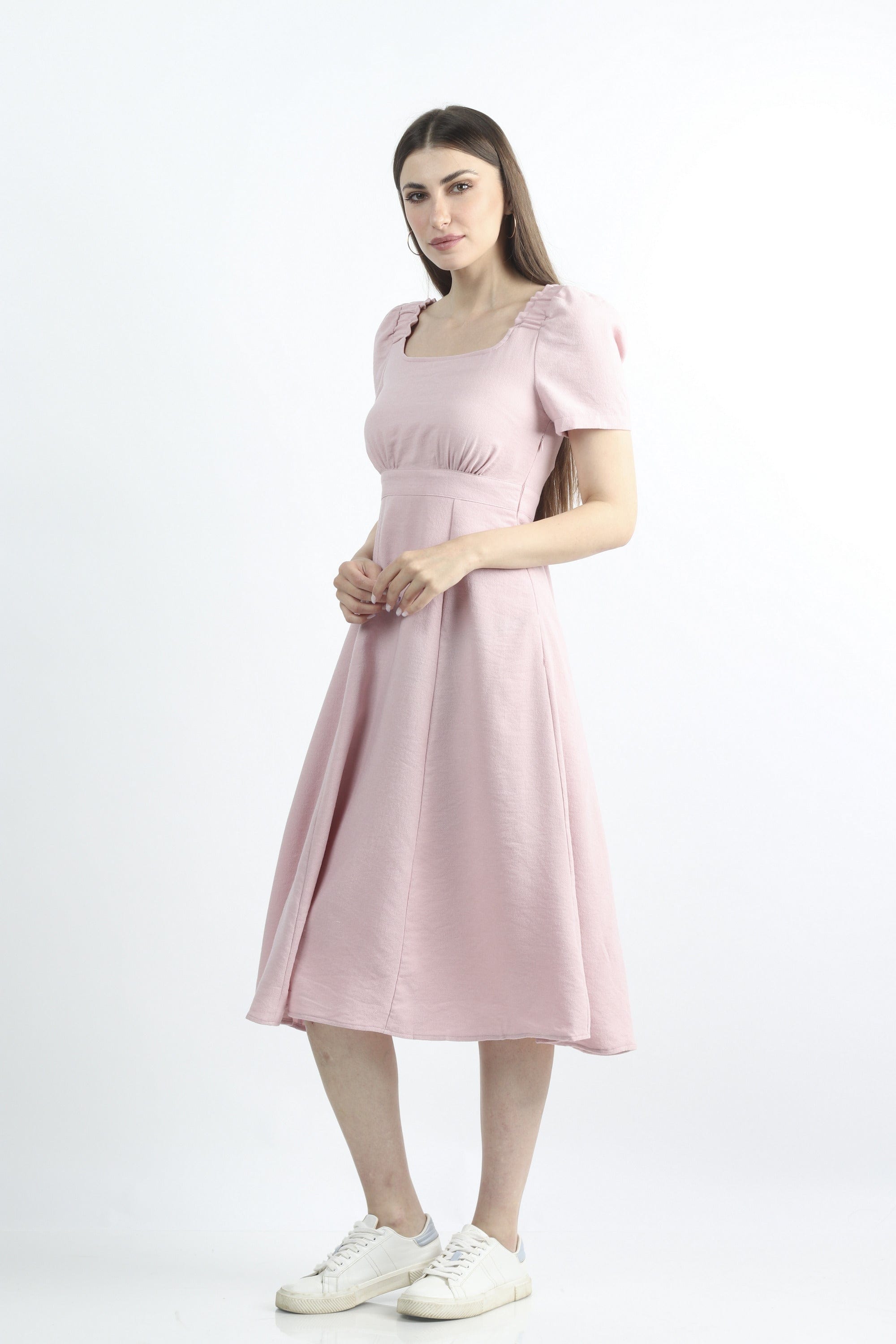 فستان ميدي سادة مخصر نص كم بف