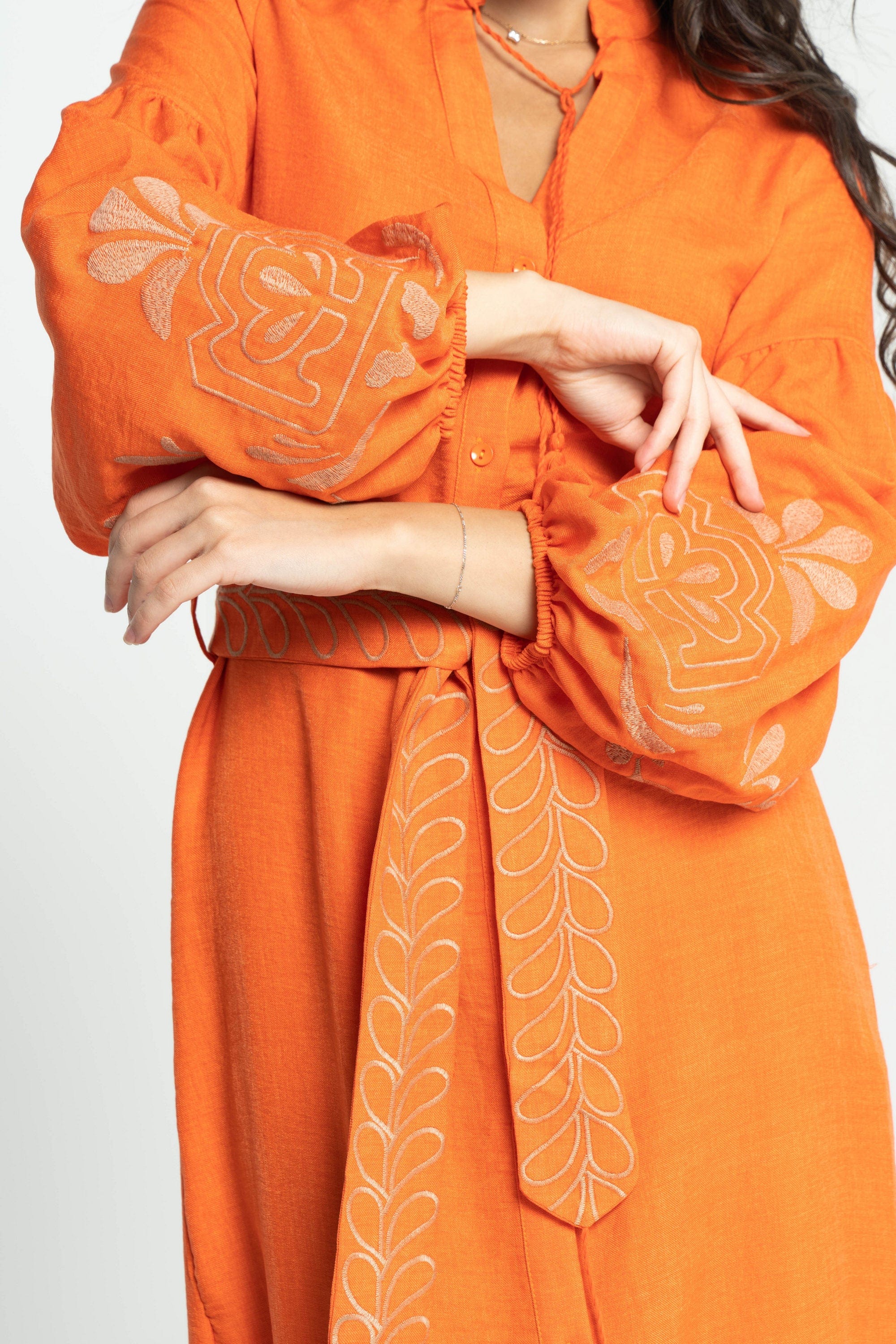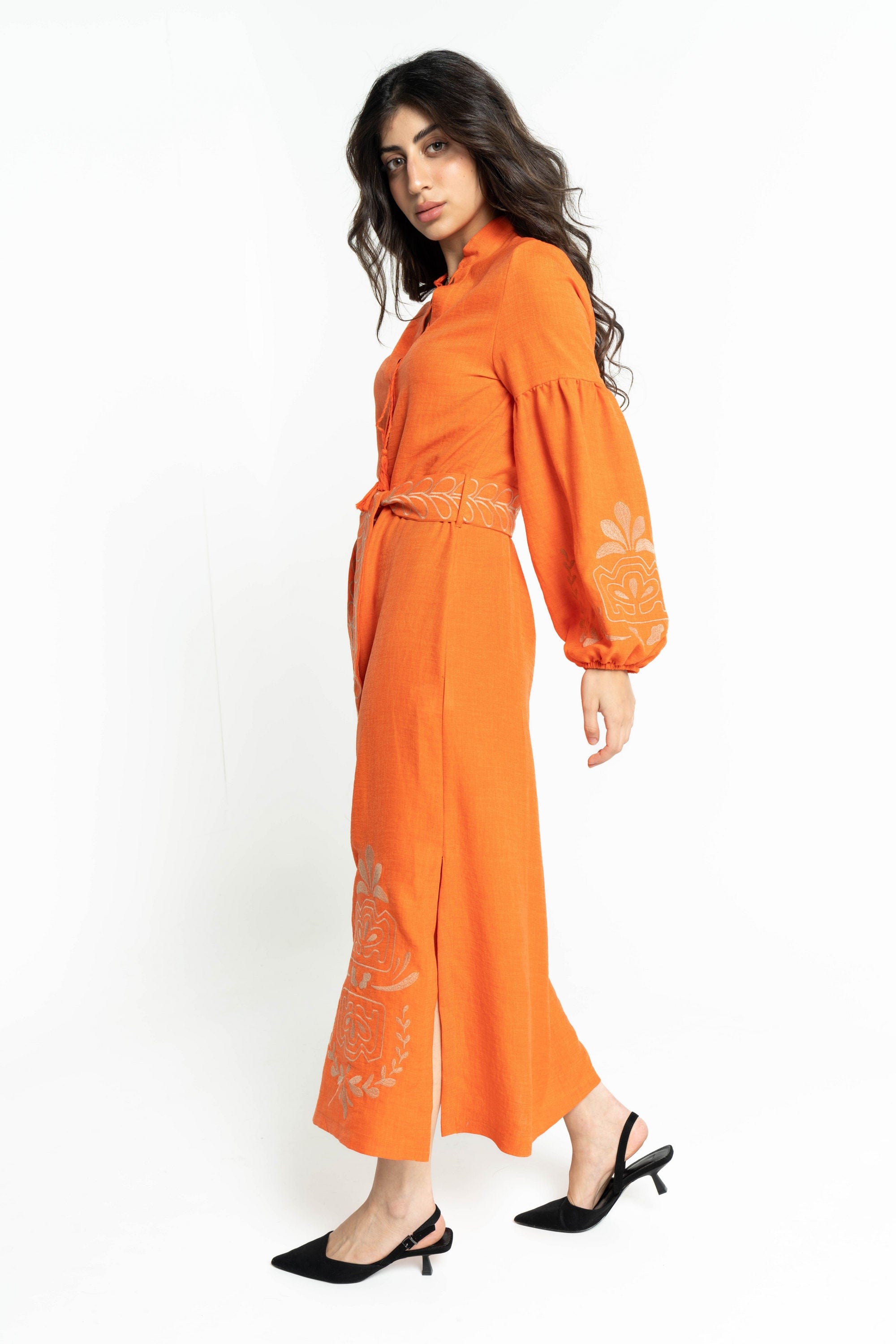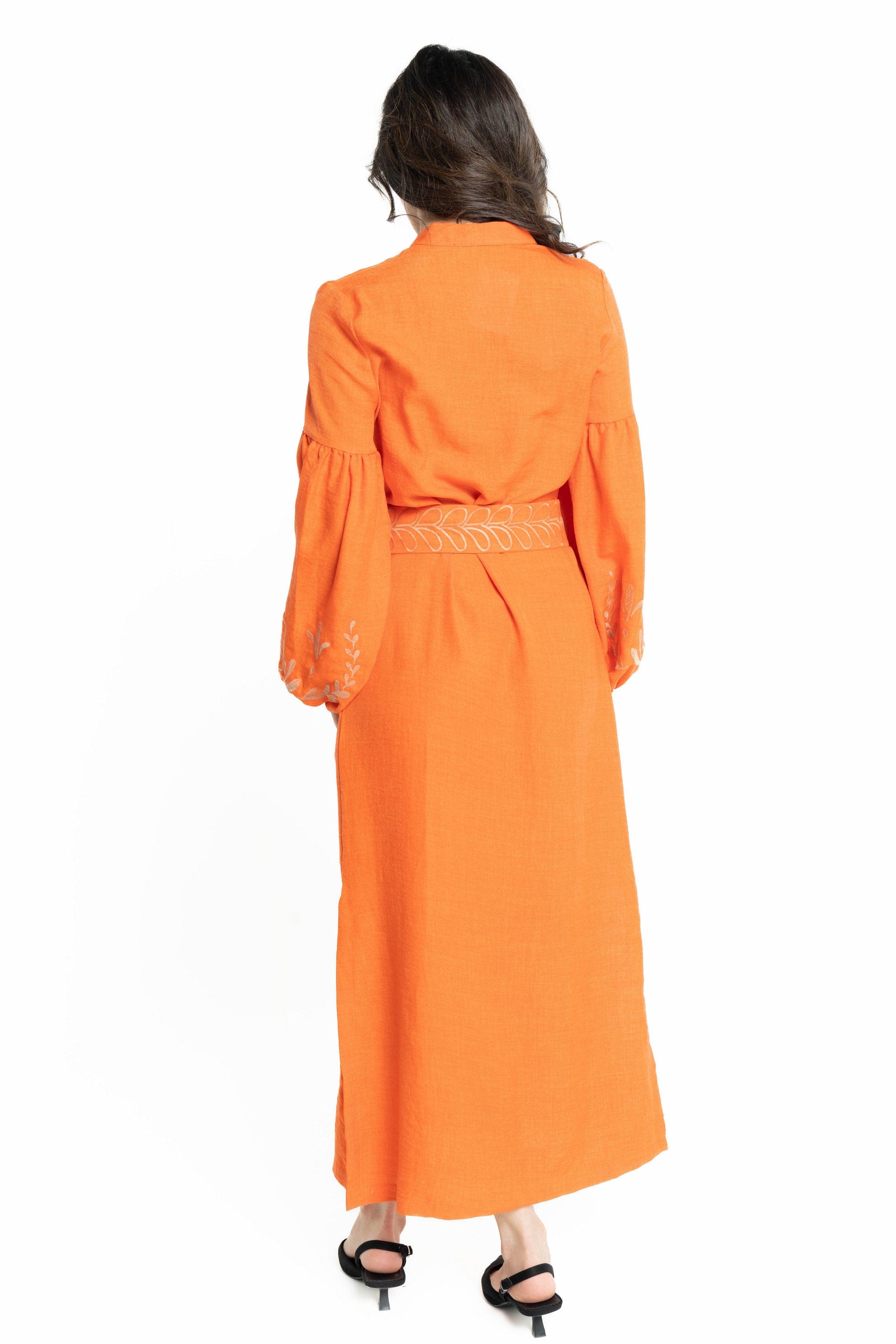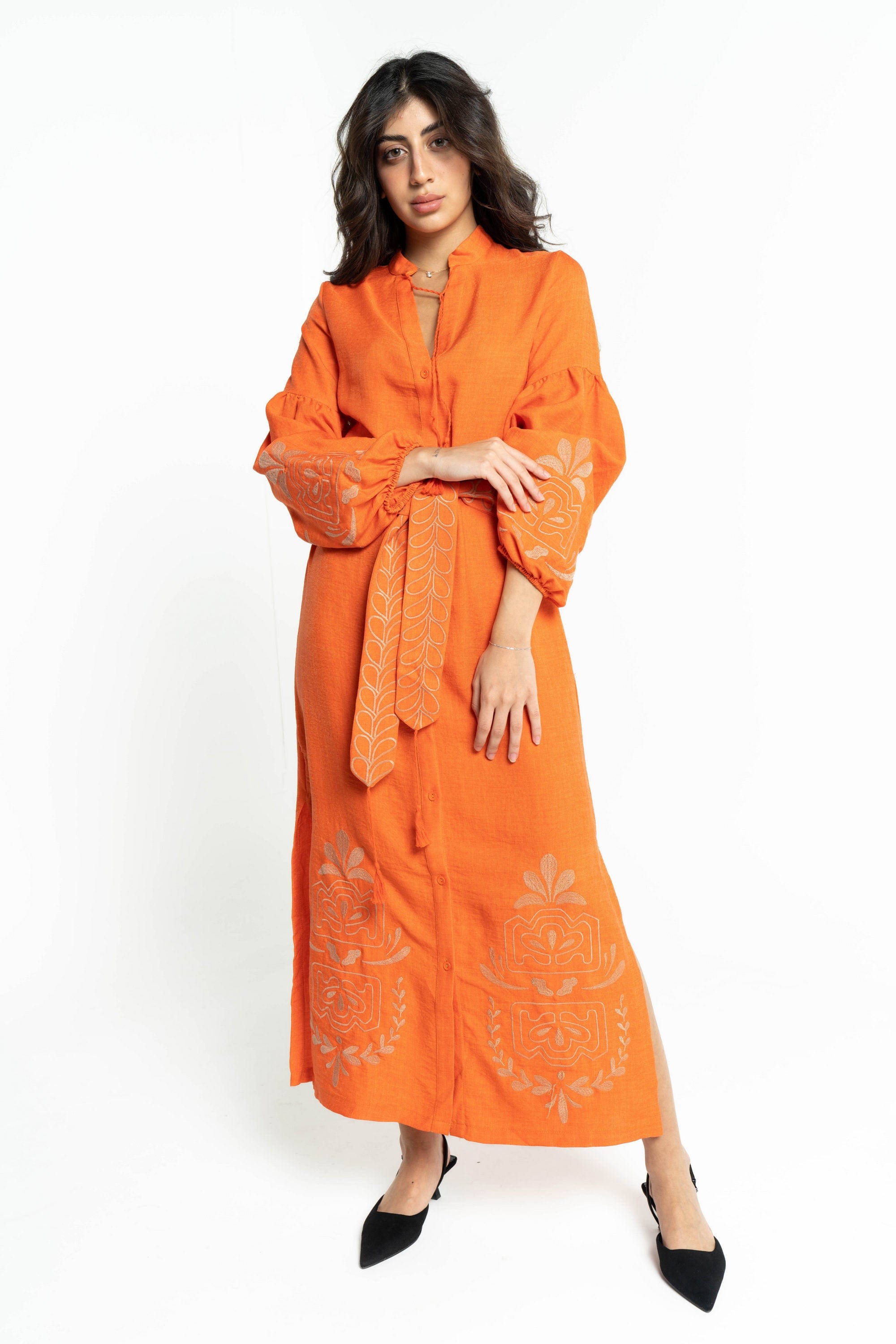 لما تبحثين عن فستان يومي مريح لكنه يحمل لمسة أنثوية مميزة، هذا الفستان رائع ويستحق التجربة. مصنوع بطبعات نقش عرقي باللون البرتقالي ويتميز بتطريز يظهر التفاصيل بعناية، سماكته المتوسطة تجعله مناسبًا للربيع والخريف. قصة A ماكسي تمنحك انسيابًا أنيقًا وحركة جميلة—ستحبين كيف يتحرك معك. ياقة صينية تضيف لمسة محافظة وعصرية، وأكمام بالون طويلة تضيف شخصية وإطلالة حيوية. الإغلاق بزر مع وجود حزام مرفق لتحديد الخصر حسب رغبتك. القصة عادية ومناسبة للبالغات، ومصمم ليكون جزءًا عمليًا من خزانة الكاجوال اليومية. مناسب للخروجات الصباحية أو لقاءات القهوة الهادئة، ويمكنك بسهولة تحويله لمظهر مسائي بسيط بإضافة إكسسوارات. اعثري على مقاسك في فاشن السعودية وأضيفي هذه القطعة المتنوعة إلى خزانة ملابسك اليوم.