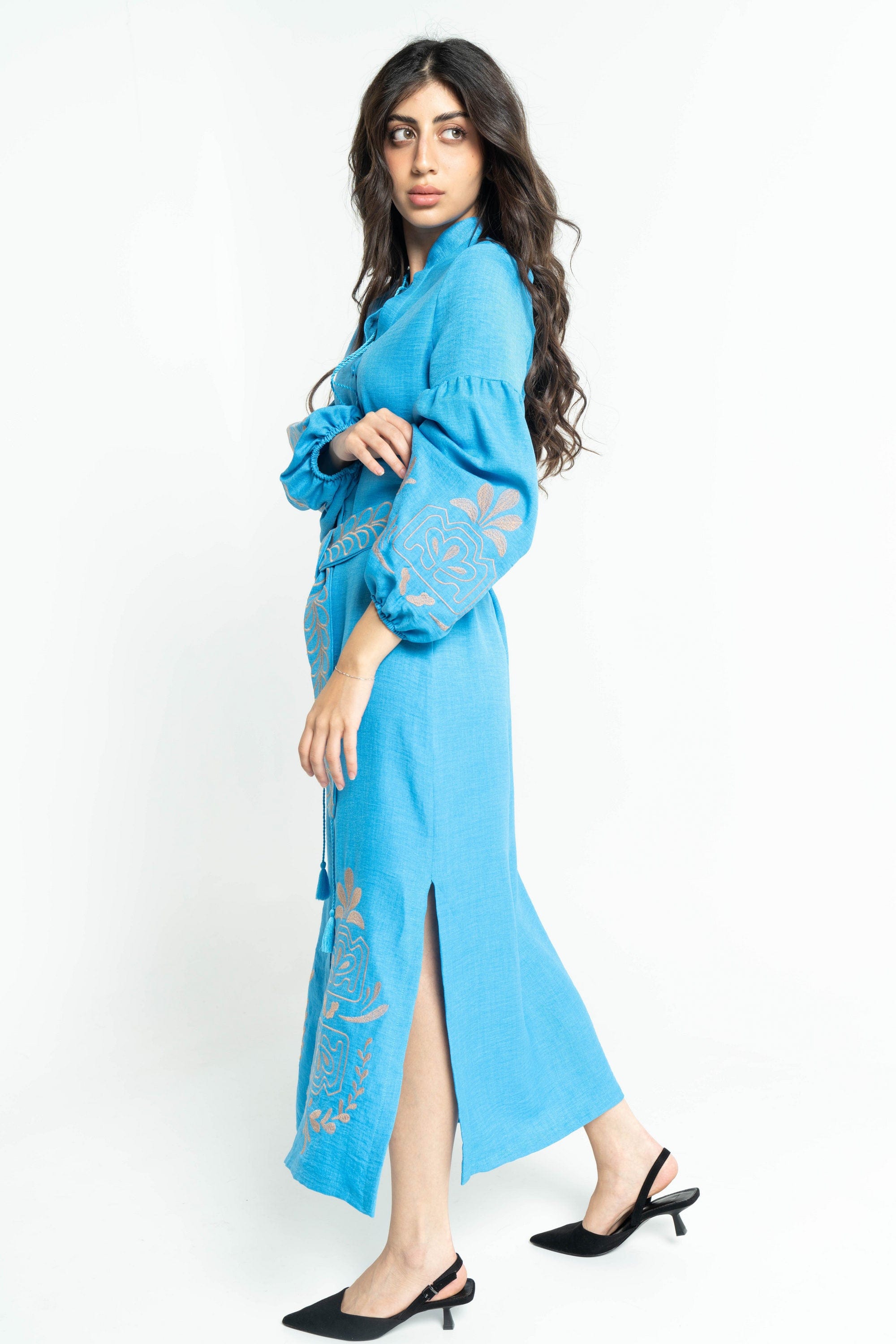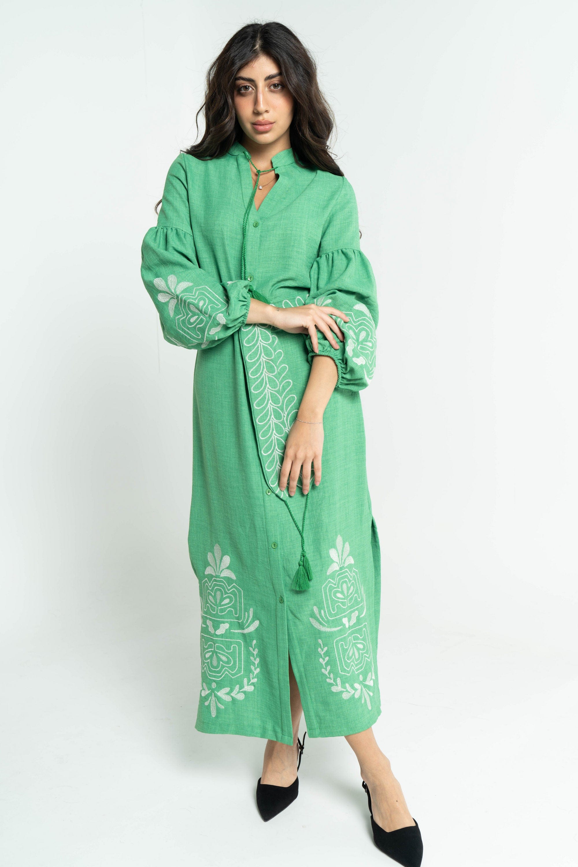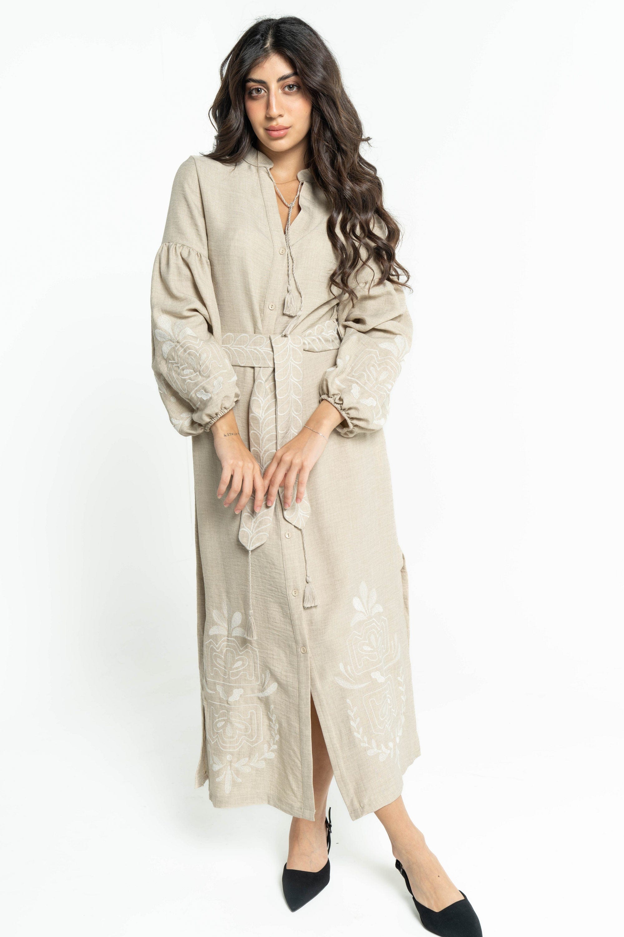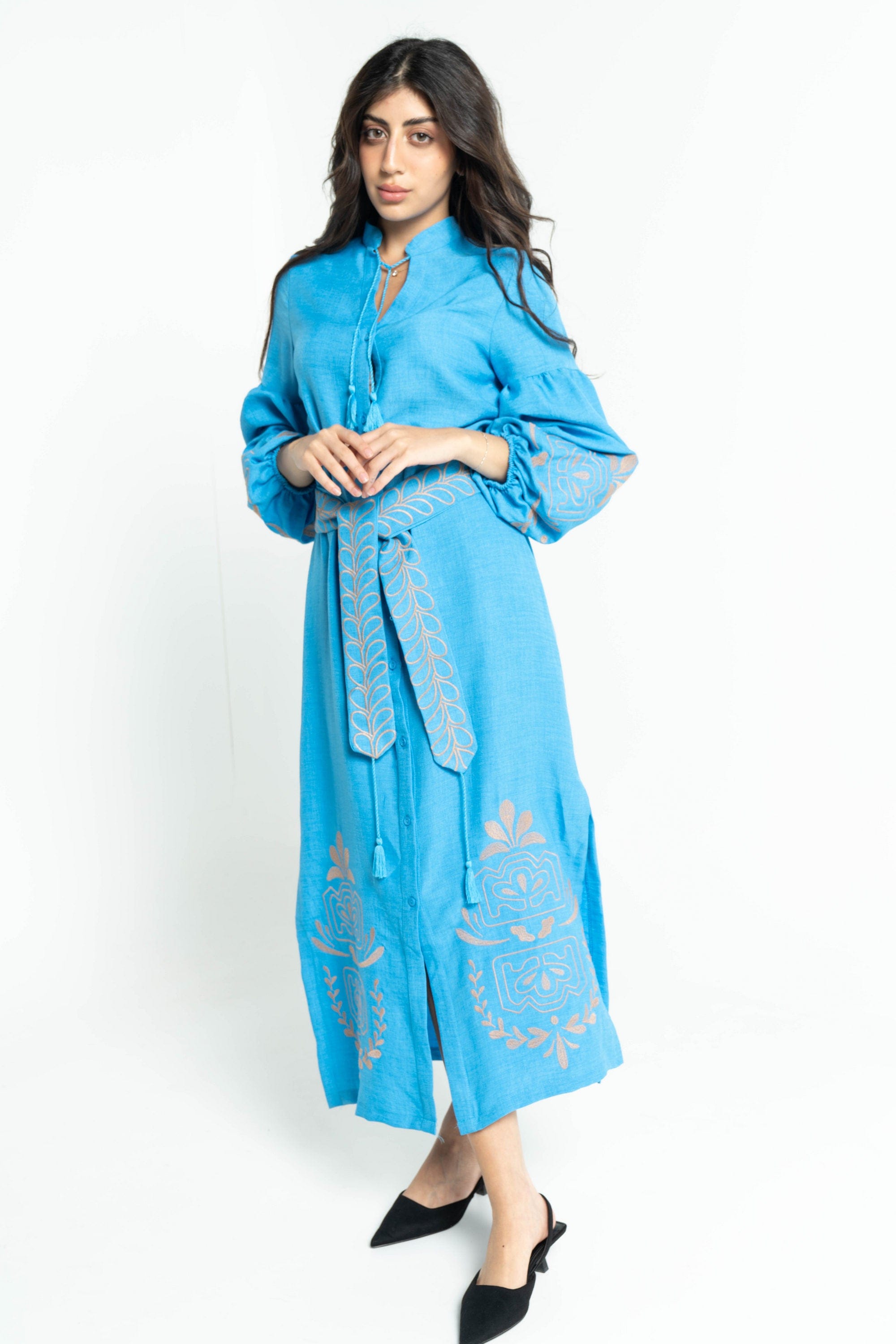 - العناية: يفضل غسيل يدوي أو غسيل على دورة لطيفة داخل كيس غسيل، اغسلي بالماء البارد مع قلب الفستان، تجنبي المبيضات، وكوي من الجهة الداخلية بدرجة حرارة منخفضة للحفاظ على التطريز.