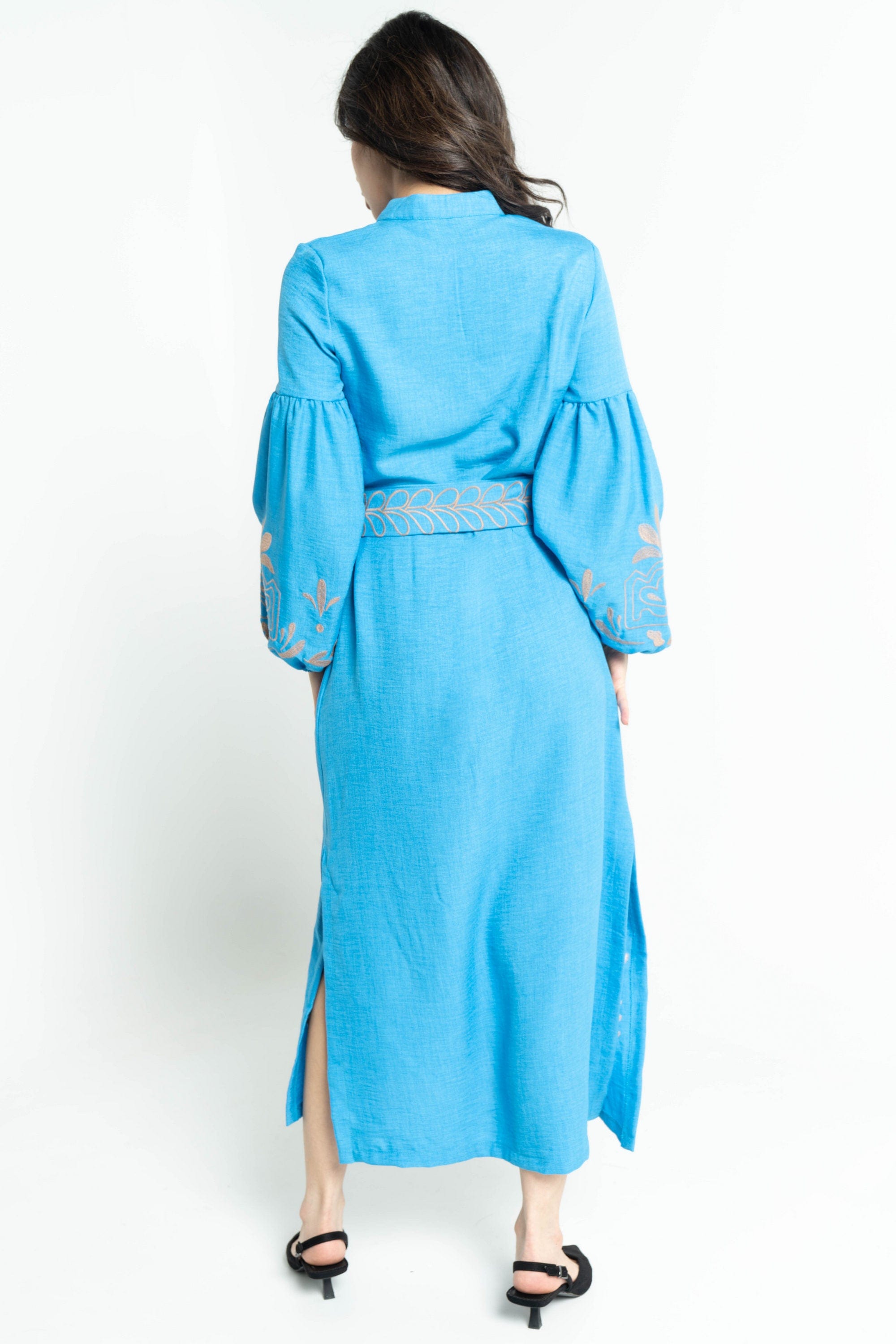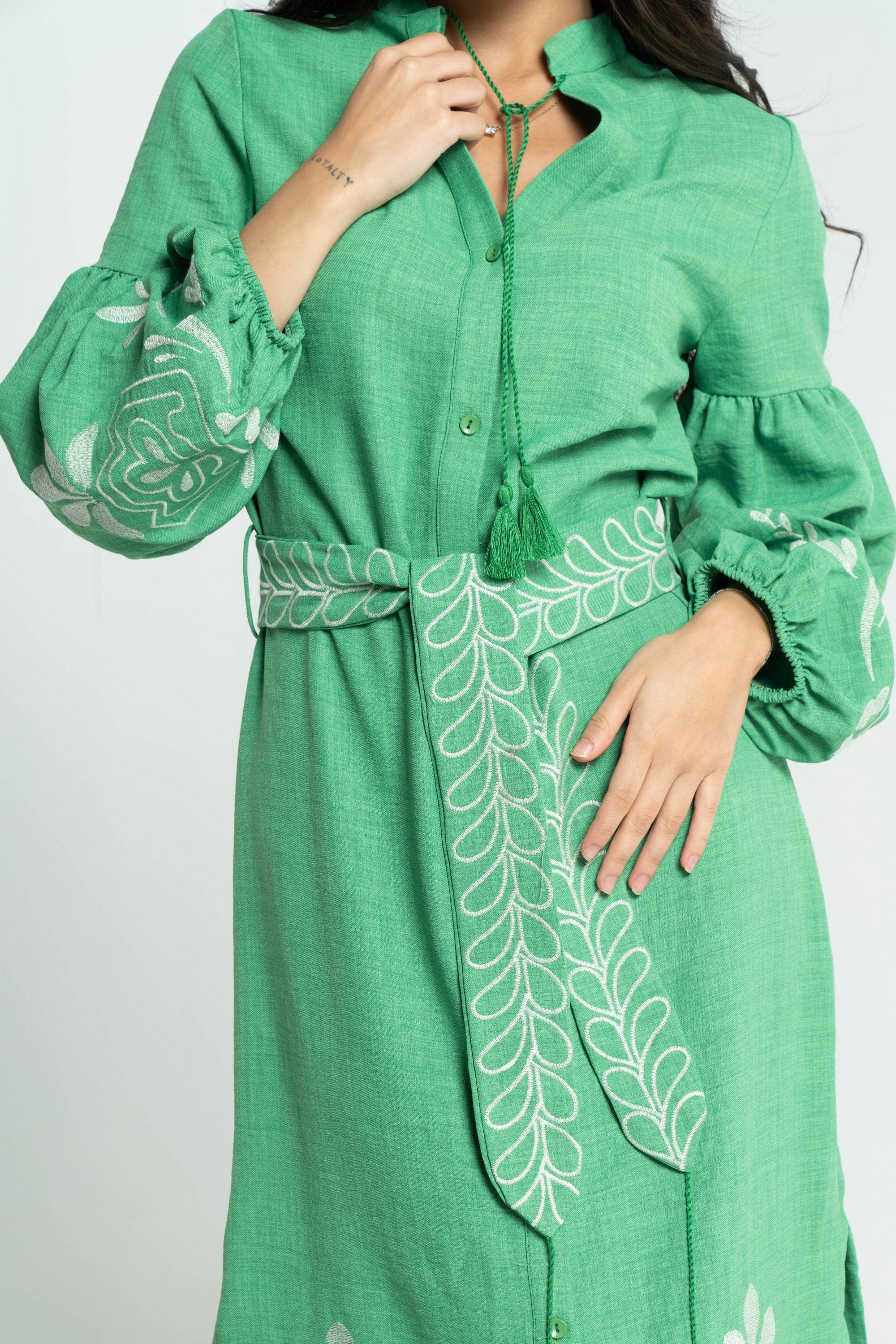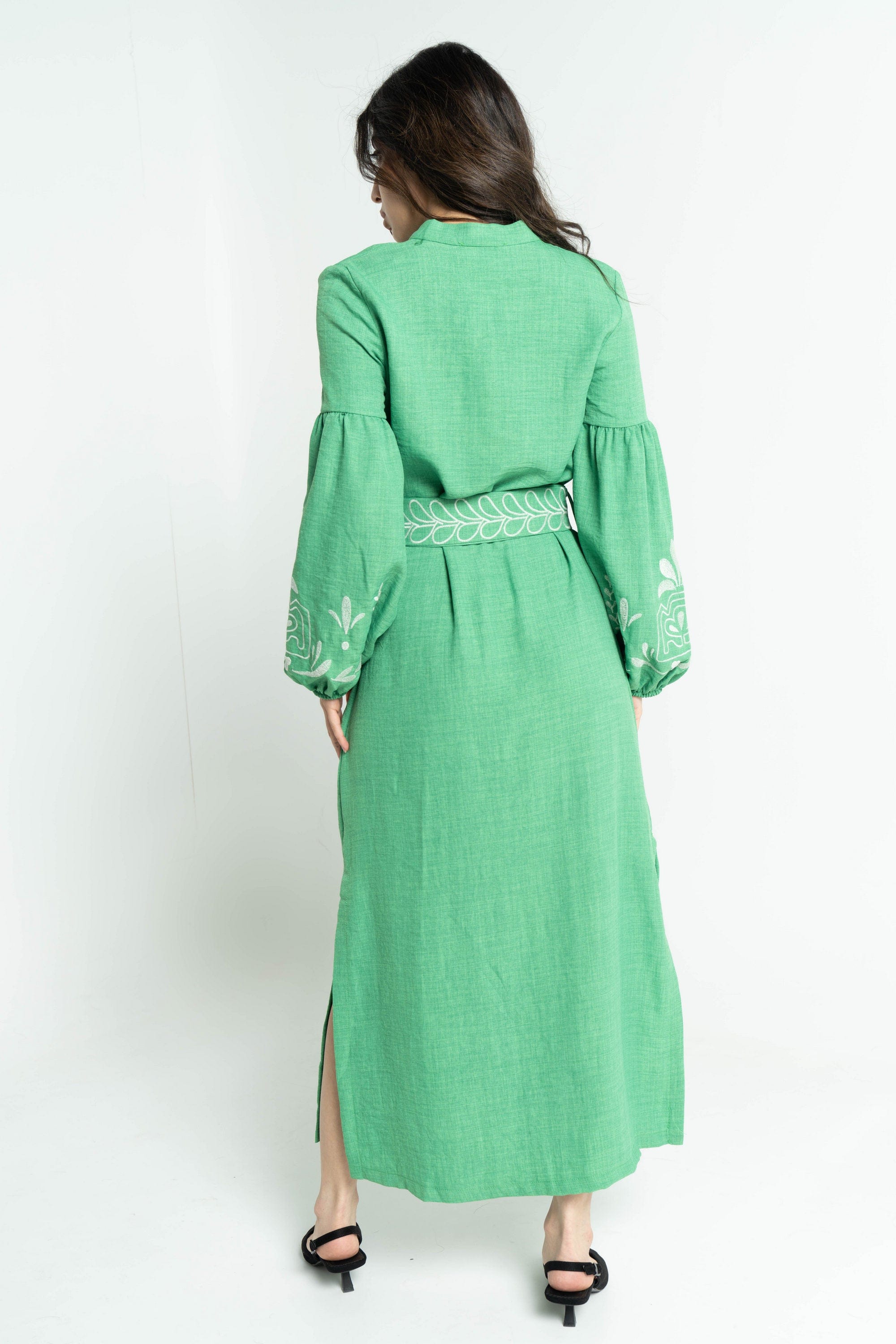 فستان نسائي طويل منقوش من الكم ومن الاسفل وبحزام على الخصر