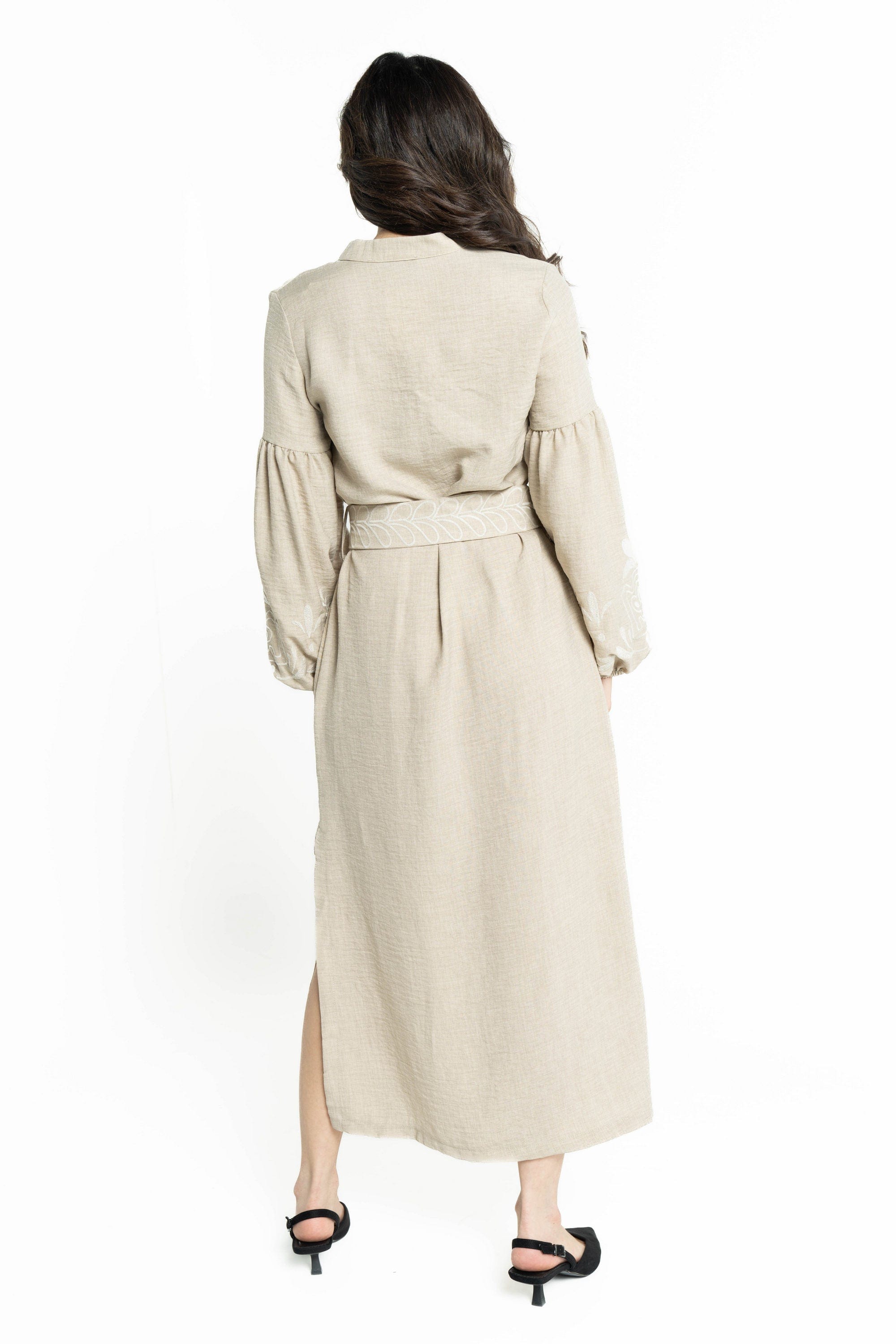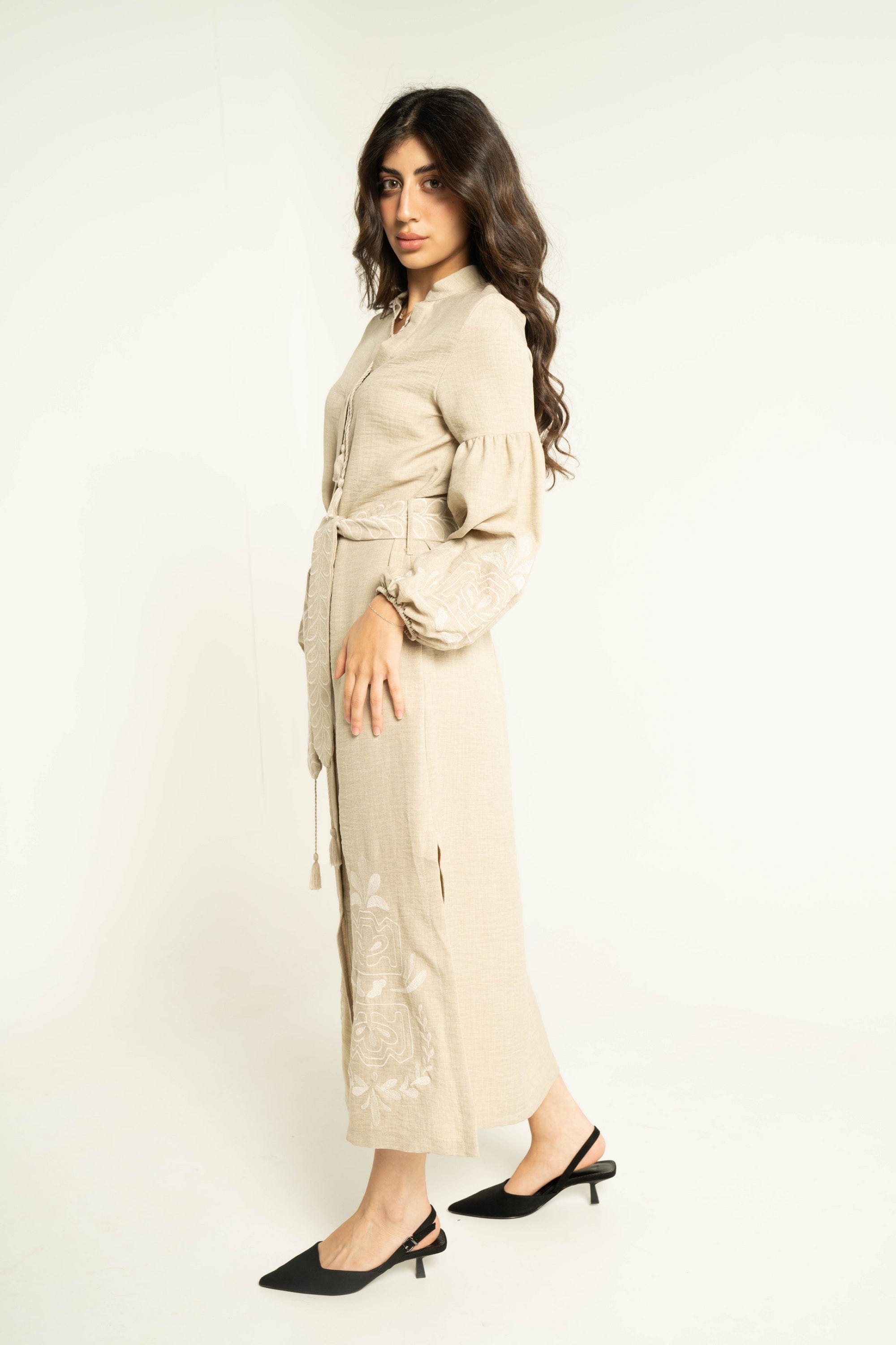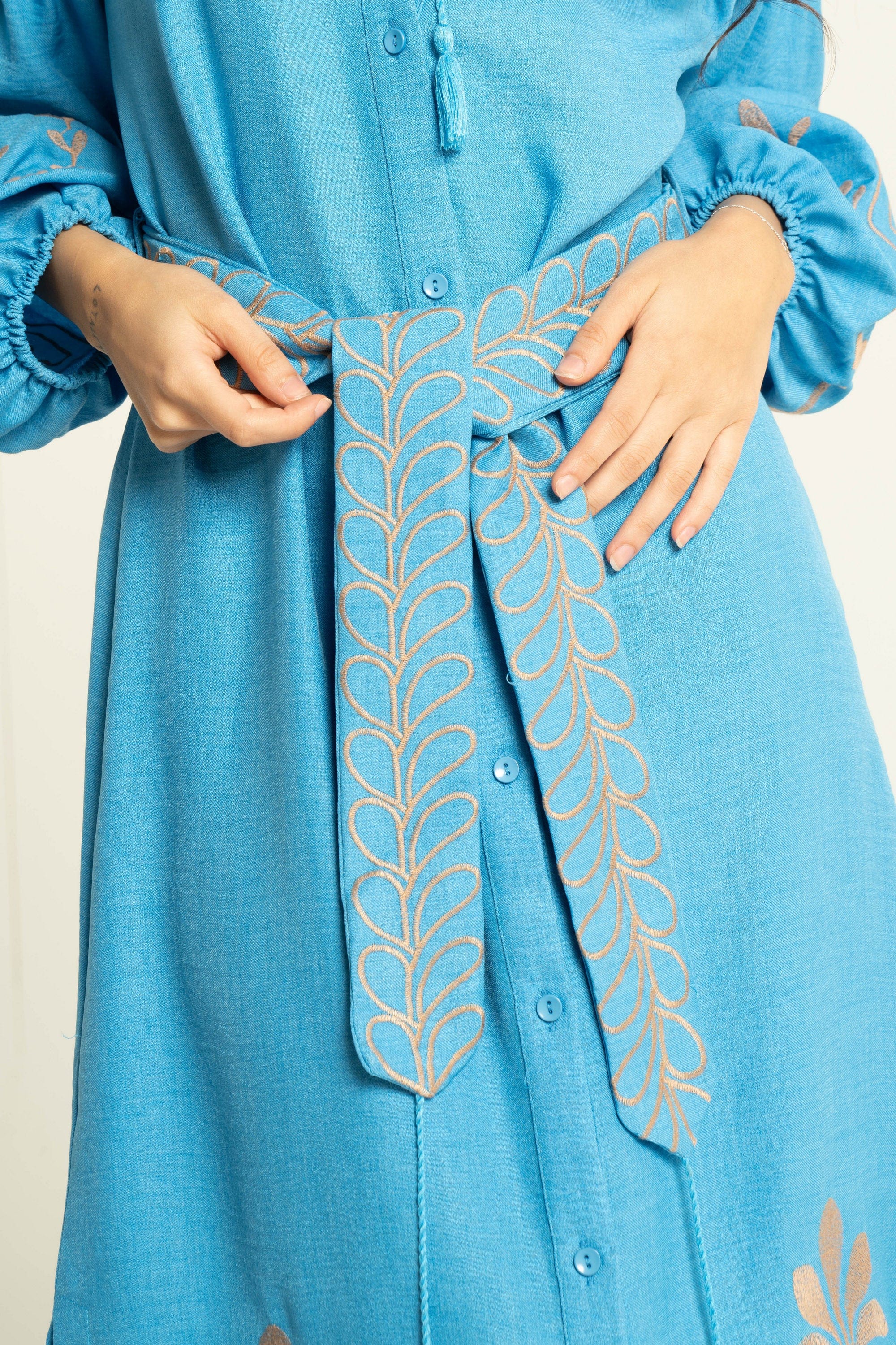 فستان نسائي طويل منقوش من الكم ومن الاسفل وبحزام على الخصر
