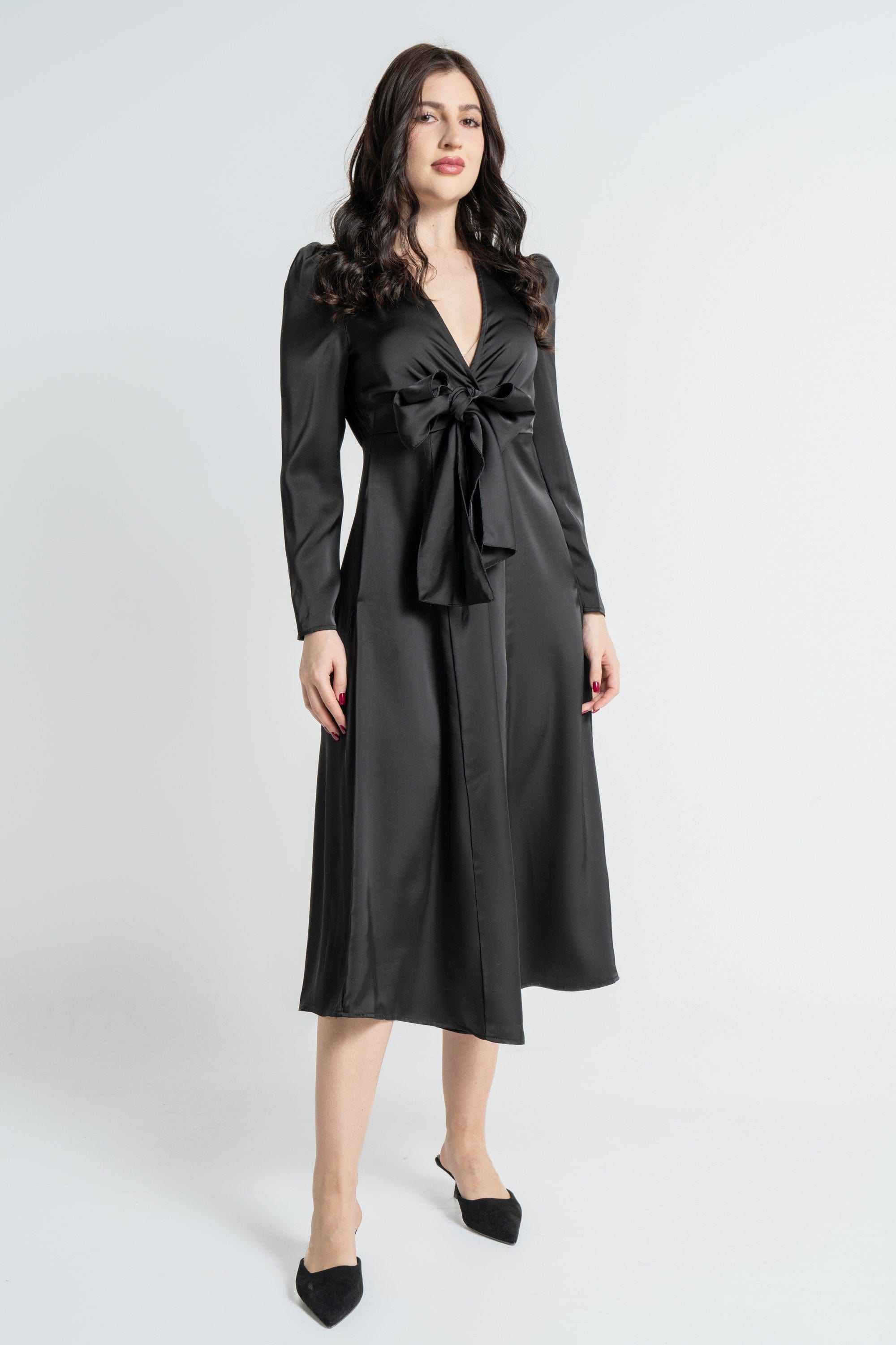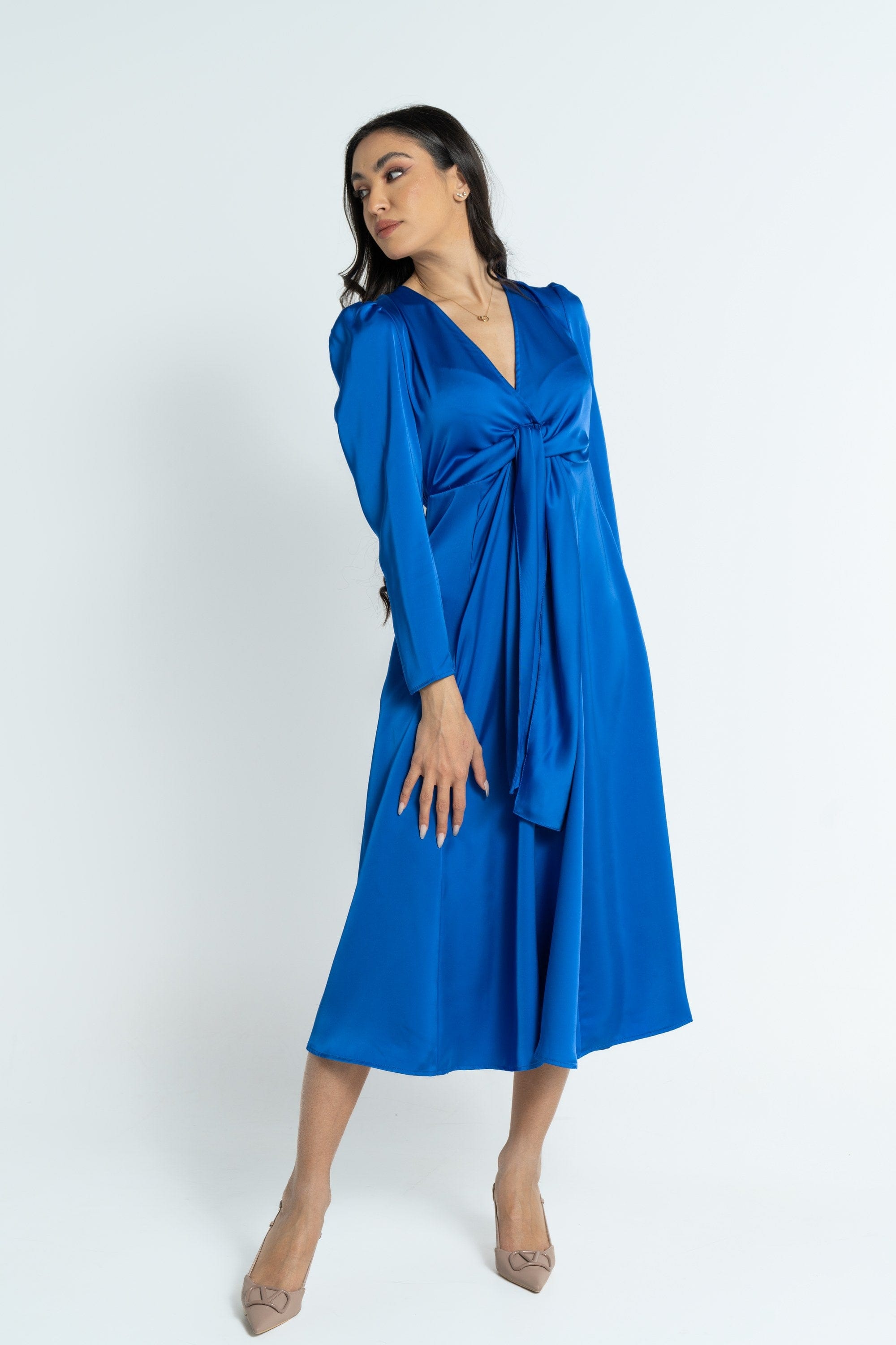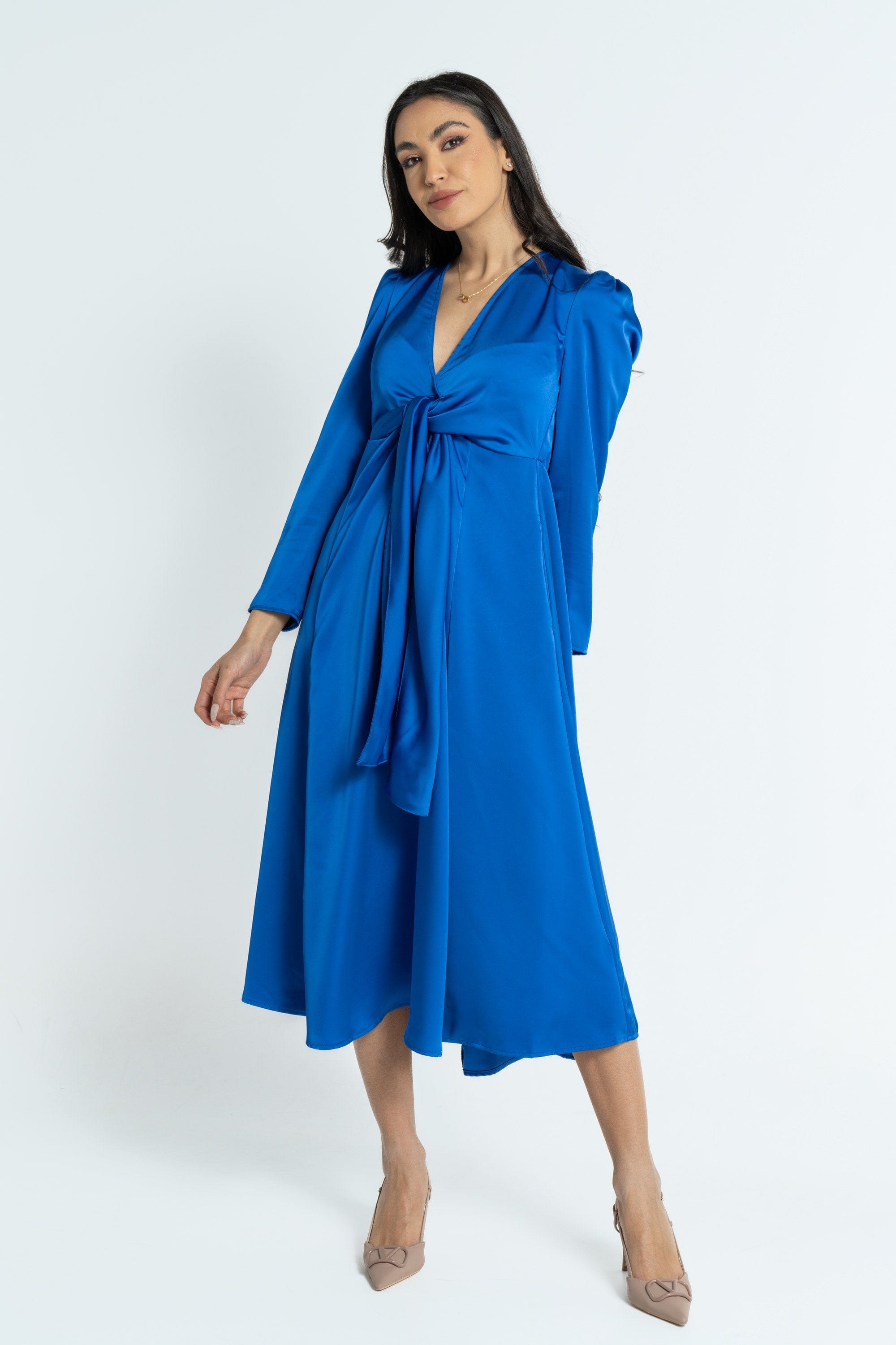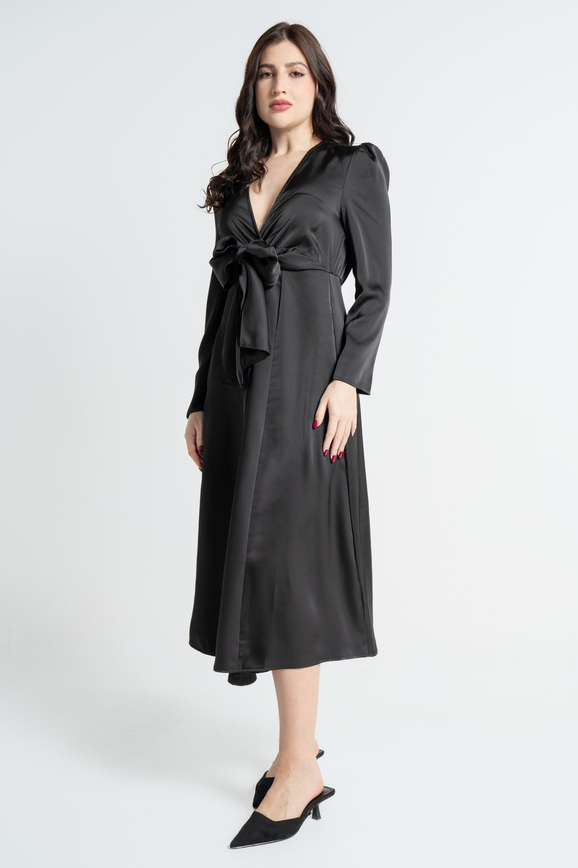 فستان ميدي بأكمام طويلة بربطة صدر نسائي
