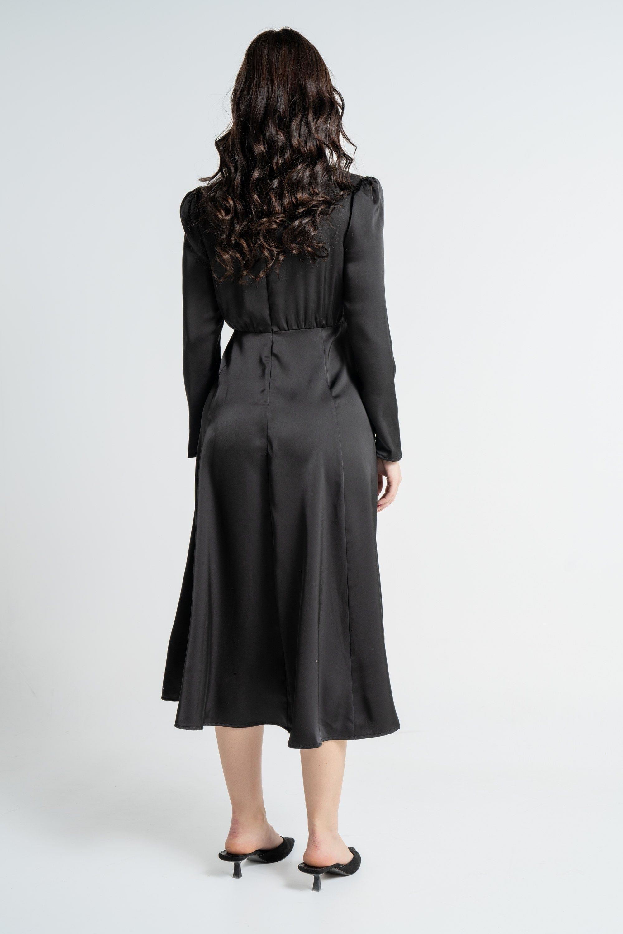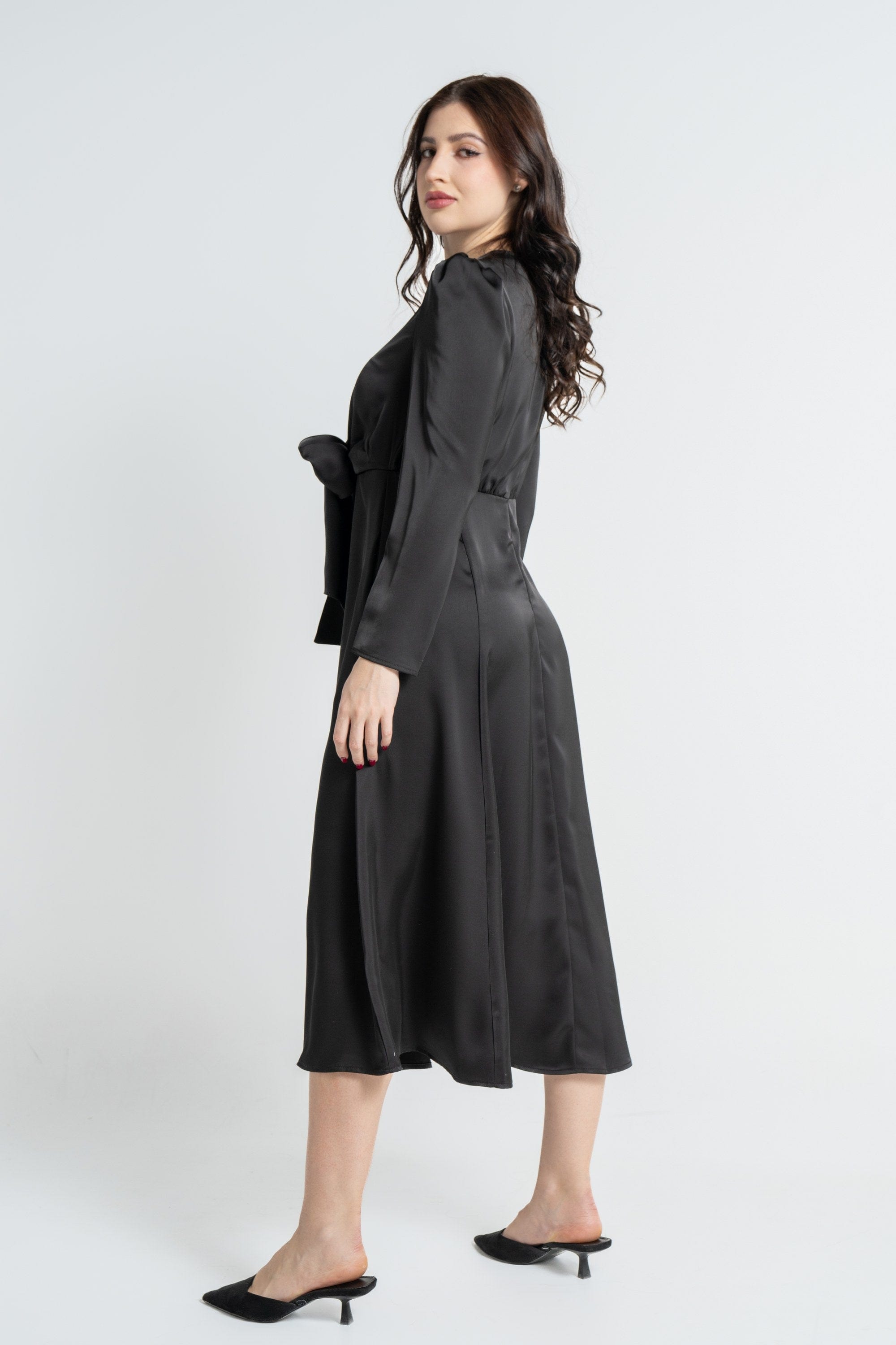 - التنسيق: نسِّقيه مع صندل منخفض للنهار أو حذاء بكعب متوسط للمساء. لإطلالة شتوية أضيفي معطفًا خفيفًا أو كارديغان، واستخدمي الحزام المرفق لتحديد الخصر. مناسب للخروجات الرومانسية والاجتماعات والسهرات الأنيقة.