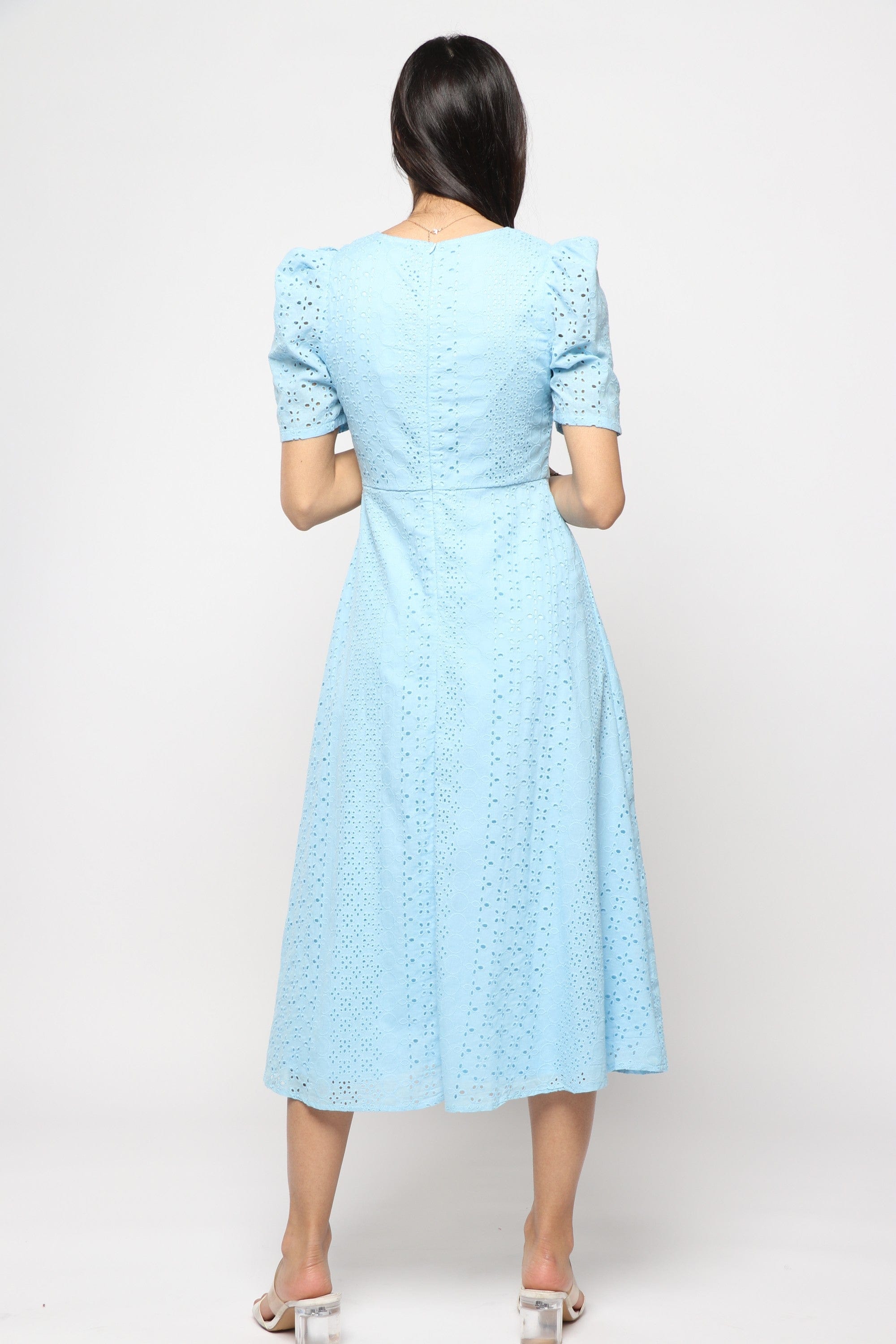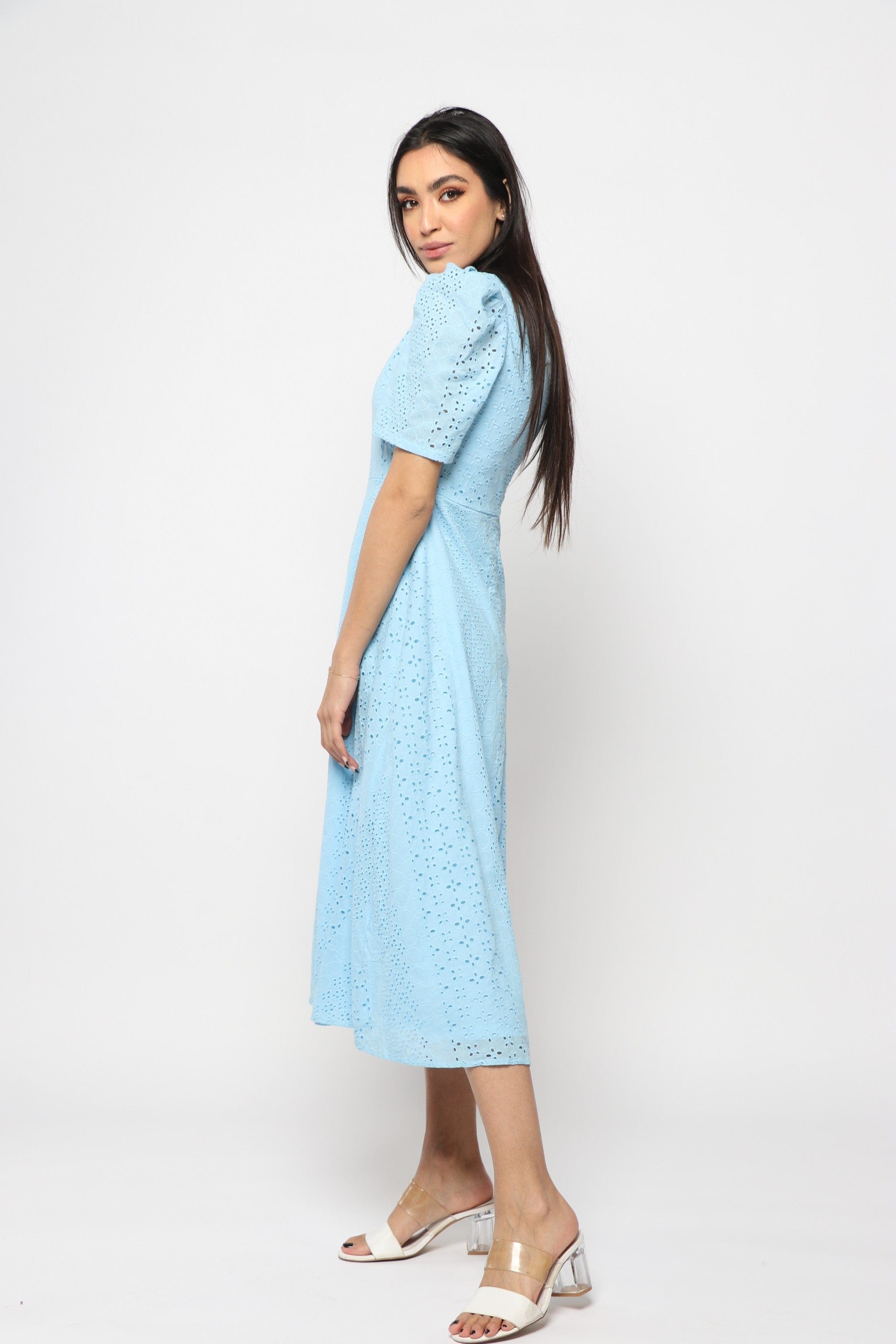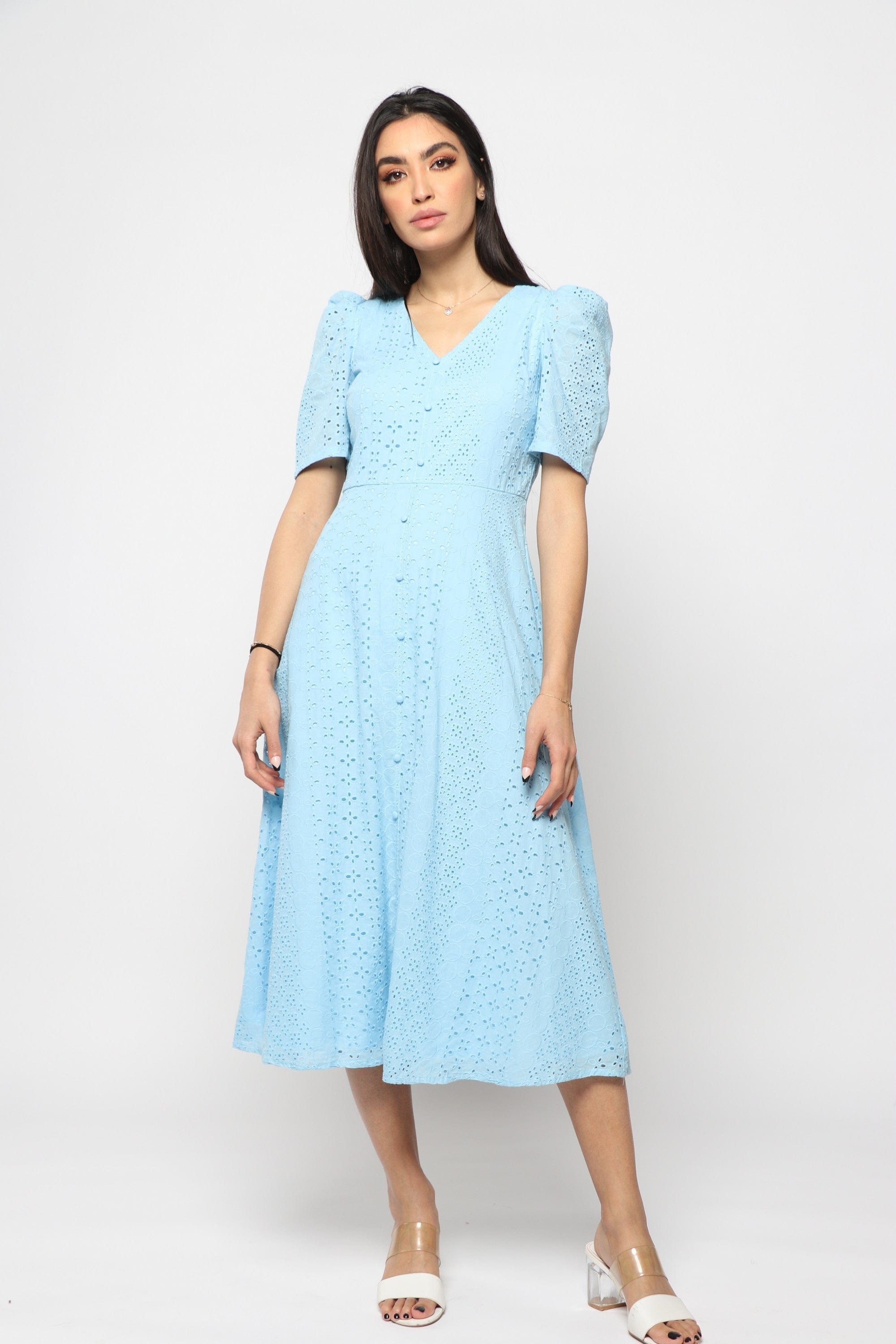 إذا كنت تبحثين عن فستان يومي أنثوي يبرُز التفاصيل دون تكلف، فستحبين هذا الفستان الأزرق بقصة A ميدي. القماش الرئيسي 100% قطن يمنحك لمسة ناعمة ومريحة طوال اليوم، مع ذكر وجود بطانة 100% بوليستر في بعض التفاصيل بينما التصميم العام خفيف بلا بطانة داخلية ليبقى مناسباً للربيع والخريف. النقشة مطرزة تضيف طابعاً مميزاً والأكمام القصيرة المنفوخة تمنح إطلالة حيوية وأنثوية، وياقة V تضيف لمسة أناقة بسيطة. الفستان يُغلق بأزرار أمامية وبدون جيوب أو حزام، سُمكه متوسط مما يجعله عملي للخروجات الصباحية ولللقاءات الكاجوال. ستحبين كيف يتحرك معك طول الميدي، ويمكنك الاعتماد عليه لخزانة يومية مريحة وأنيقة للبنات البالغات. اعثري على مقاسك في فاشن السعودية وأضيفي هذه القطعة المتنوعة إلى خزانة ملابسك اليوم.