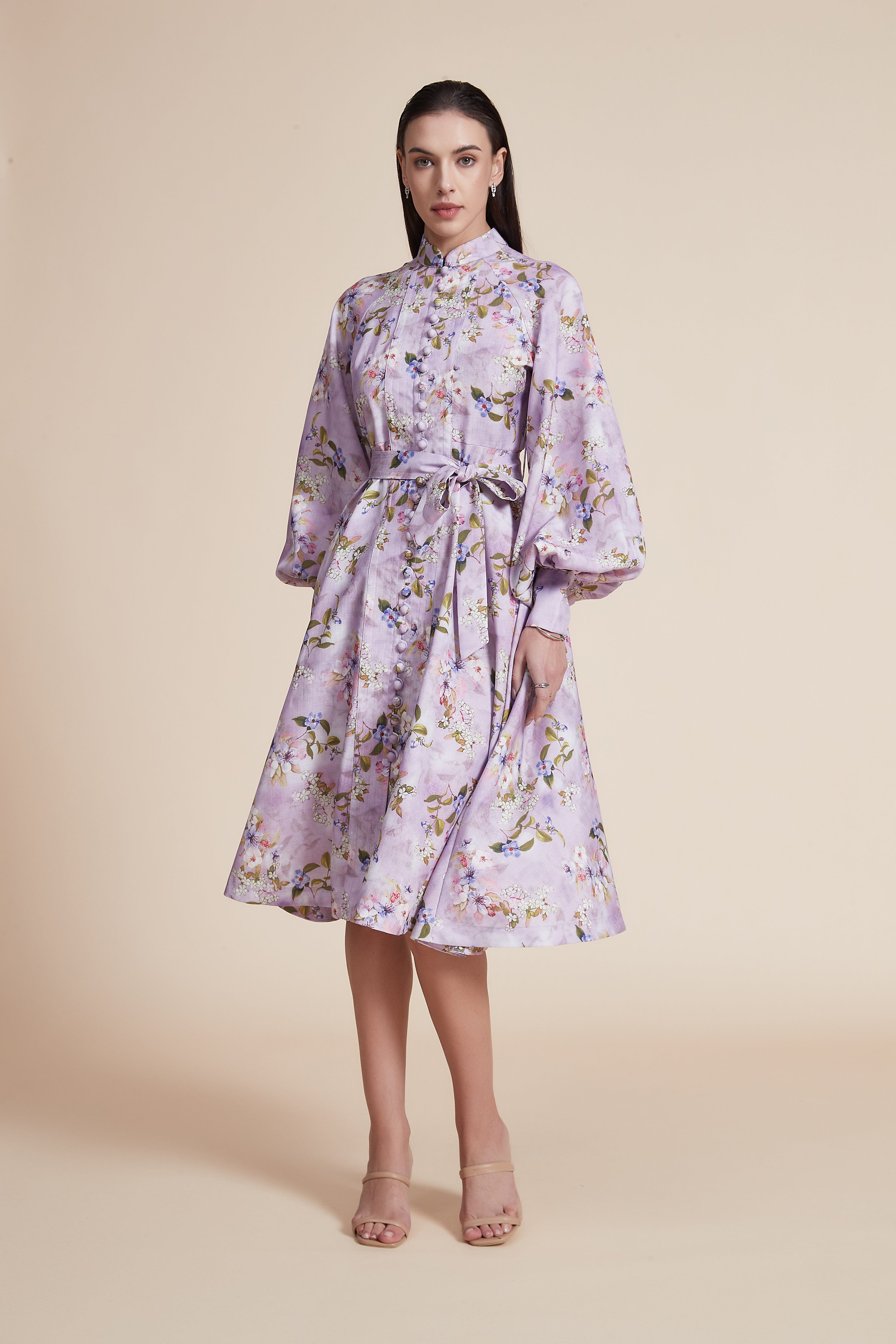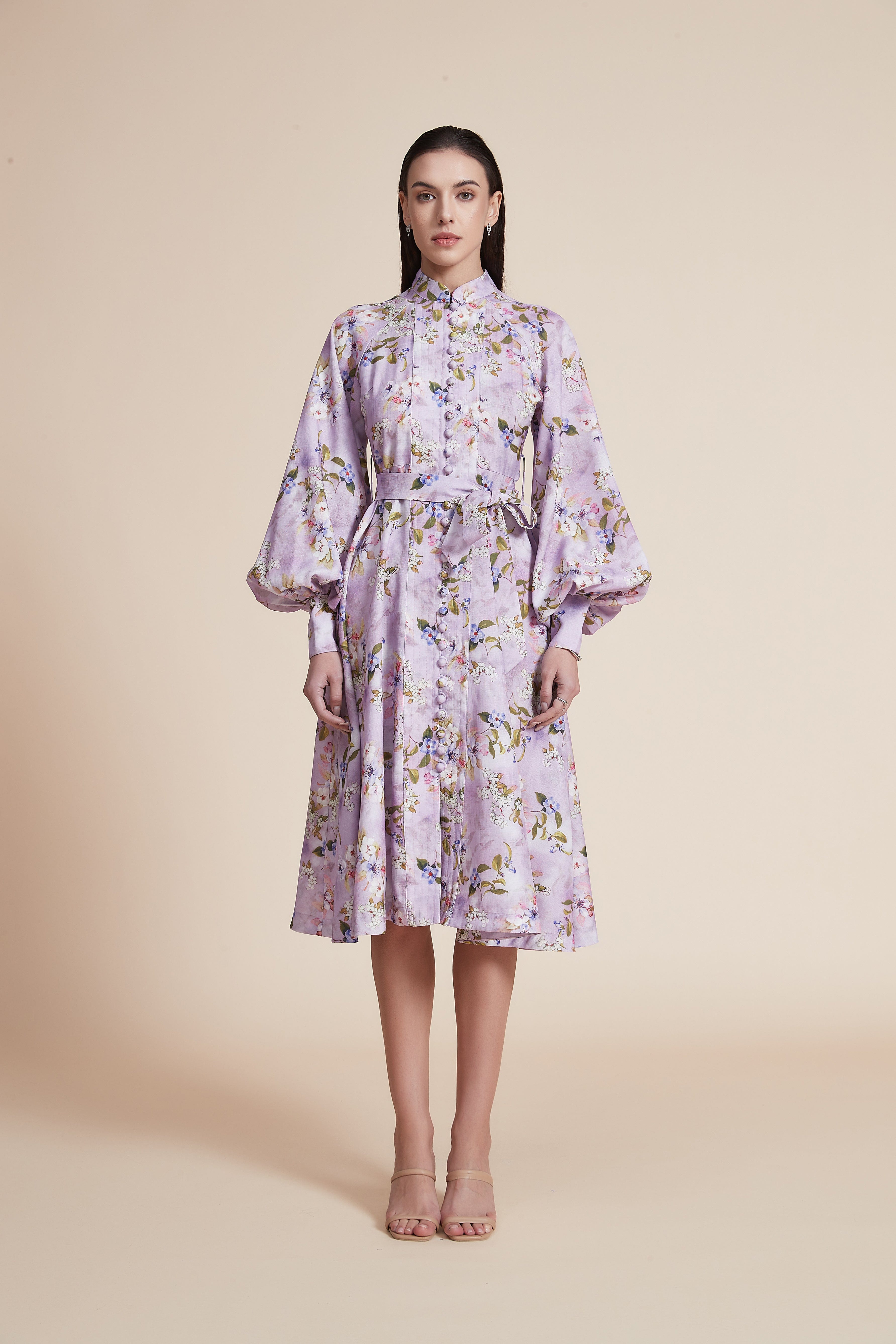- ياقة صينية وأكمام منفوشة طويلة تضيف أناقة وحركة