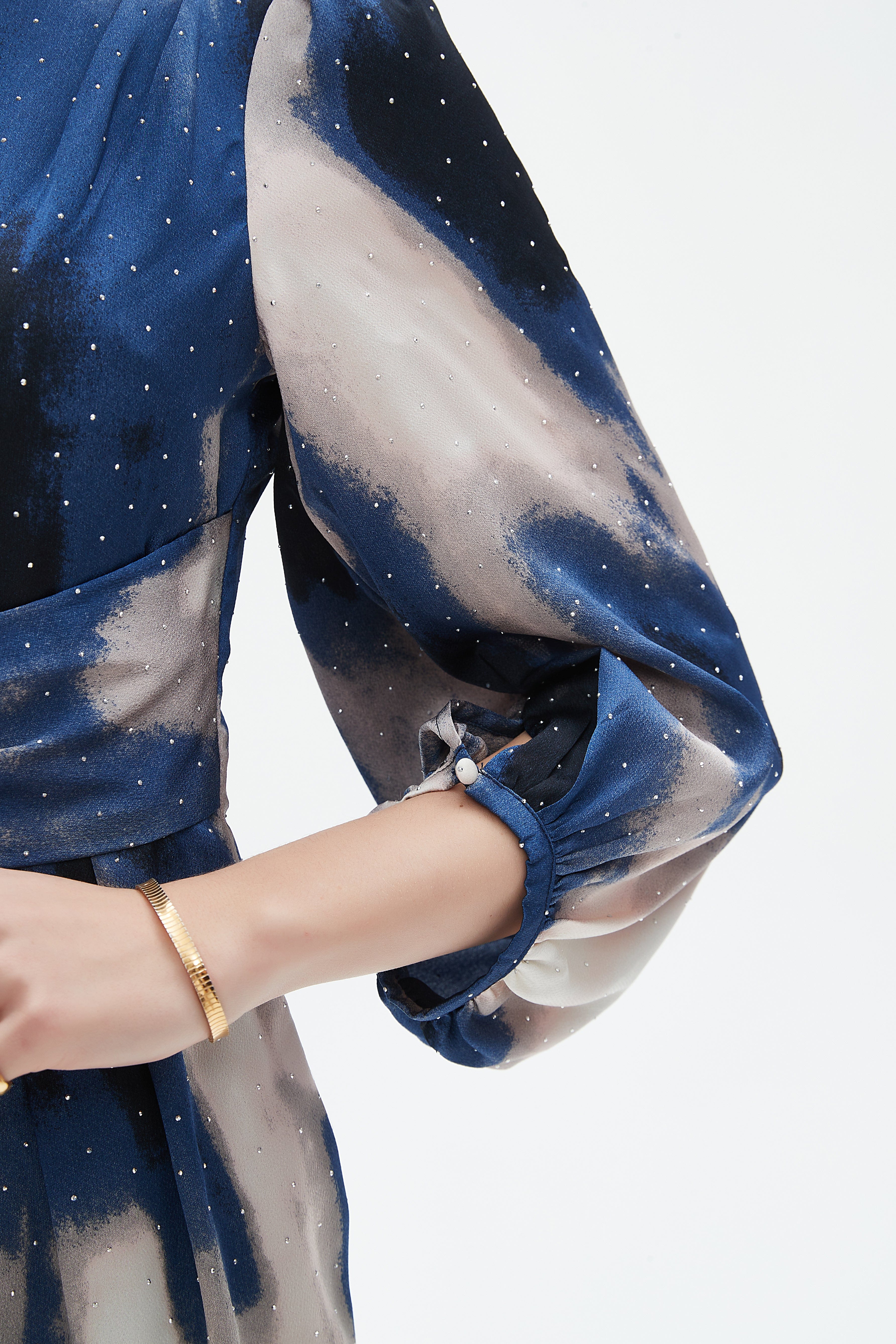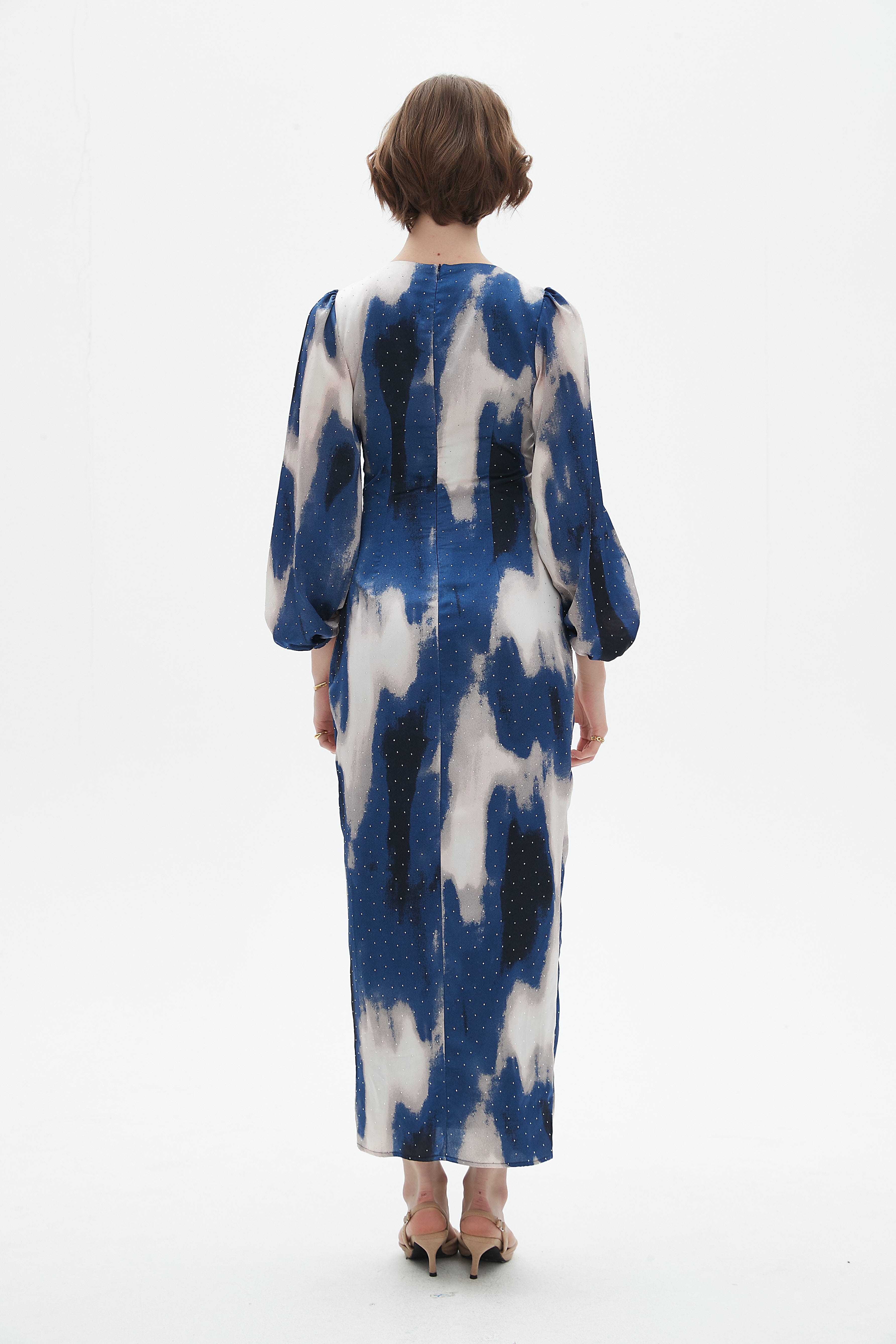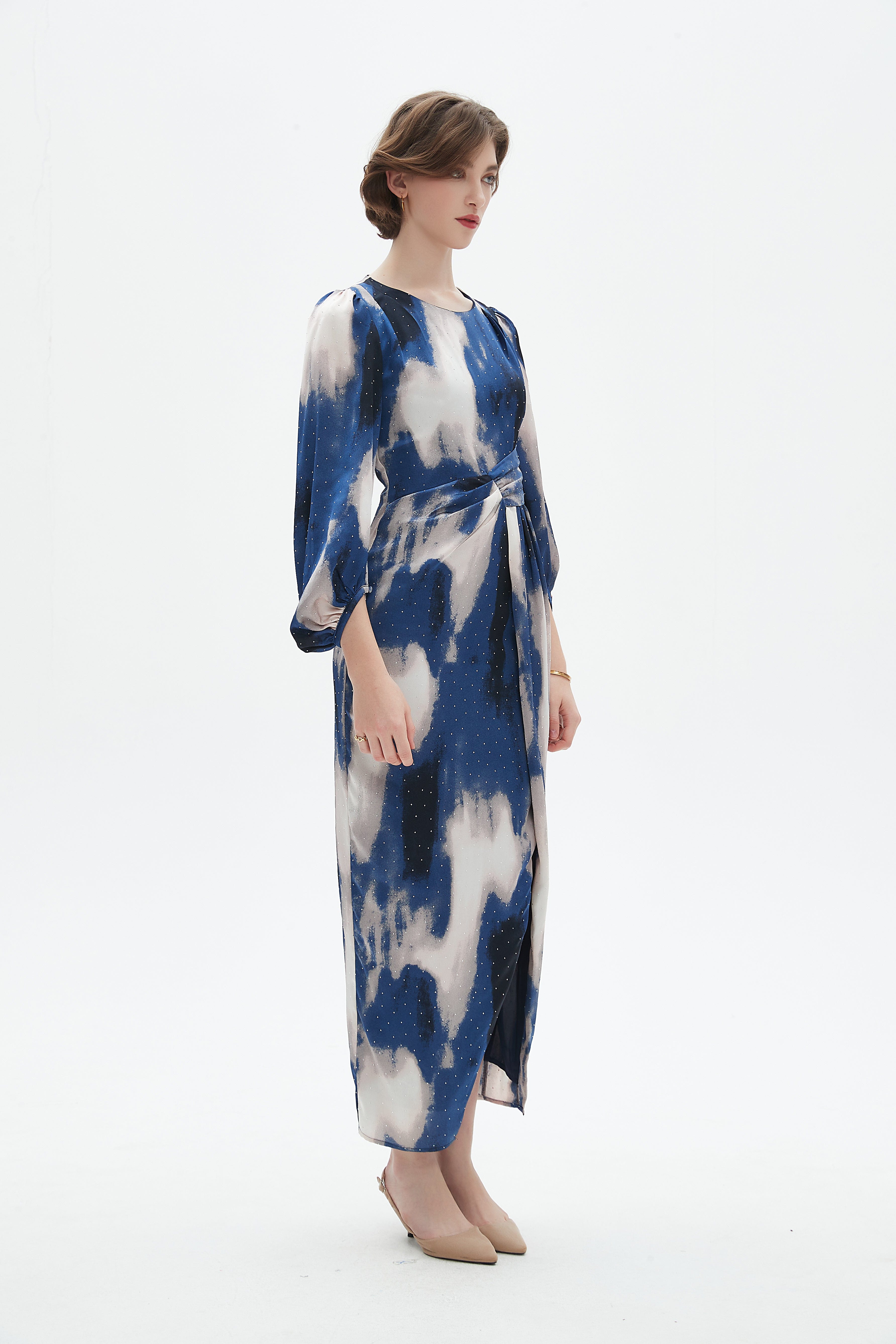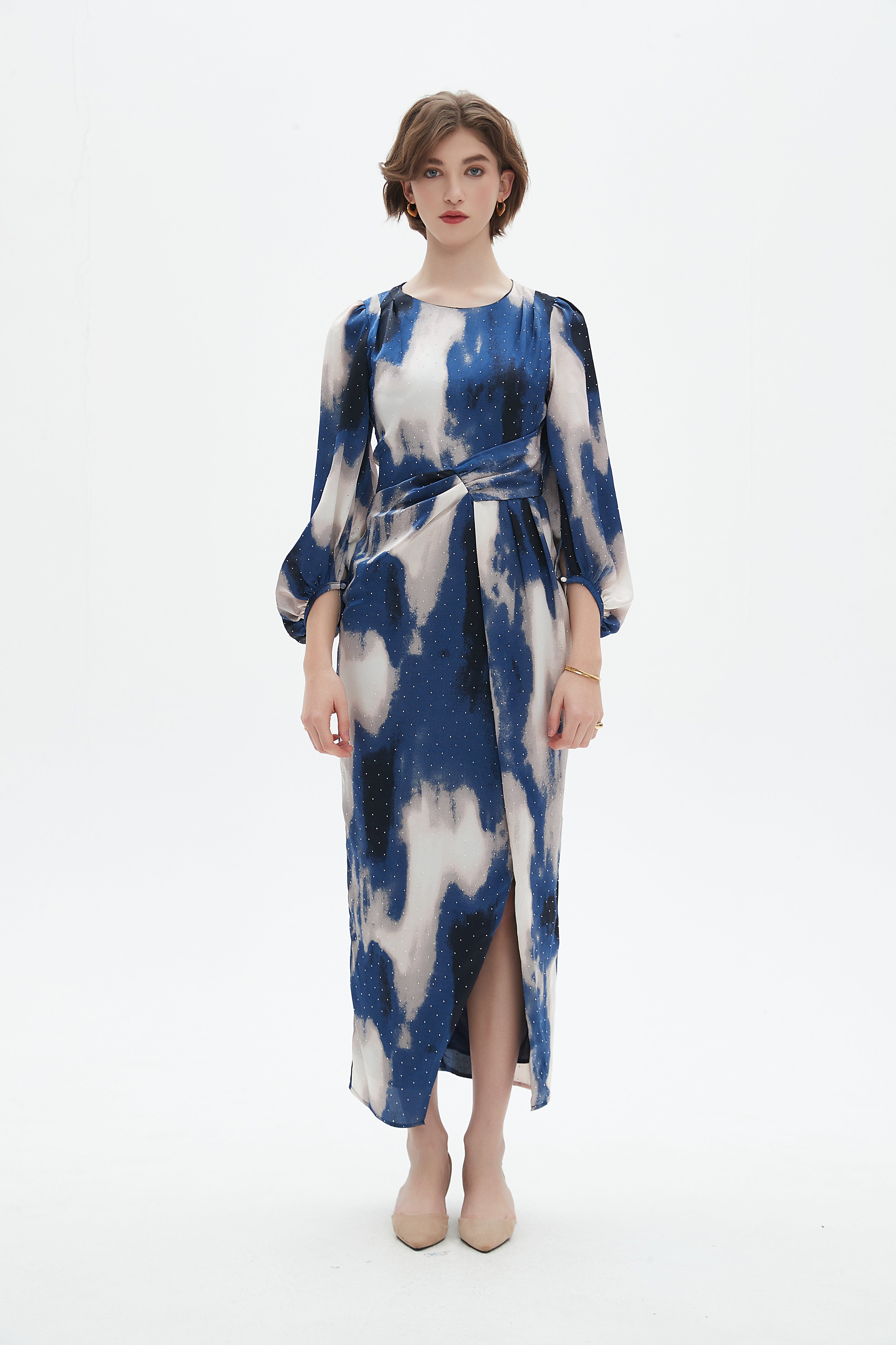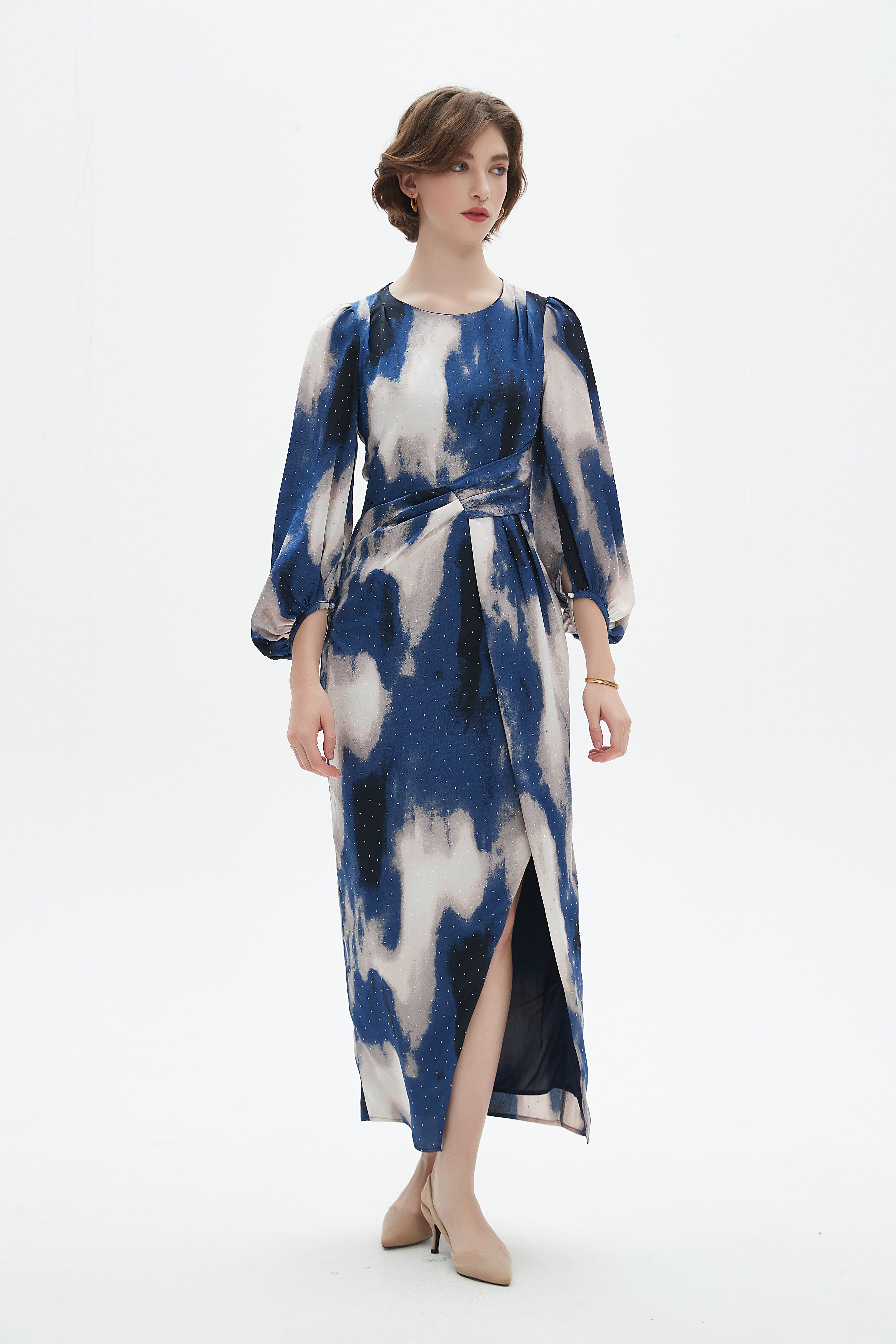 فستان طويل بأكمام طويلة واسعة وفتحة رقبة دائرية منقوش ومنقط