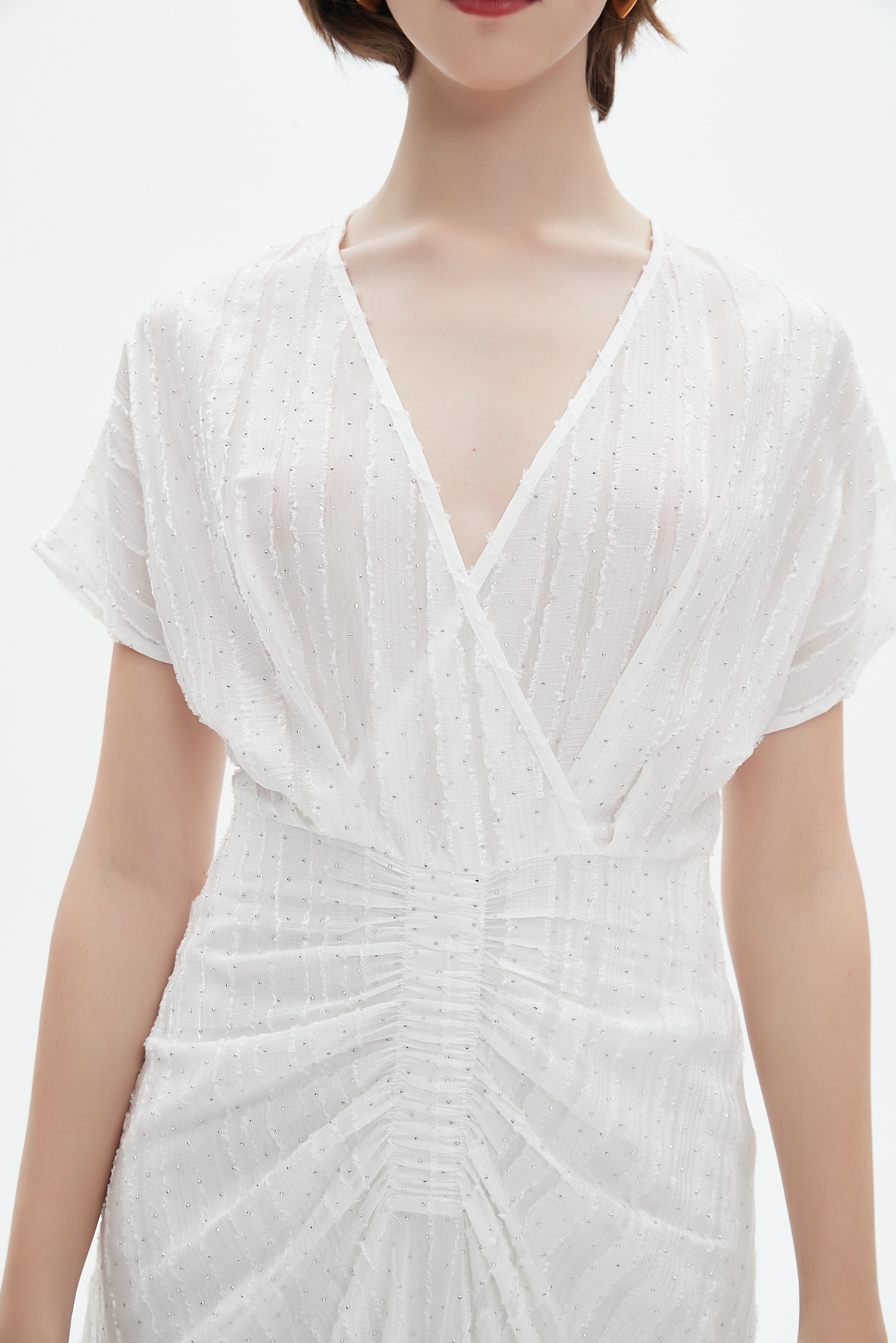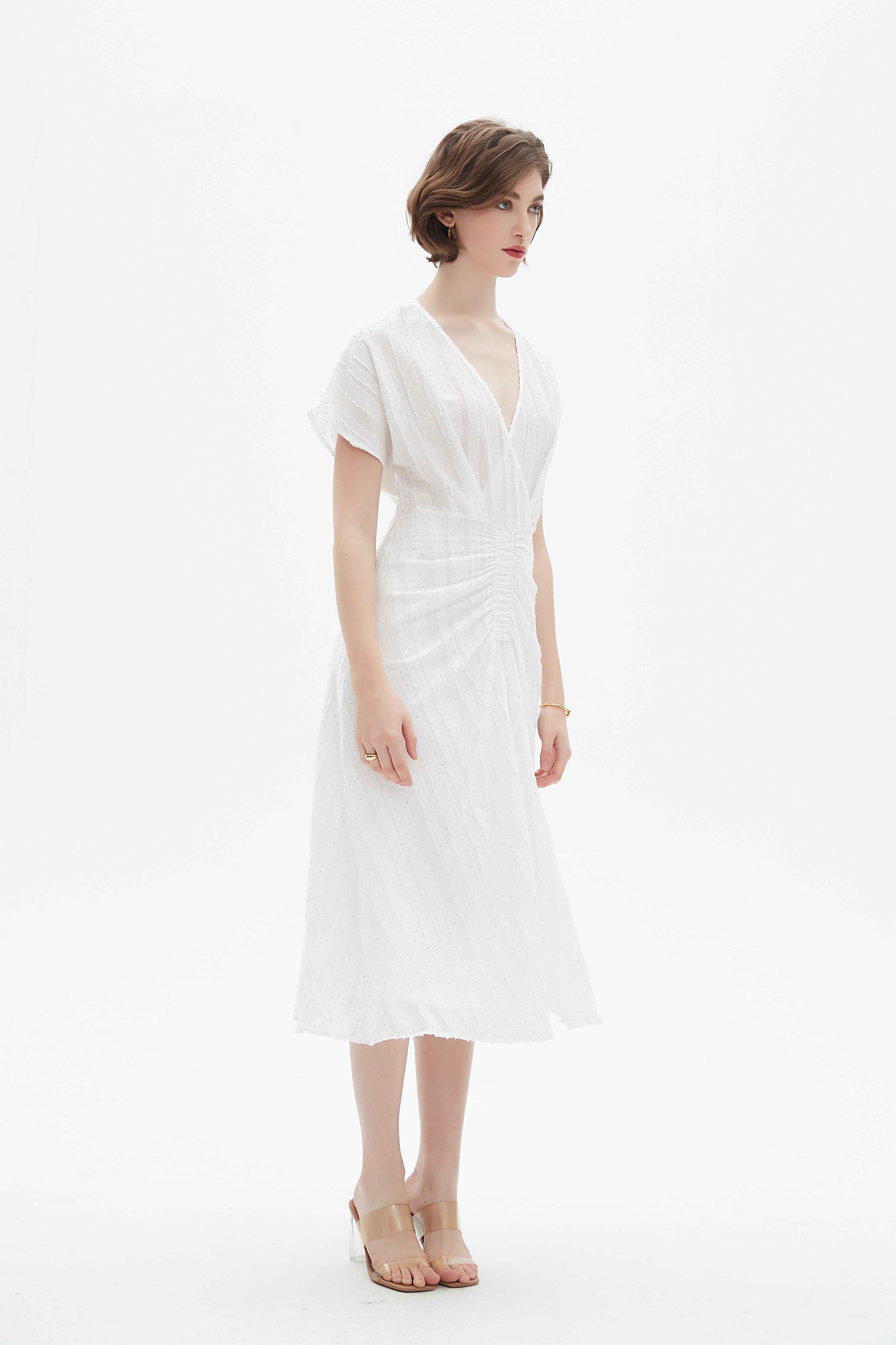 فستان ميدي كم قصير مكشكش وفتحة رقبة على شكل V