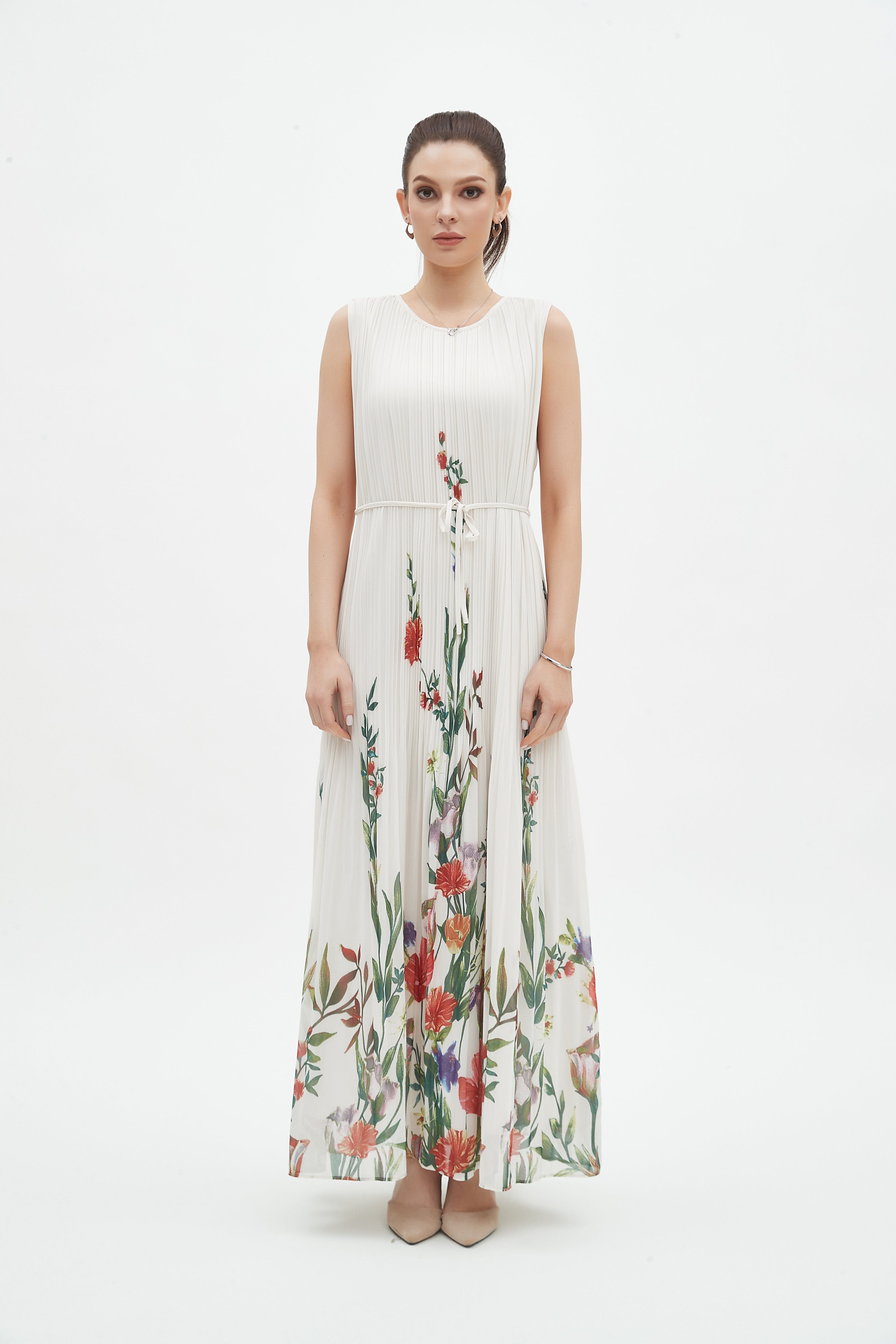 فستان ماكسي مورد بدون أكمام وفتحة رقبة دائرية