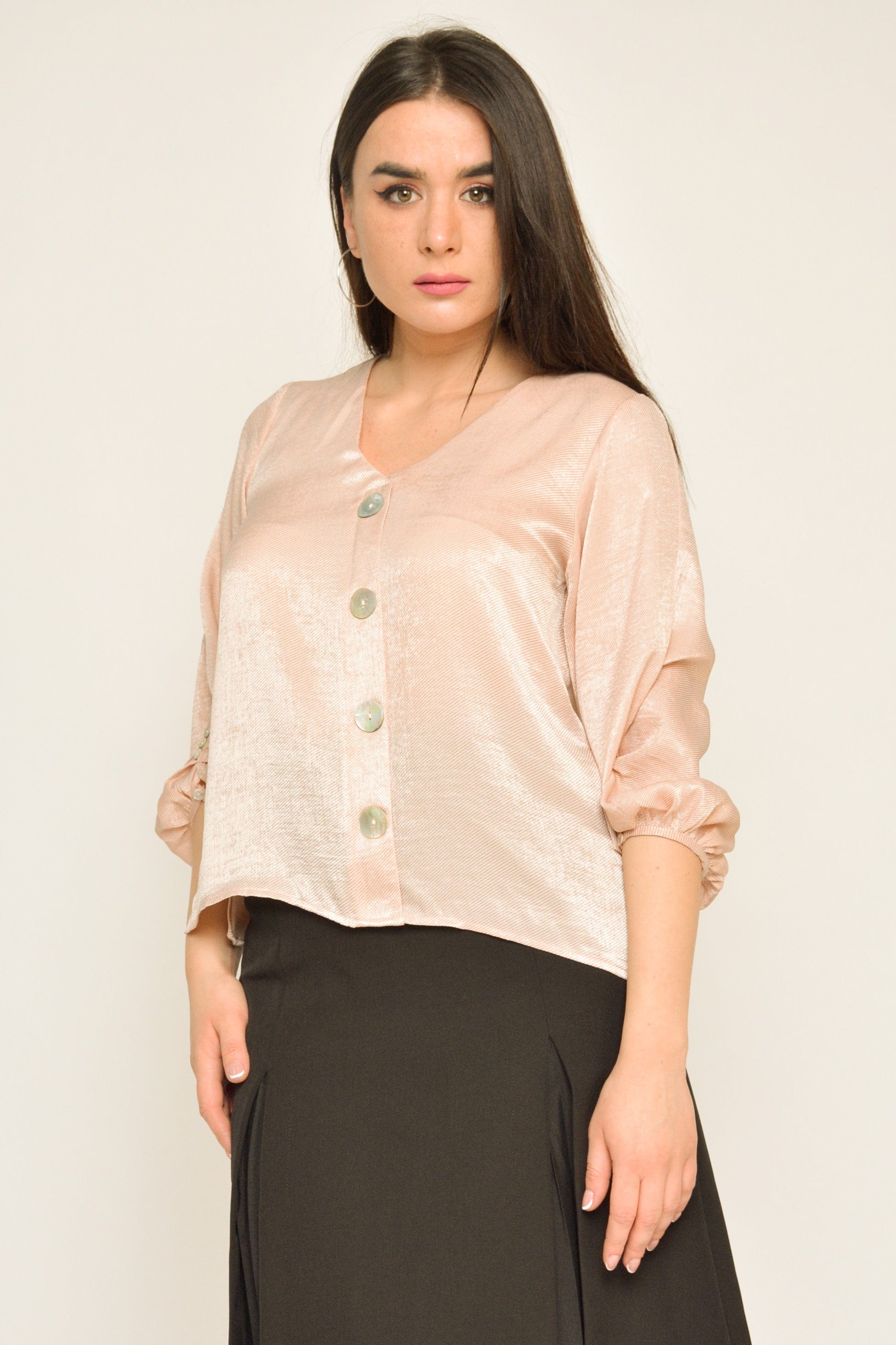 بلوزة بأزرار أمامية 3/4 كم منفوخ بأزرار نسائي